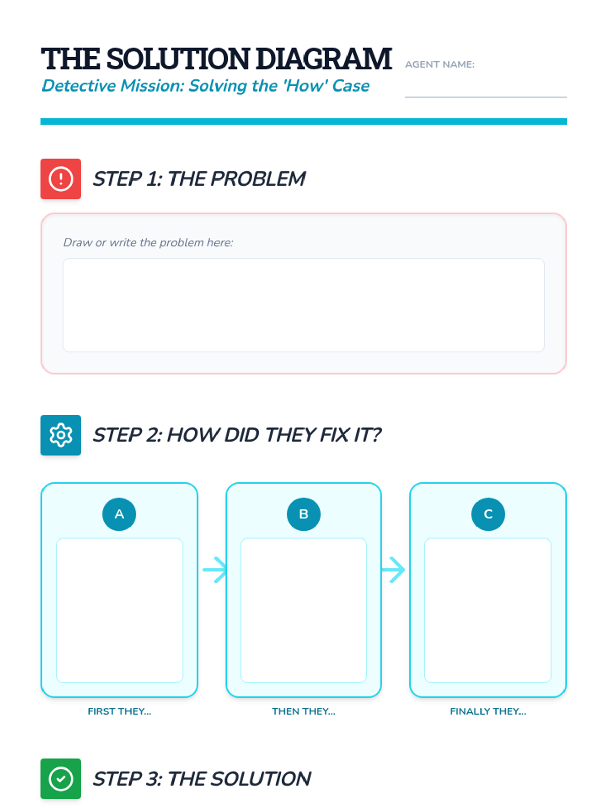 Students analyze how problems are solved in stories by asking 'How' and creating process diagrams.