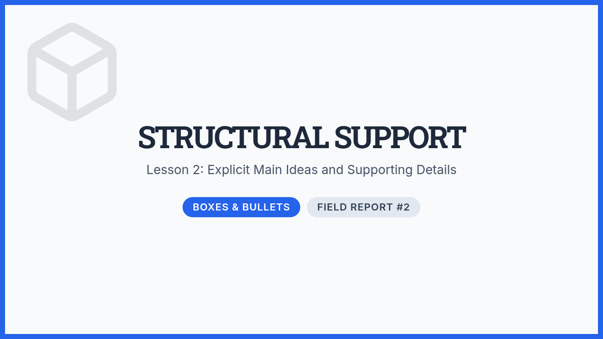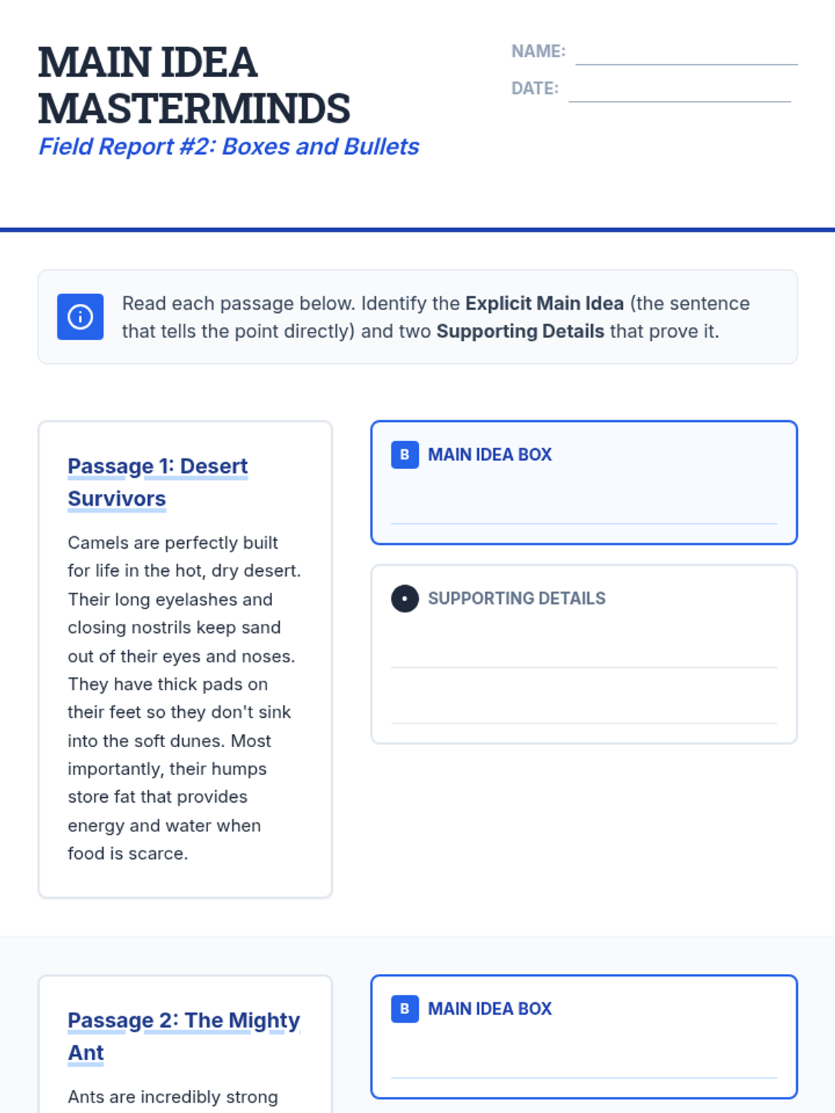 Using the 'Boxes and Bullets' visual, students identify explicit main ideas and the details that support them.
