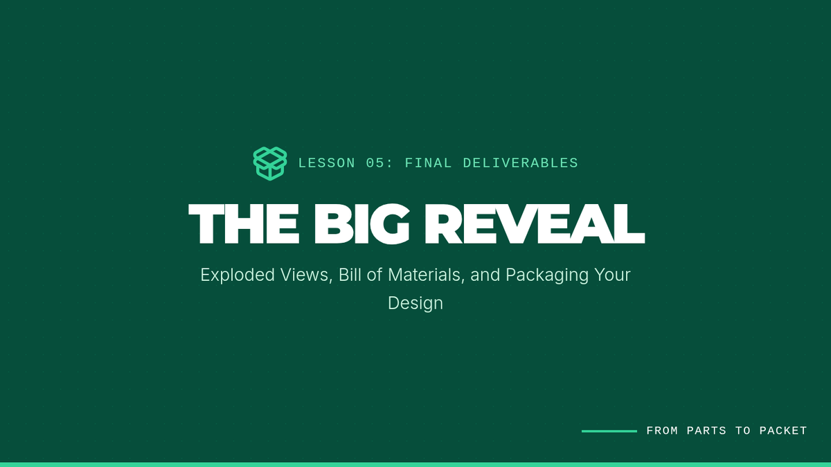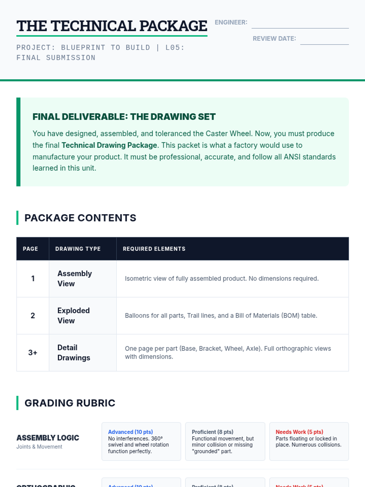 Students create an exploded view of their assembly to show how parts interact and generate an automated Bill of Materials (BOM). They compile their part drawings and assembly drawings into a final PDF packet.