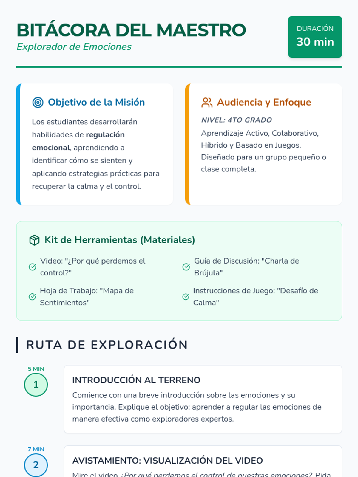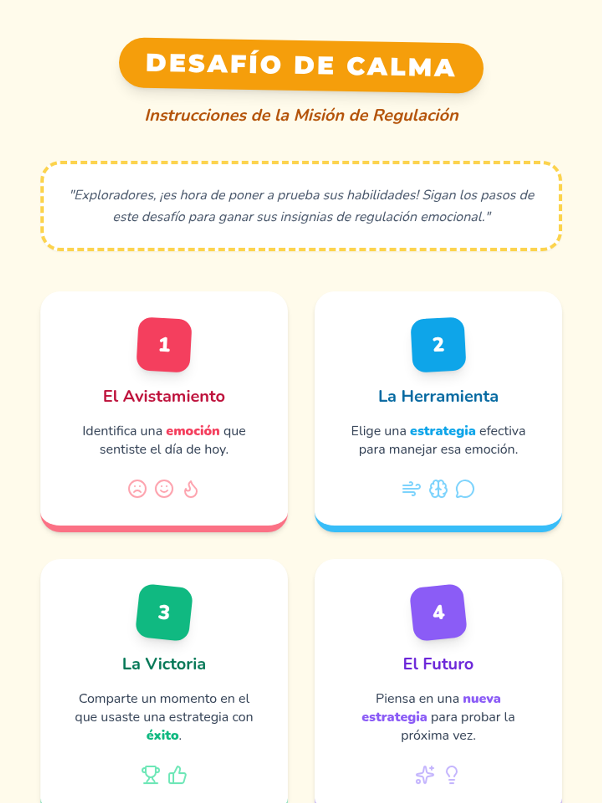 Esta lección ayuda a estudiantes de 4to grado a identificar y regular sus emociones mediante el uso de videos, discusiones grupales y actividades prácticas. Los estudiantes aprenderán estrategias concretas para mantener la calma y tomar mejores decisiones emocionales.