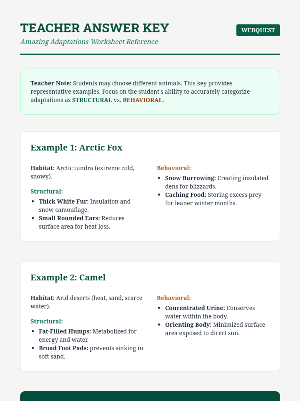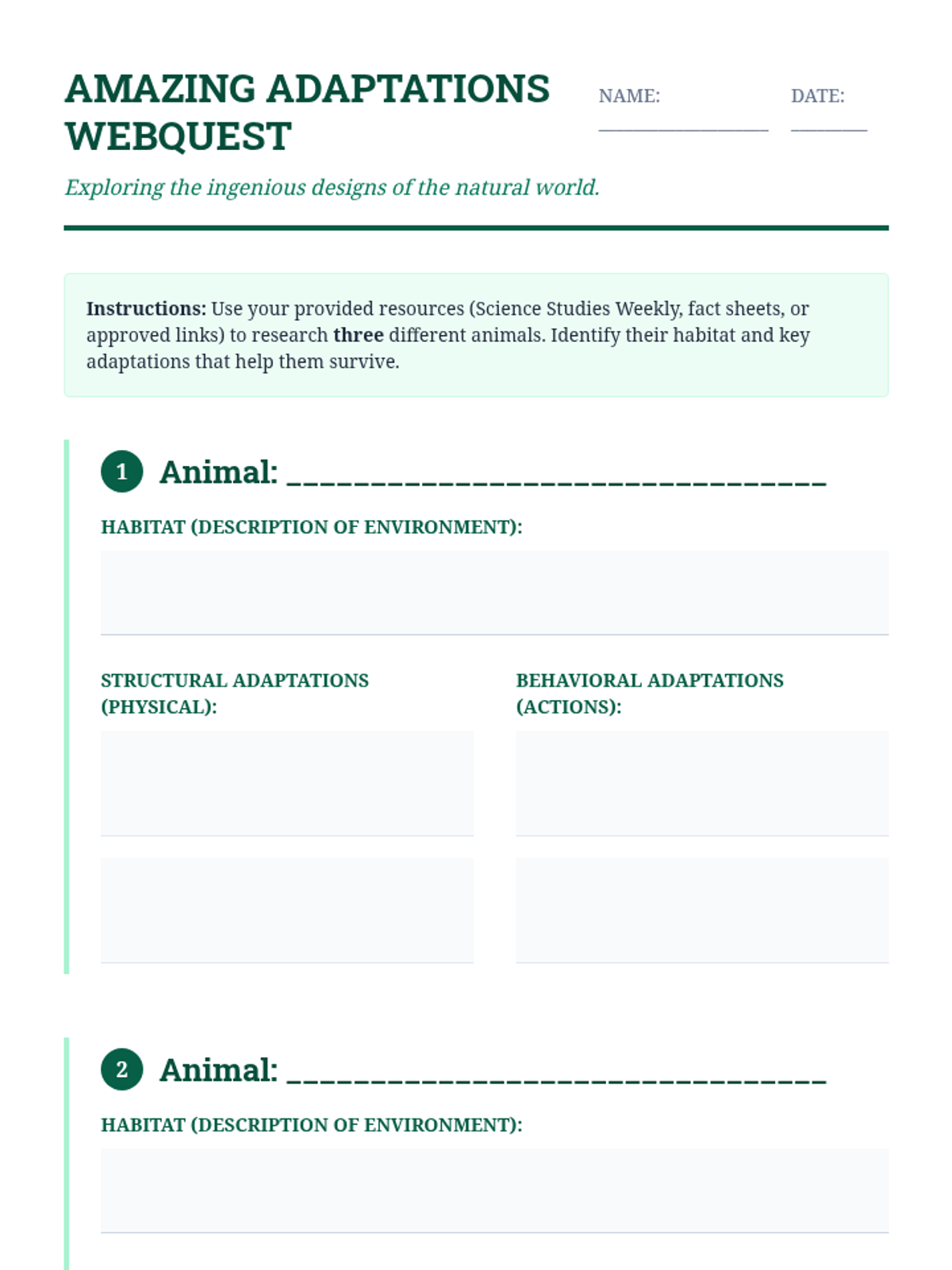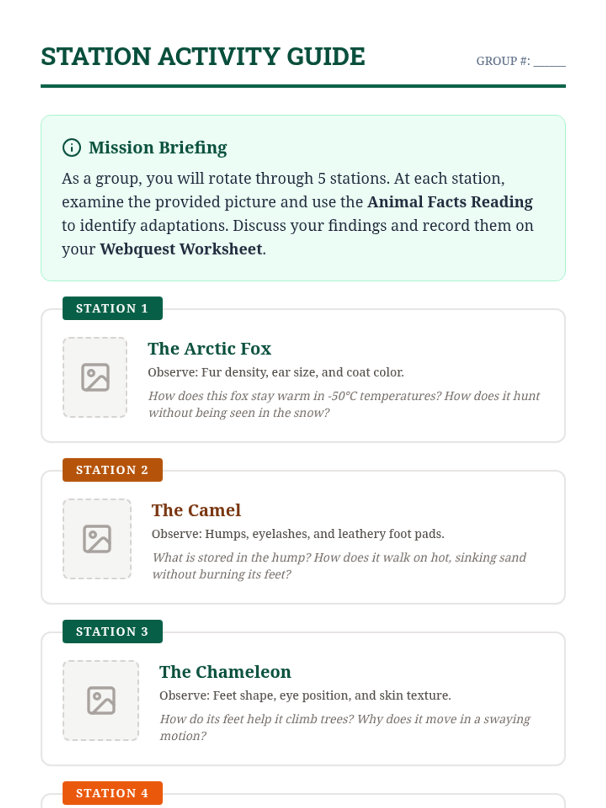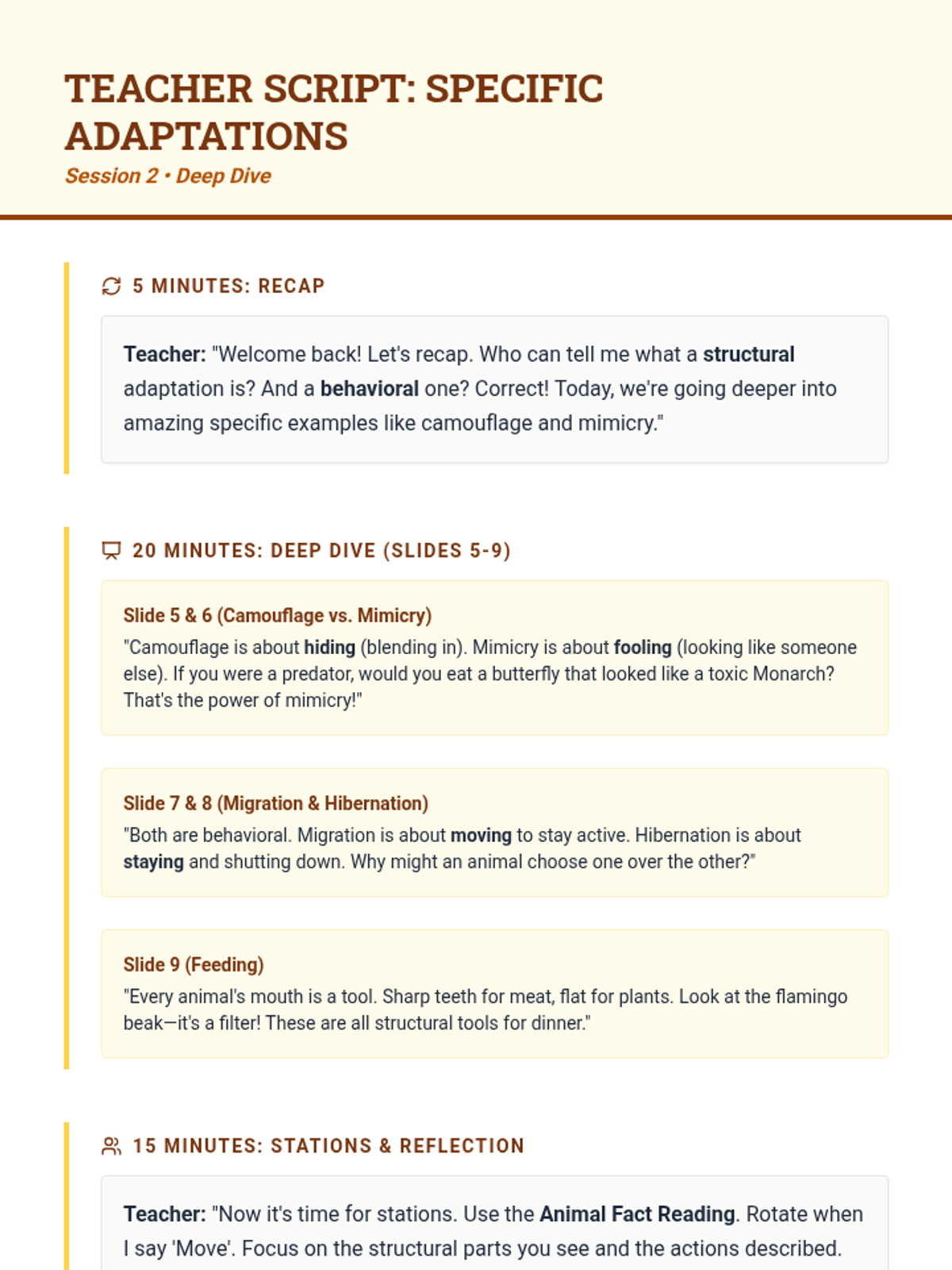 Students conduct independent research and participate in a station-based activity to explore complex adaptations like mimicry and migration in depth.