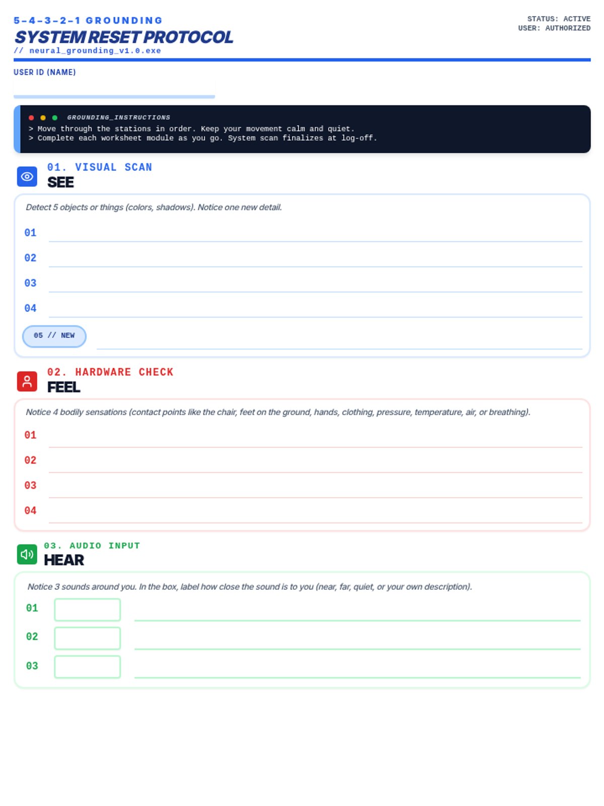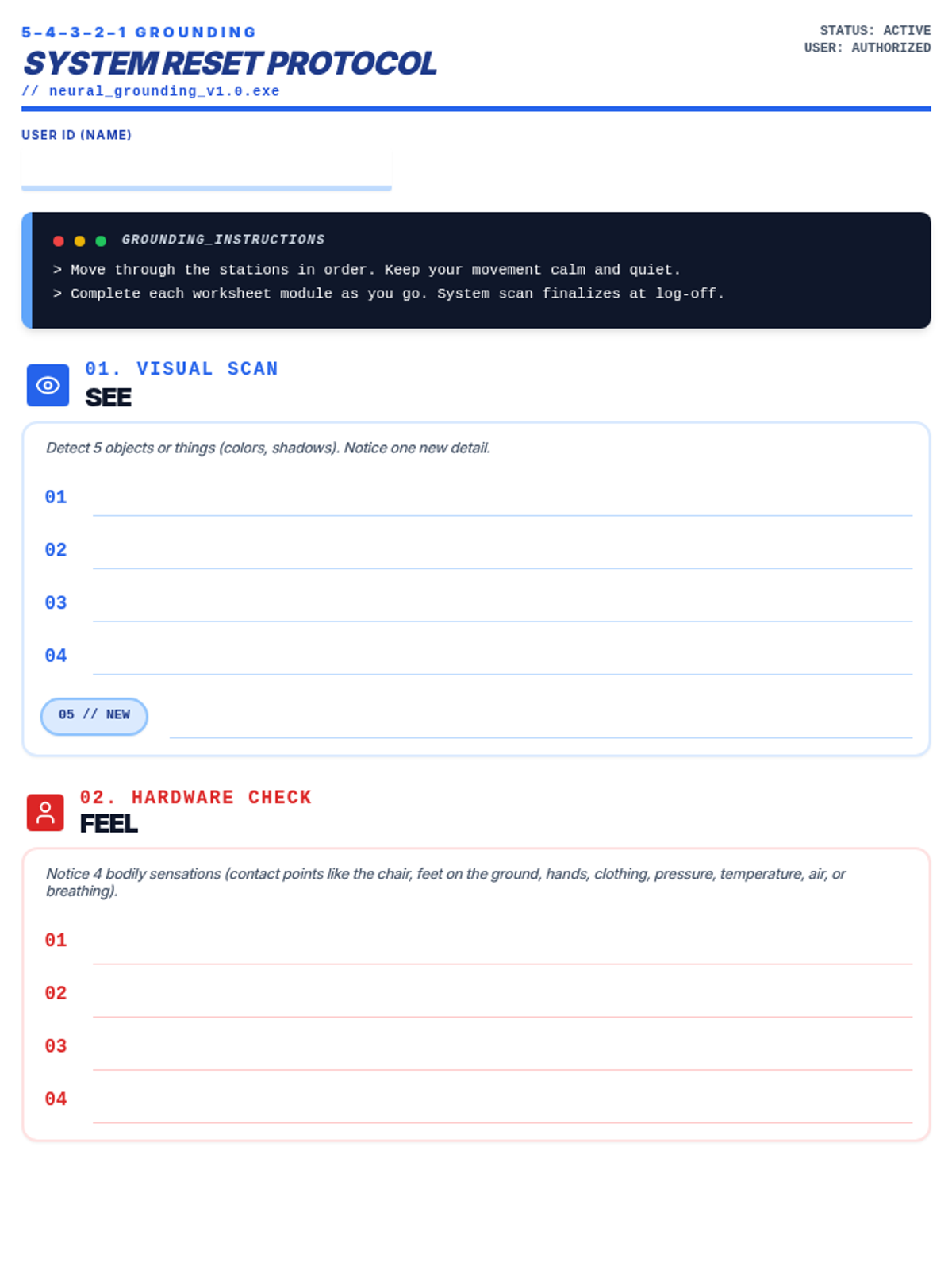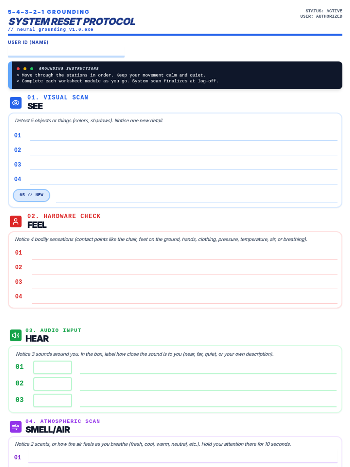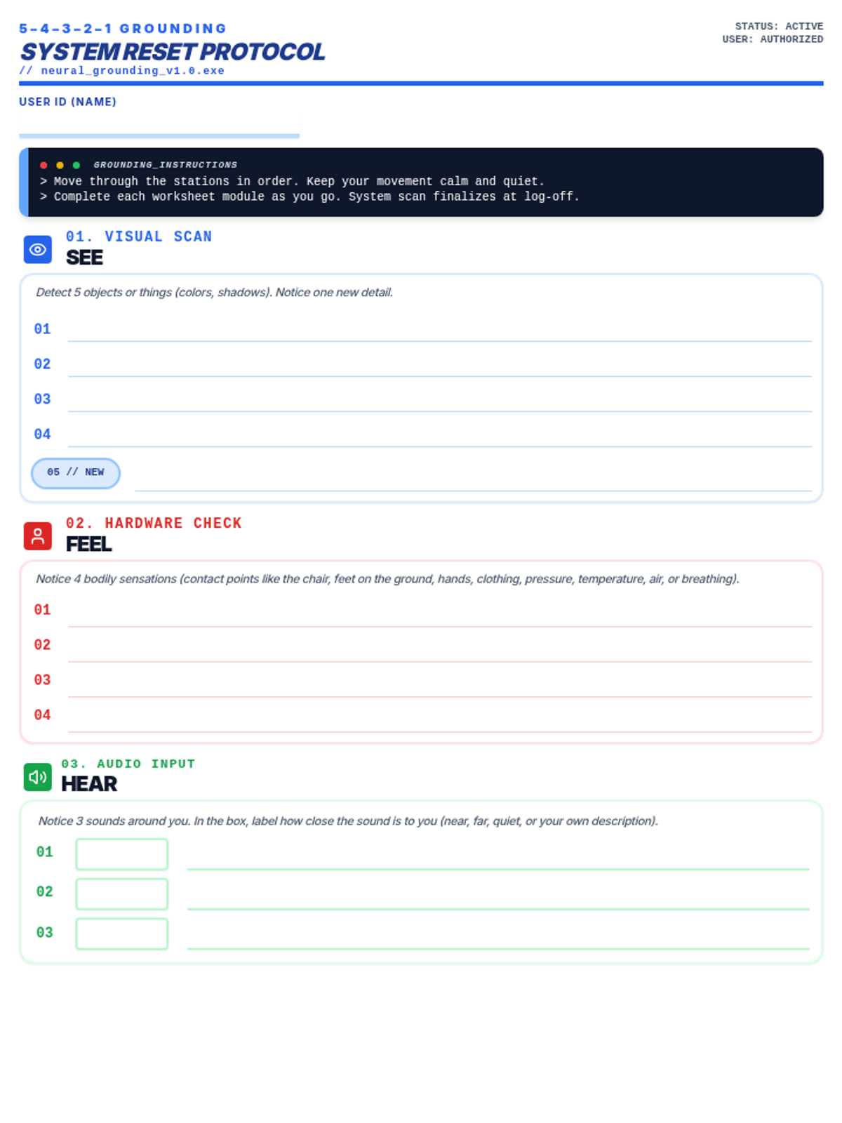 A lesson teaching students how to use the 5-4-3-2-1 grounding technique to manage stress and anxiety, framed through a technical 'system reset' metaphor. Students learn to recognize the 'spinning' state of anxiety and intercept it using sensory inputs.
