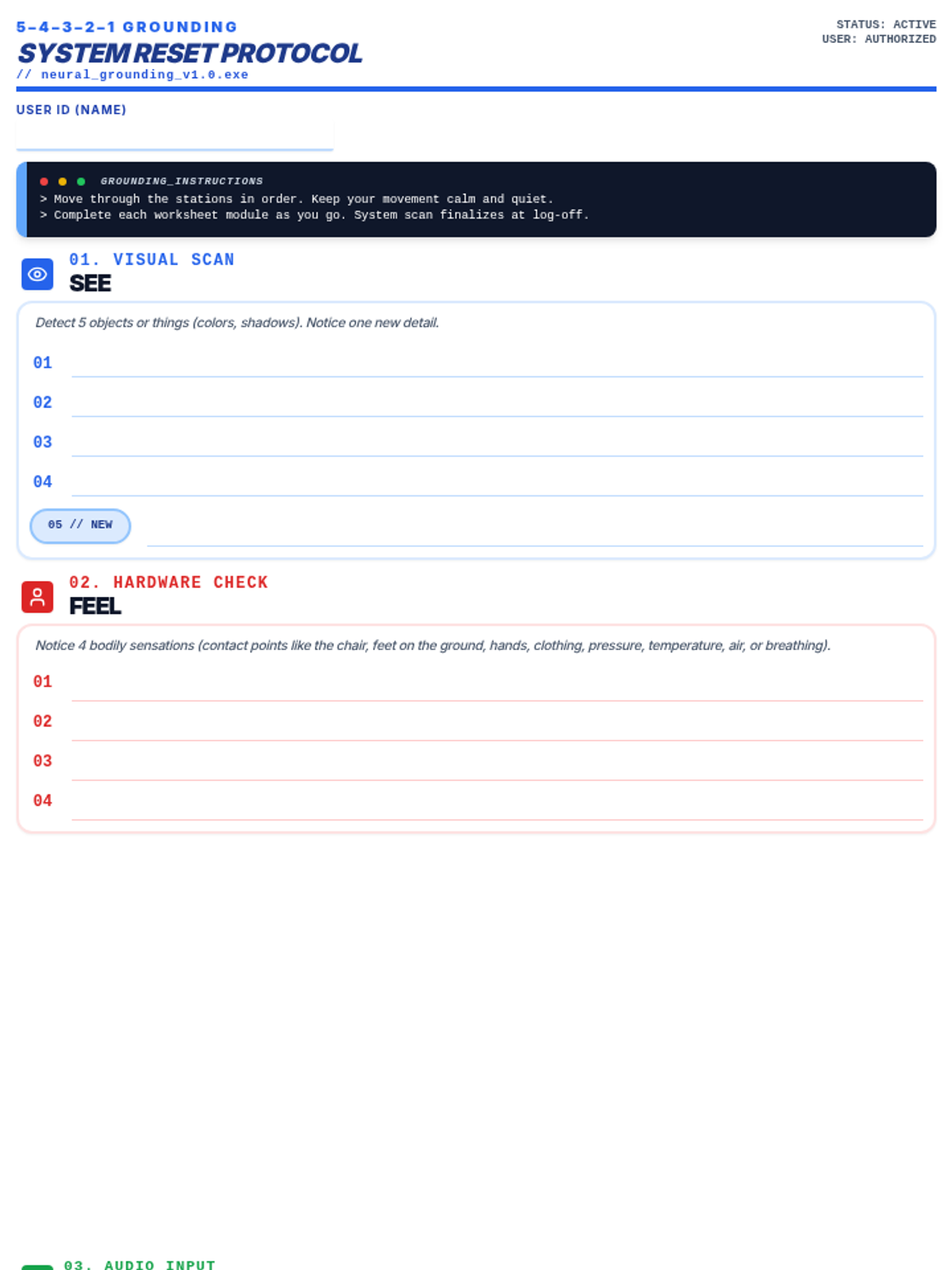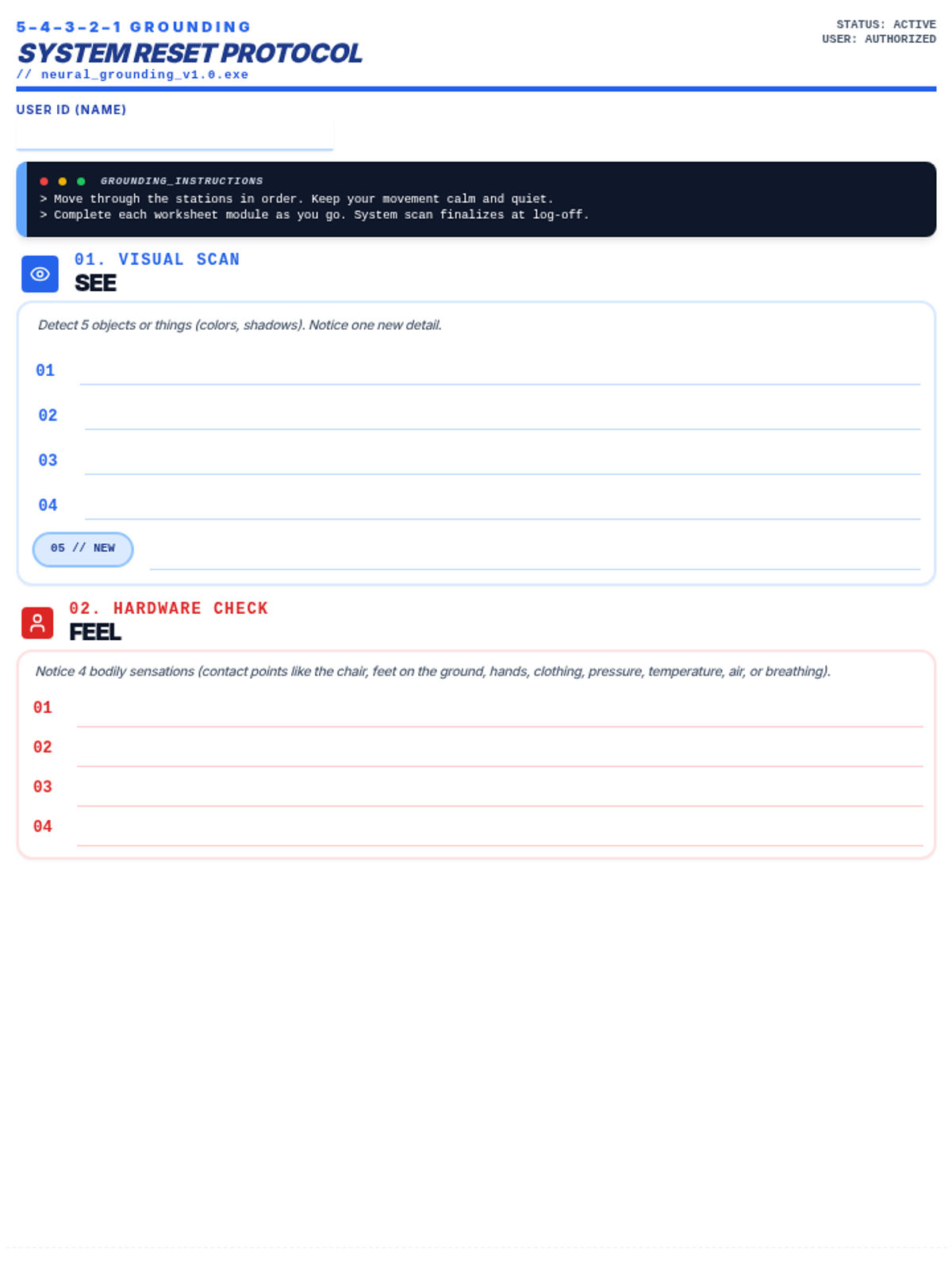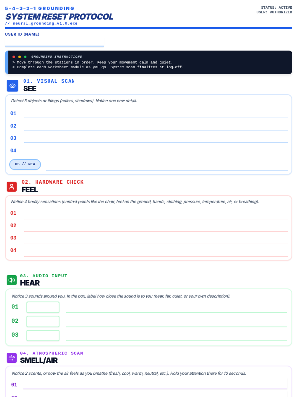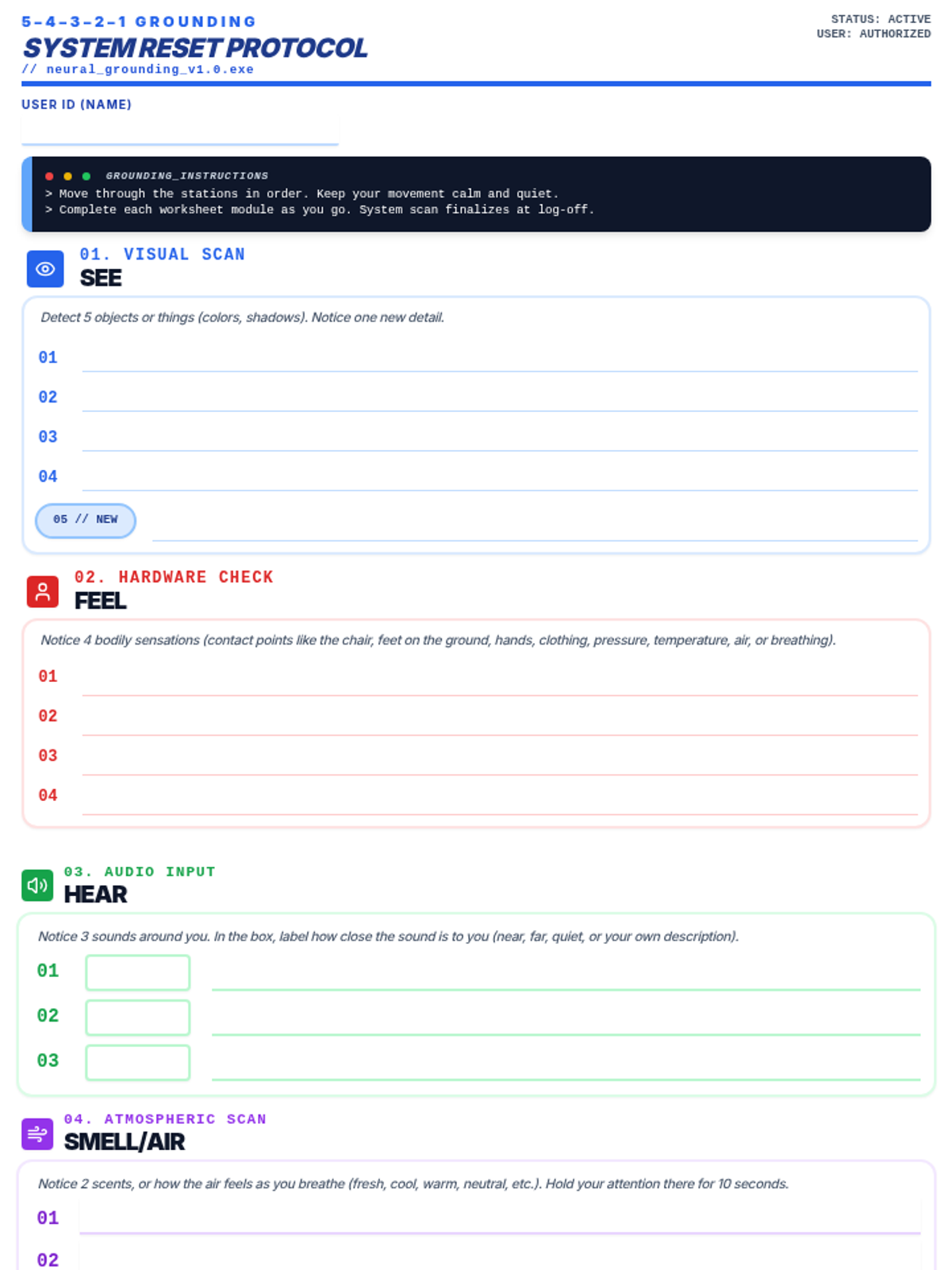 A lesson teaching students how to use the 5-4-3-2-1 grounding technique to manage stress and anxiety, framed through a technical 'system reset' metaphor. Students learn to recognize the 'spinning' state of anxiety and intercept it using sensory inputs.