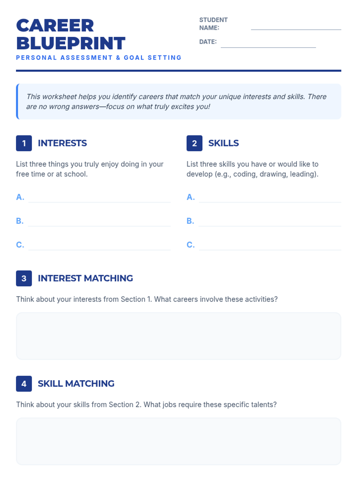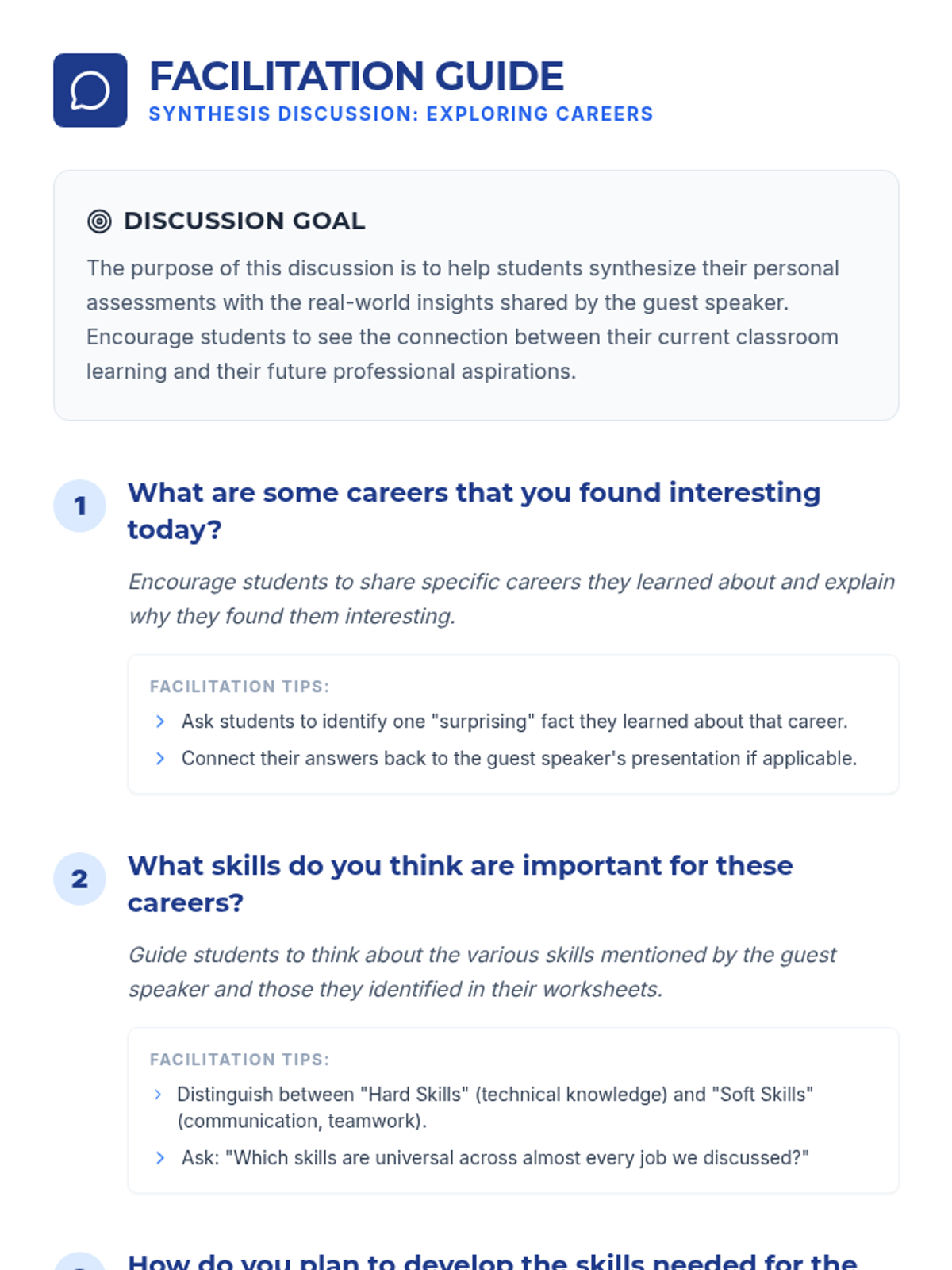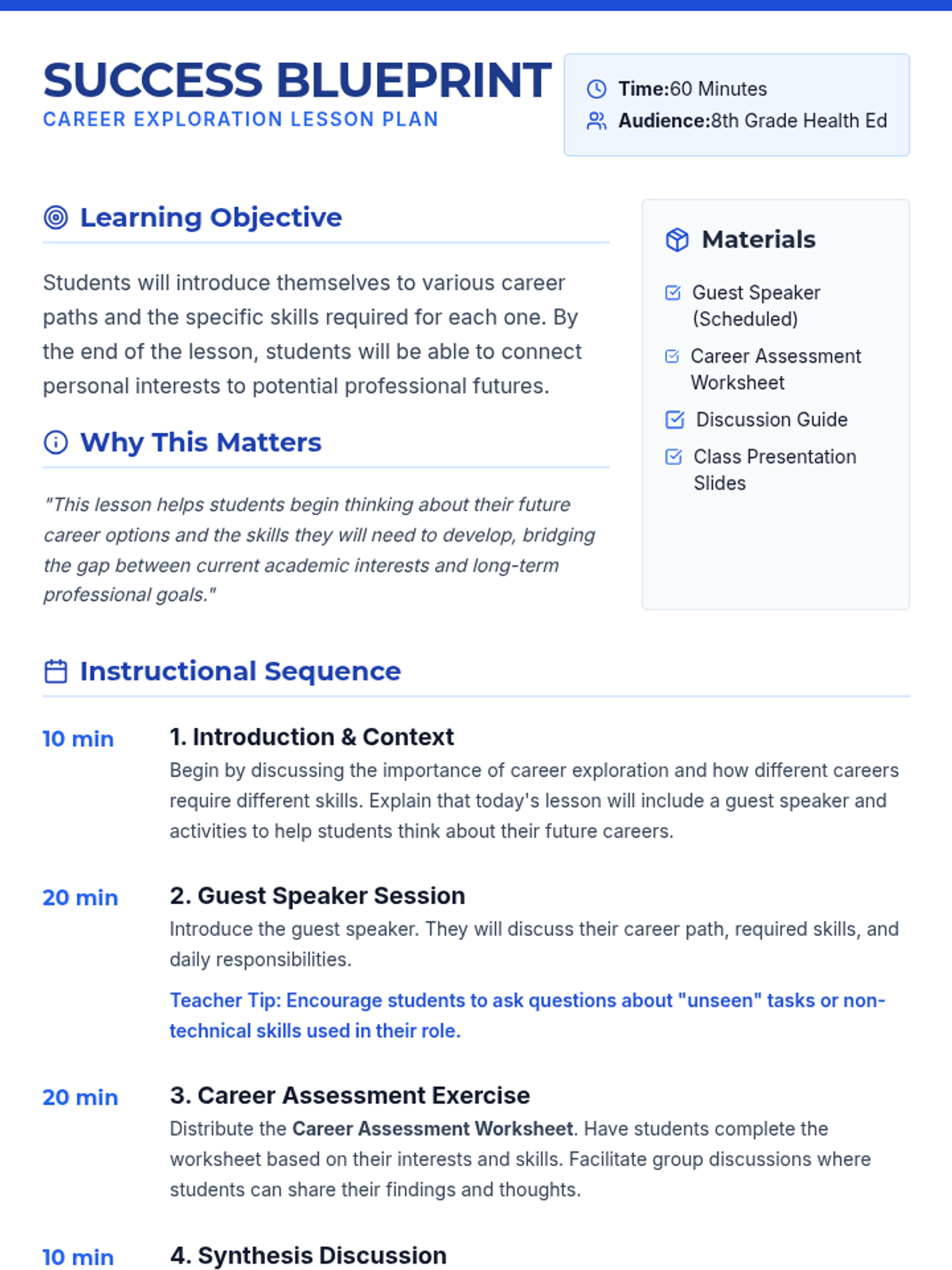 An introductory lesson for eighth graders to explore various career paths, identify personal interests and skills, and hear from a guest speaker about real-world job responsibilities.