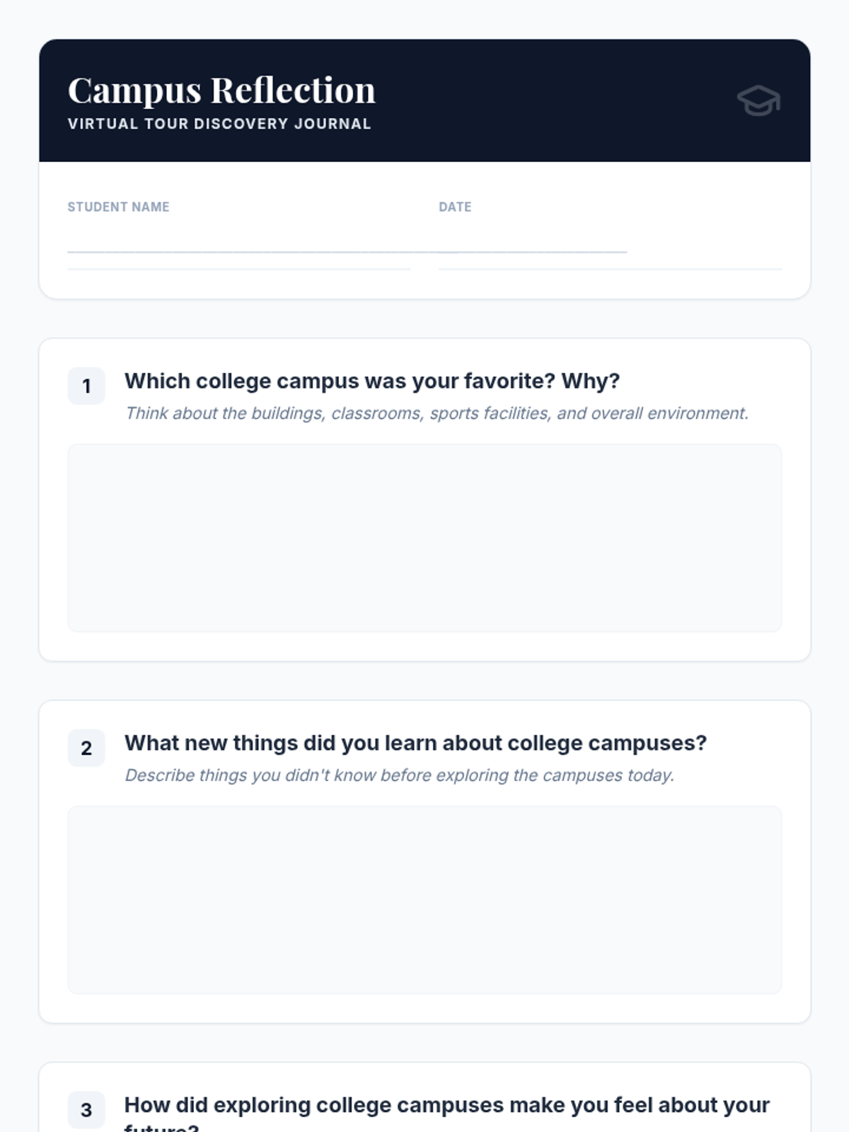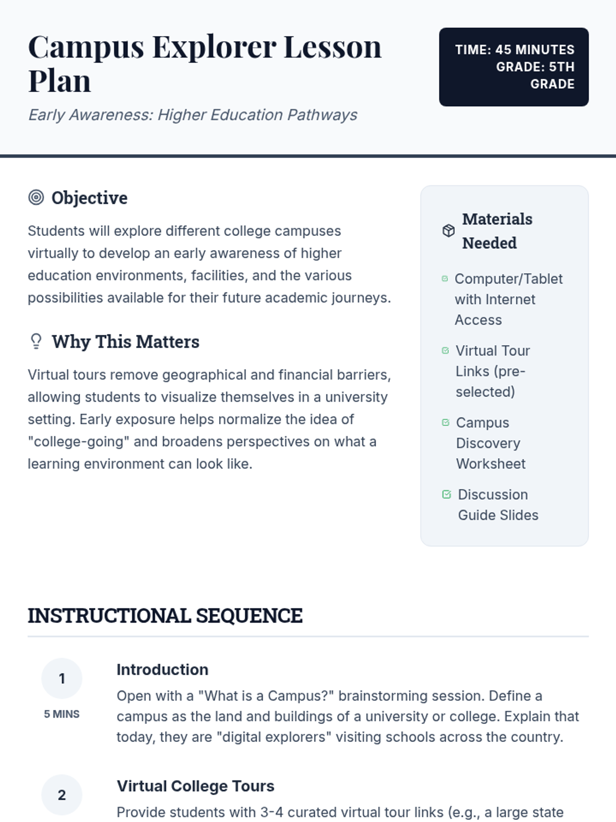 Students will take a virtual tour of various college campuses to explore different environments and facilities. This lesson is crucial as it helps students develop early awareness and interest in higher education, broadening their perspective on future possibilities.