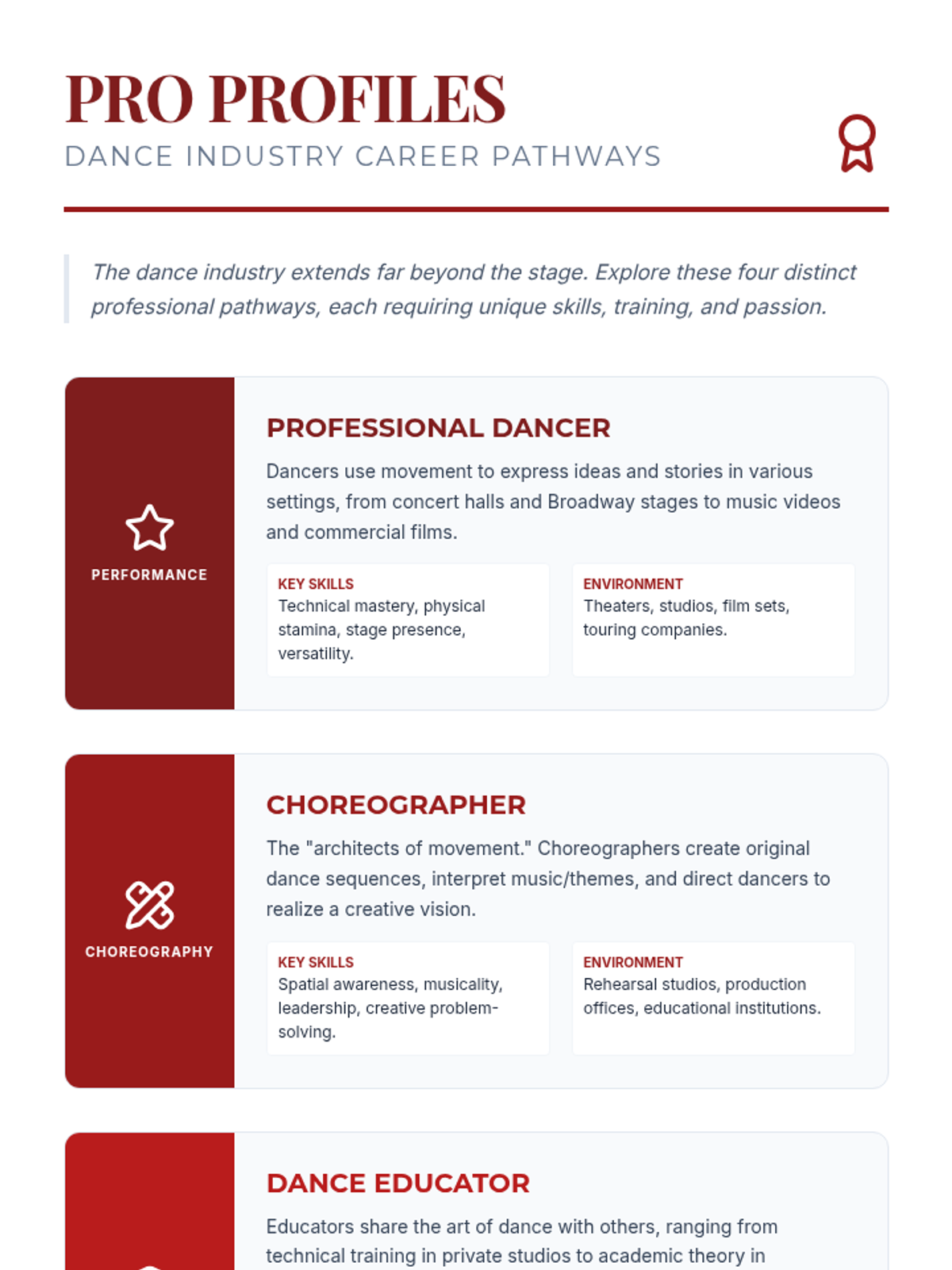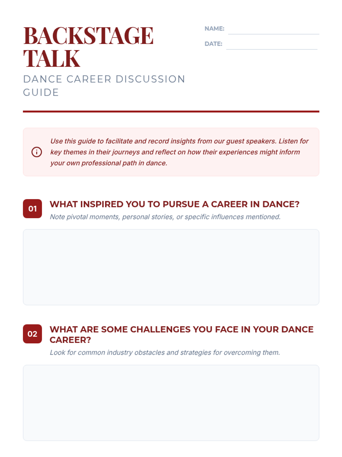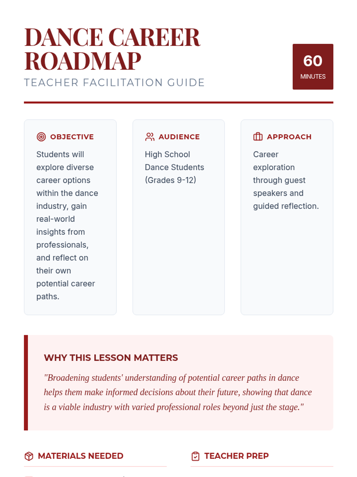 A comprehensive lesson for high school students to explore diverse career paths in the dance industry through guest speaker insights and reflective discussion.
