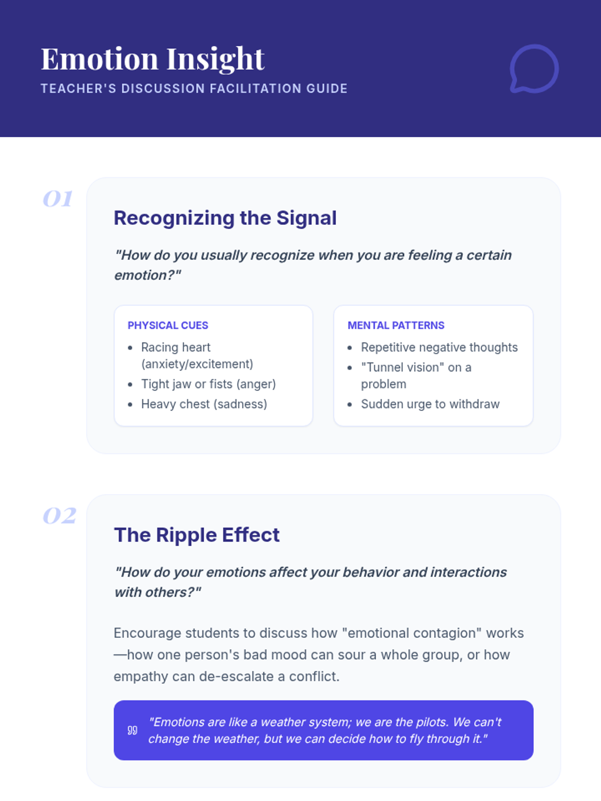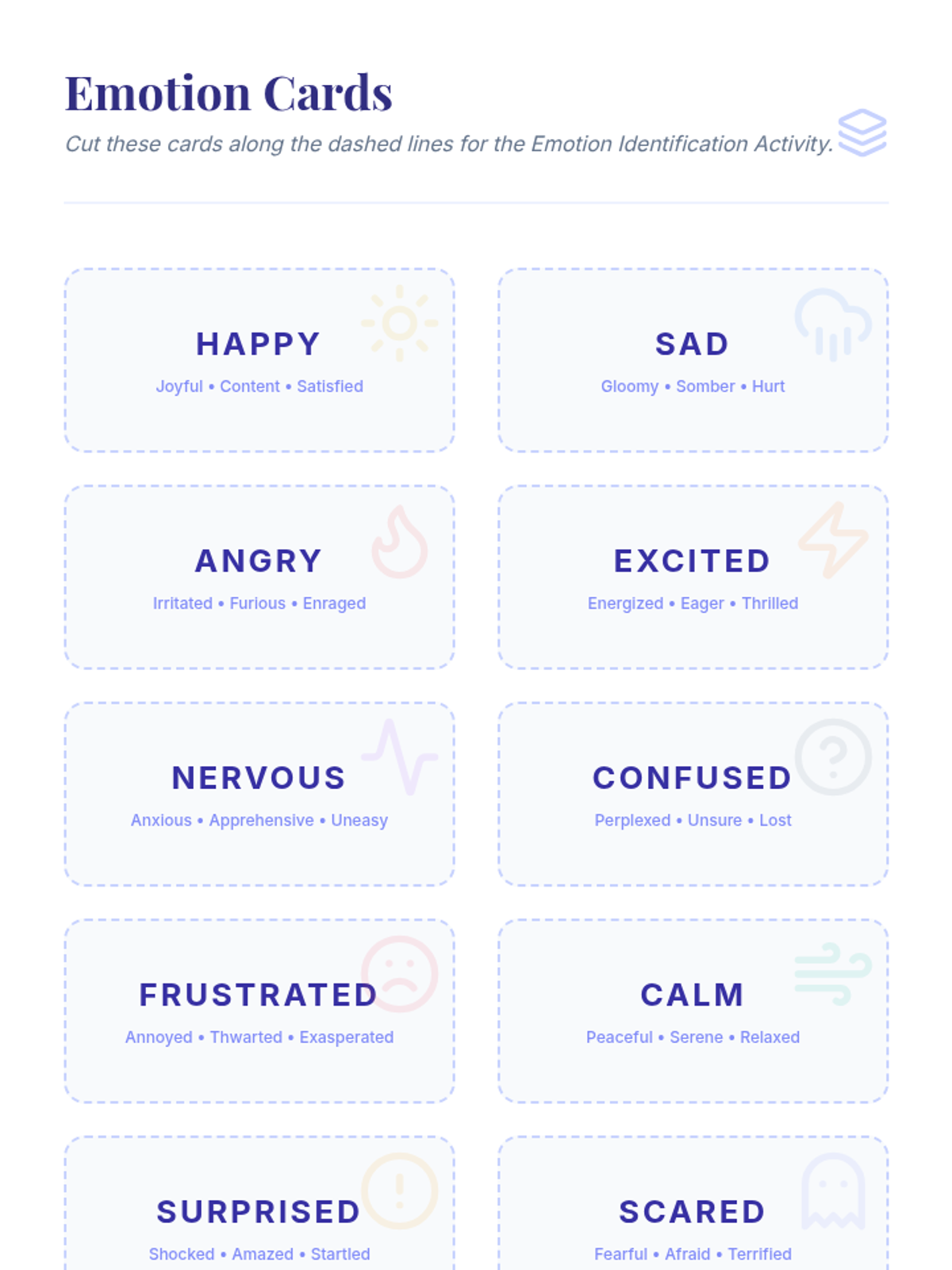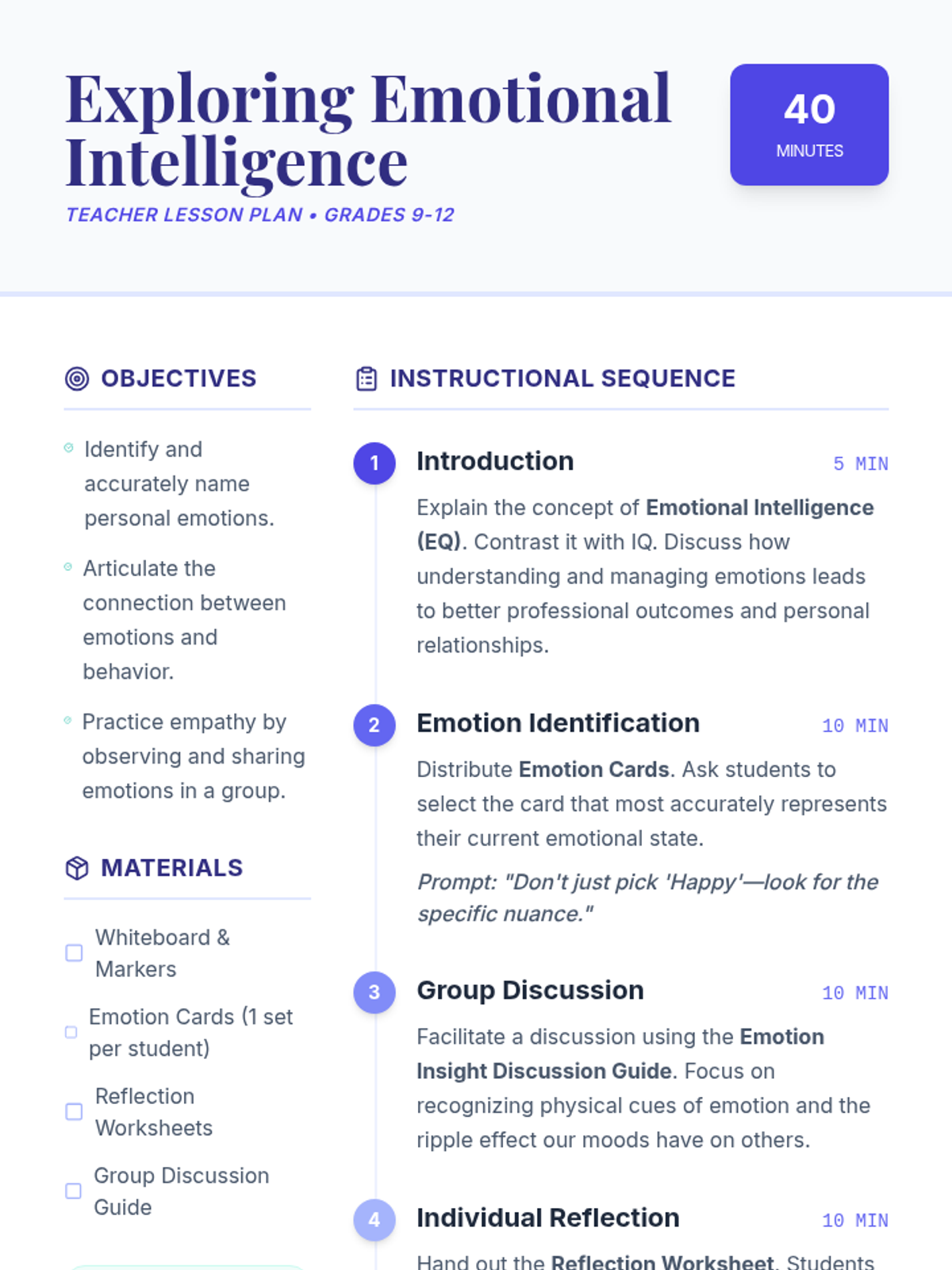 A comprehensive lesson designed for high school students to explore self-awareness and empathy by identifying, articulating, and managing emotions. Students engage in interactive card activities and reflective writing to build core emotional intelligence skills.