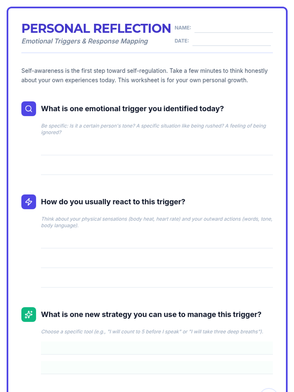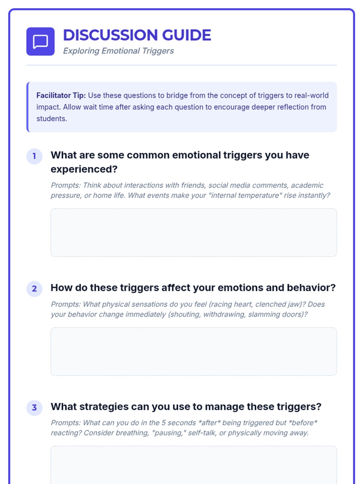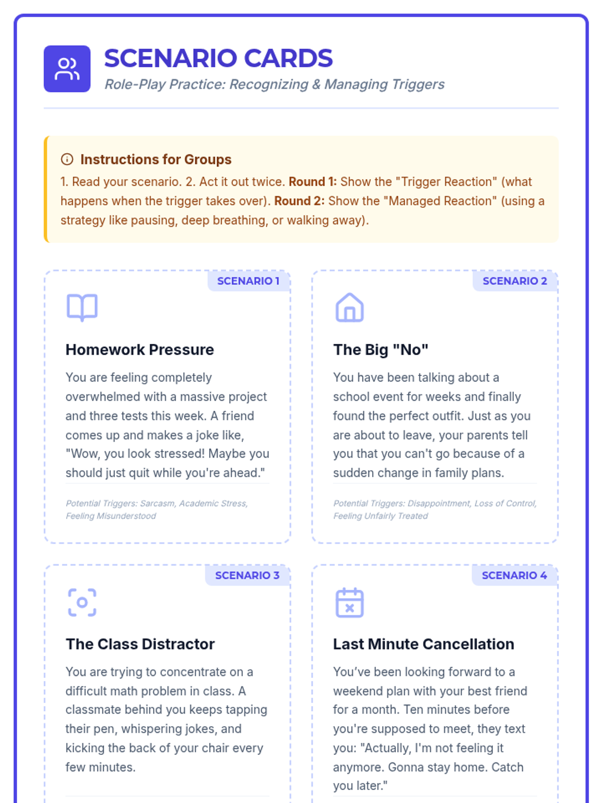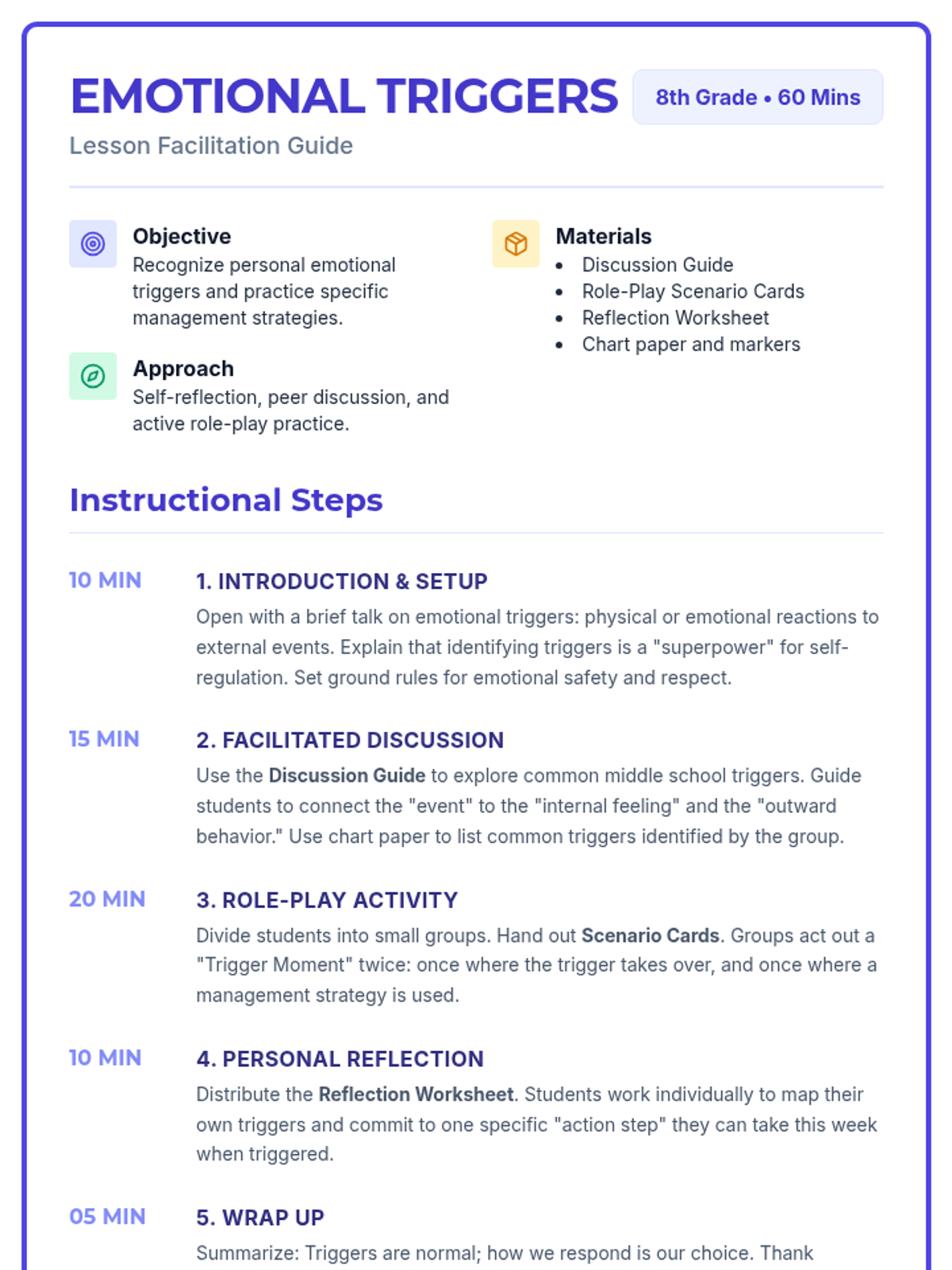 A lesson for 8th-grade students to identify personal emotional triggers and practice healthy coping strategies through discussion and role-play.