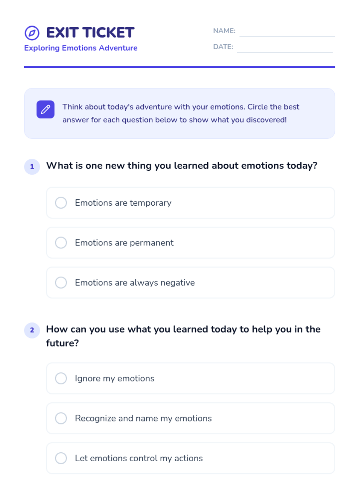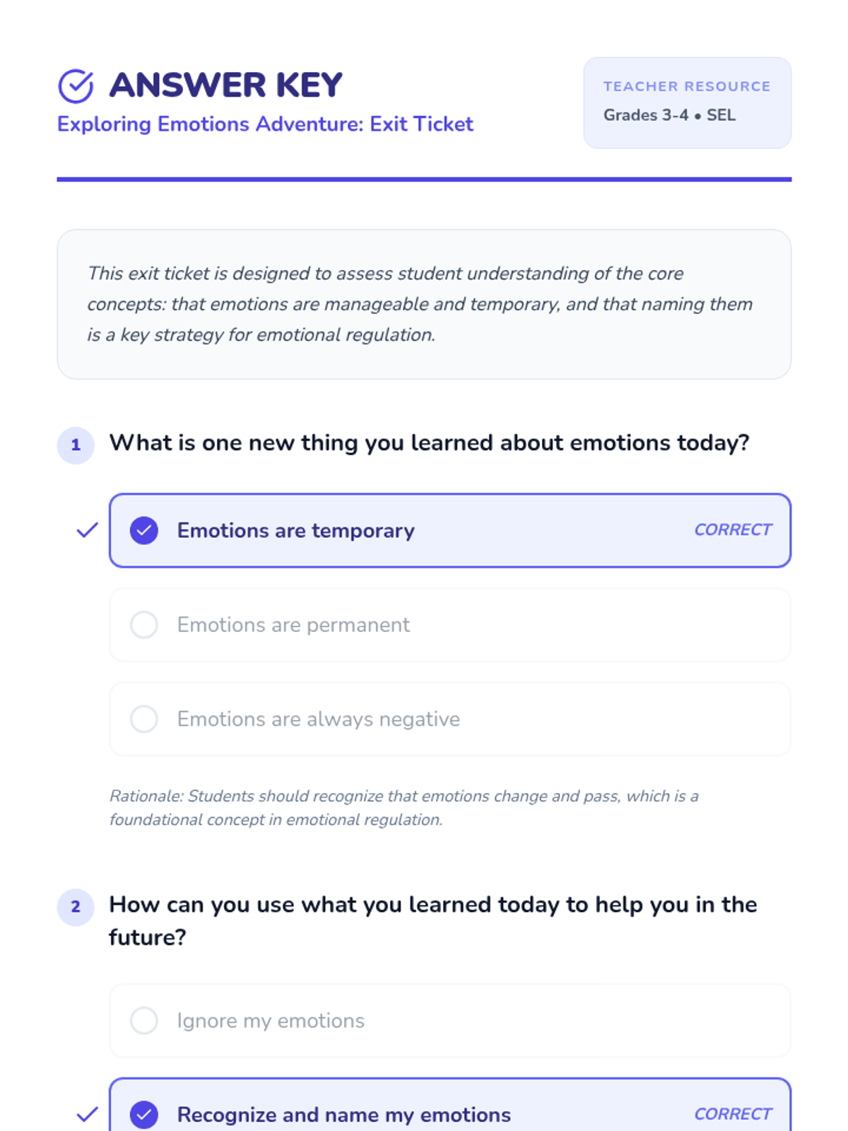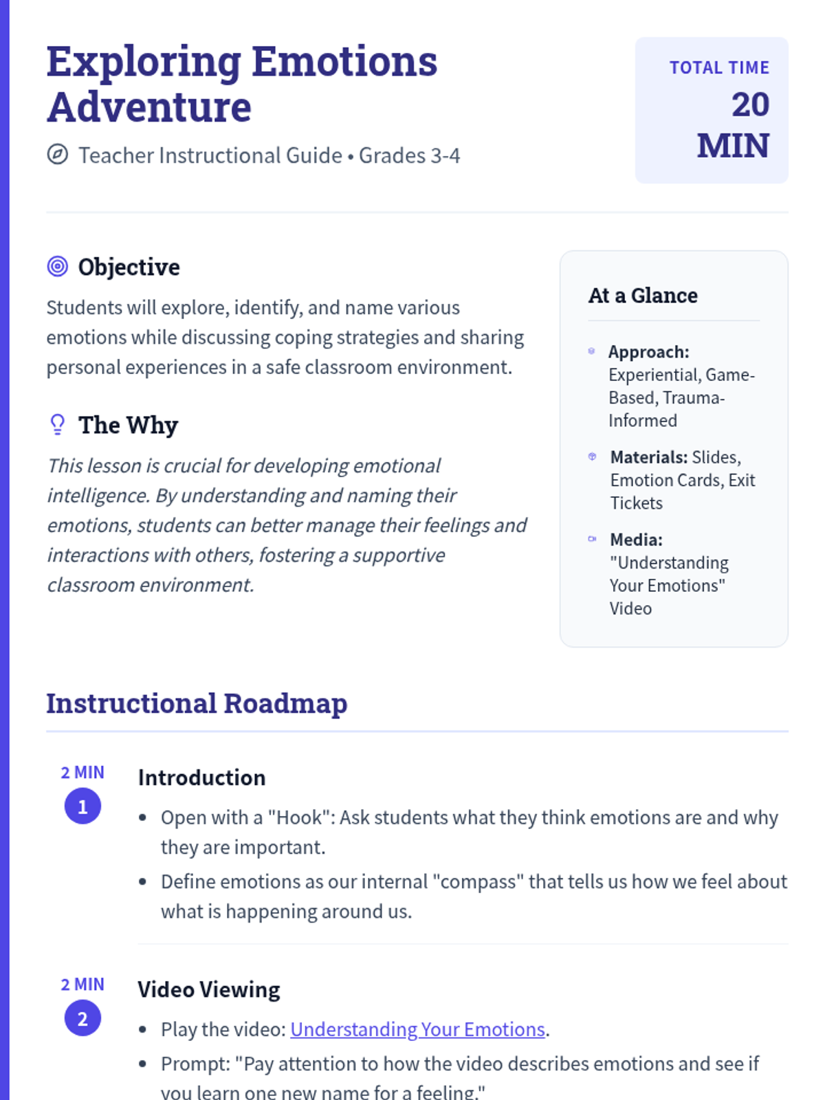 This lesson introduces students to the concept of emotions through an engaging video, interactive activities, and a reflective exit ticket. By understanding and naming their emotions, students can better manage their feelings and interactions with others. This lesson is crucial for developing emotional intelligence and fostering a supportive classroom environment.