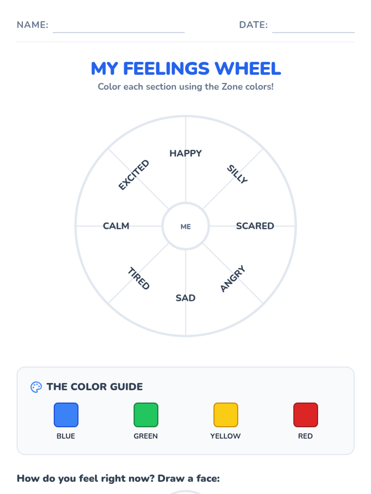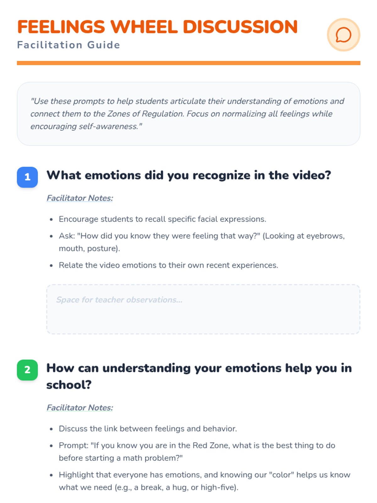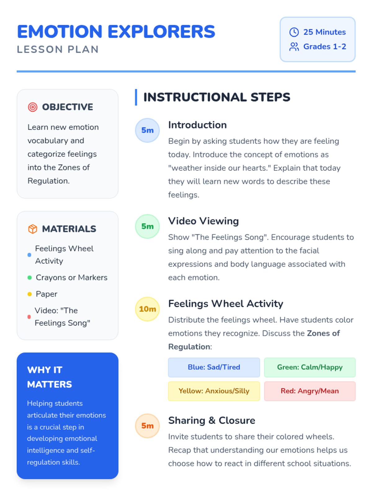 A 25-minute lesson for 1st and 2nd grade students to expand their emotional vocabulary using a feelings wheel and connect emotions to the Zones of Regulation. Students will watch an engaging video, identify emotions, and discuss how understanding feelings helps them navigate school life.