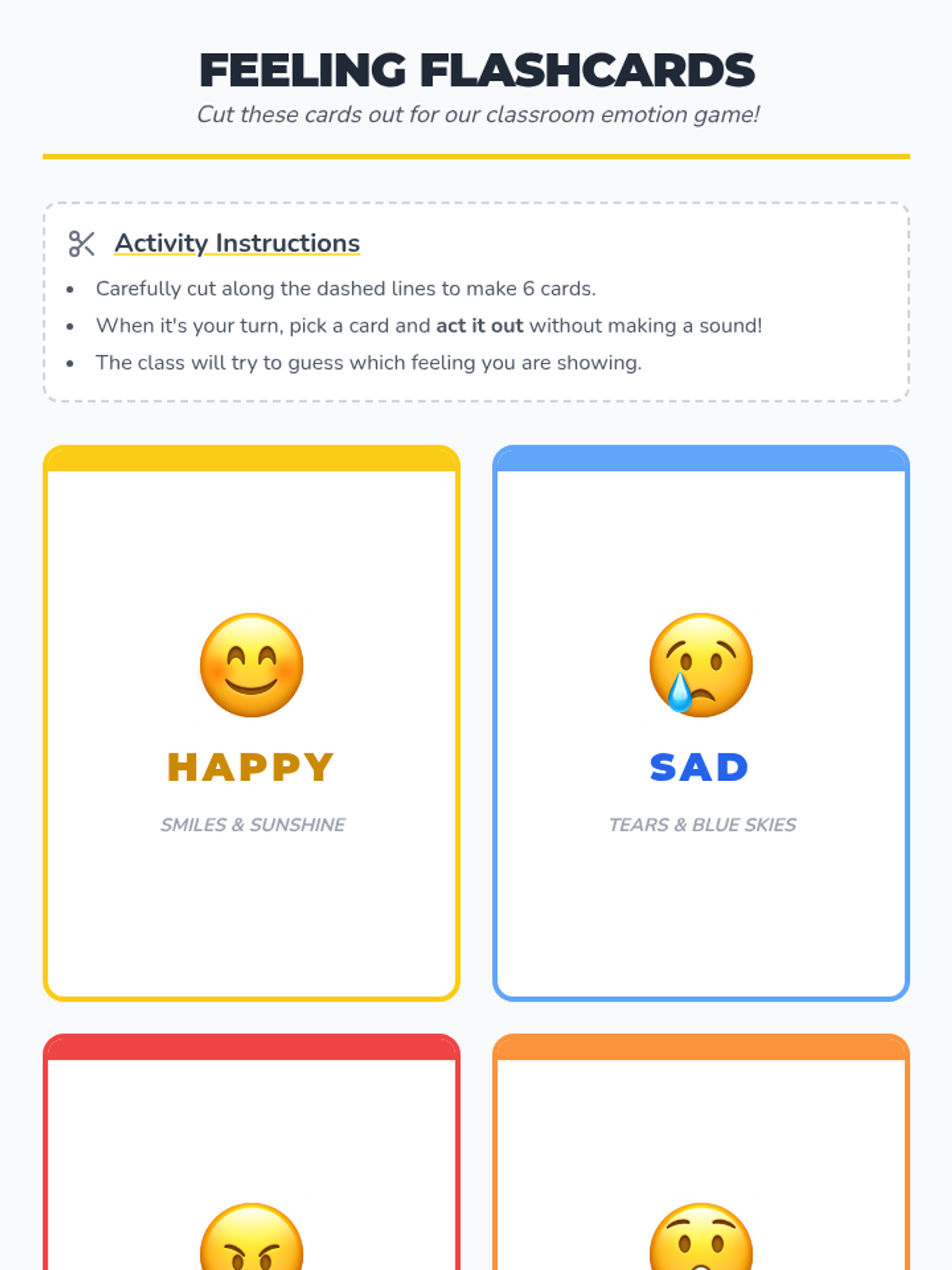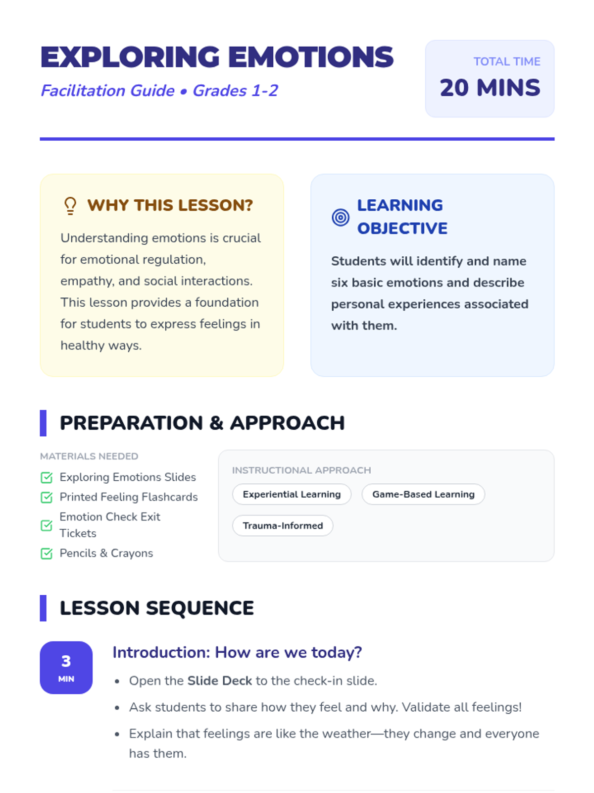 A foundational lesson for young learners to identify, understand, and express basic emotions using interactive games and visual media.