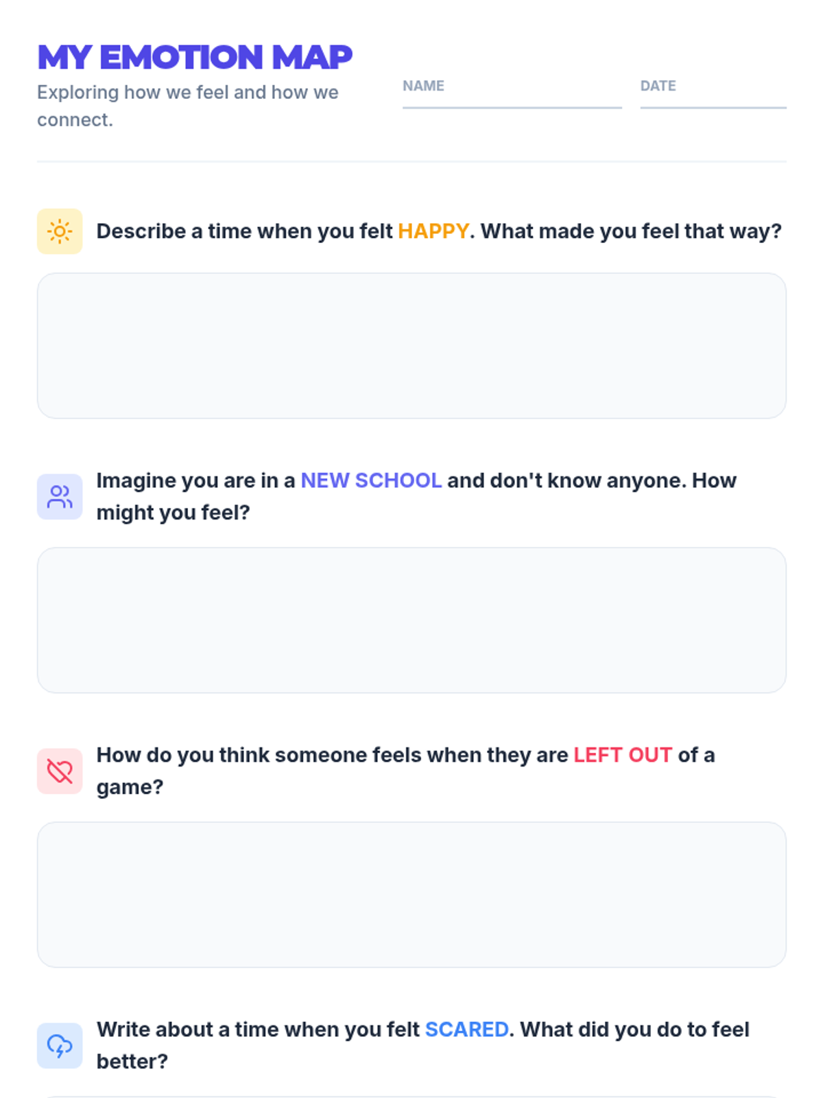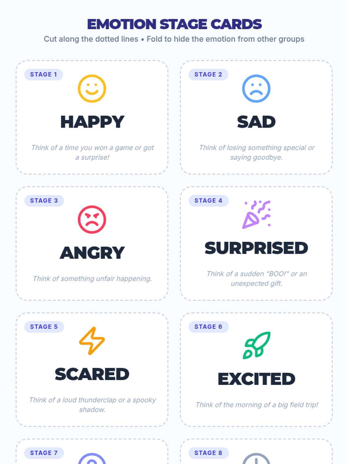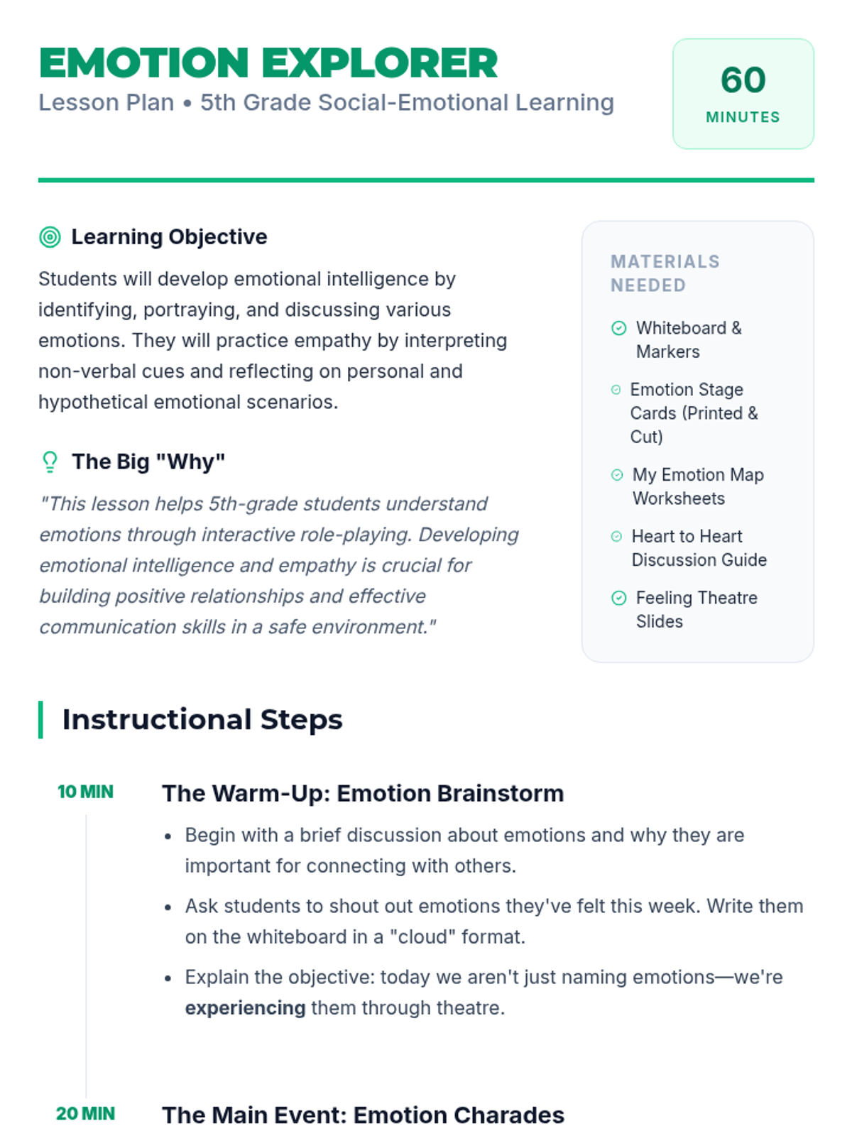 A high-energy, interactive lesson for 5th graders to explore and identify emotions through role-play and reflection, building empathy and emotional intelligence.