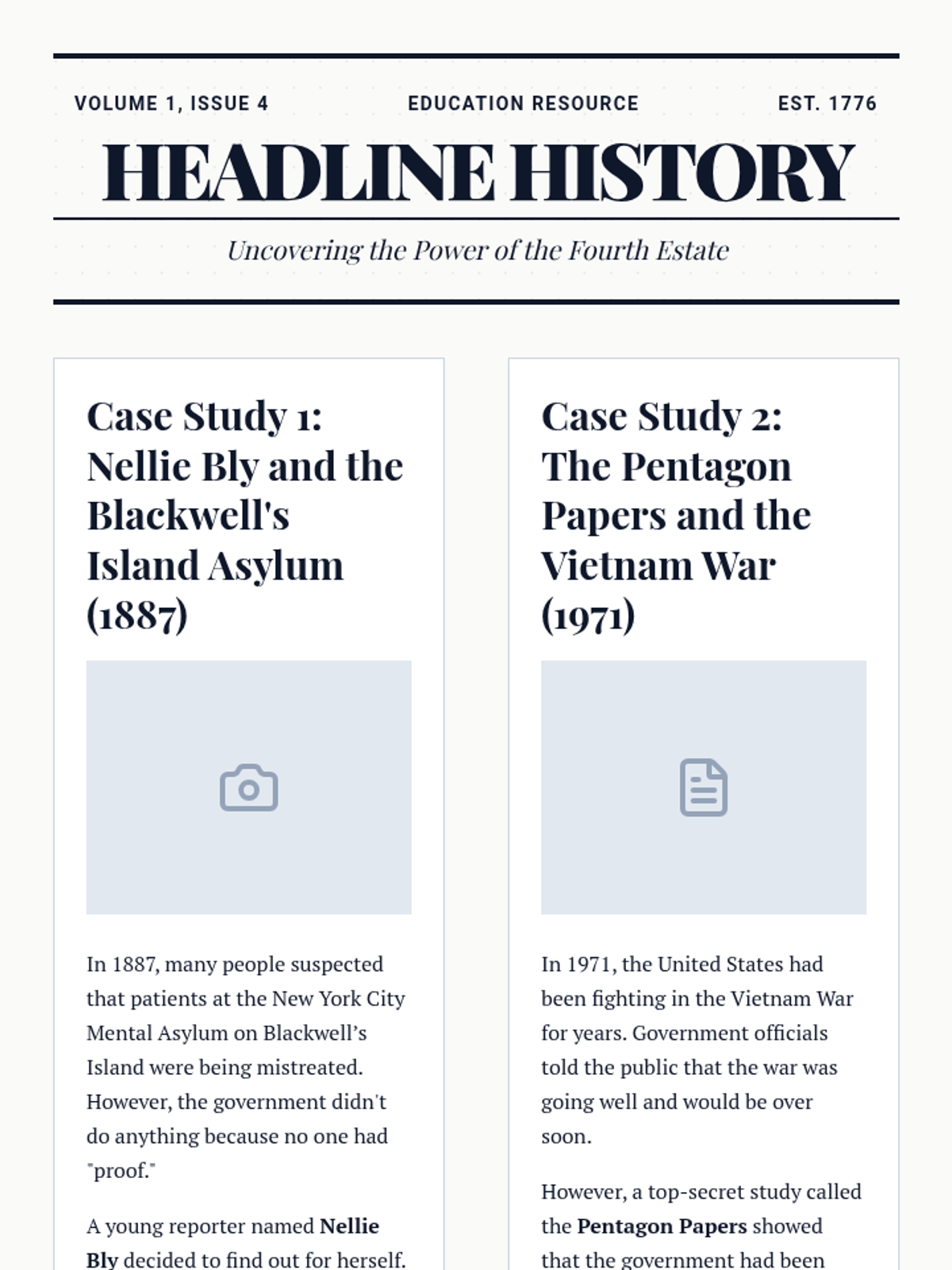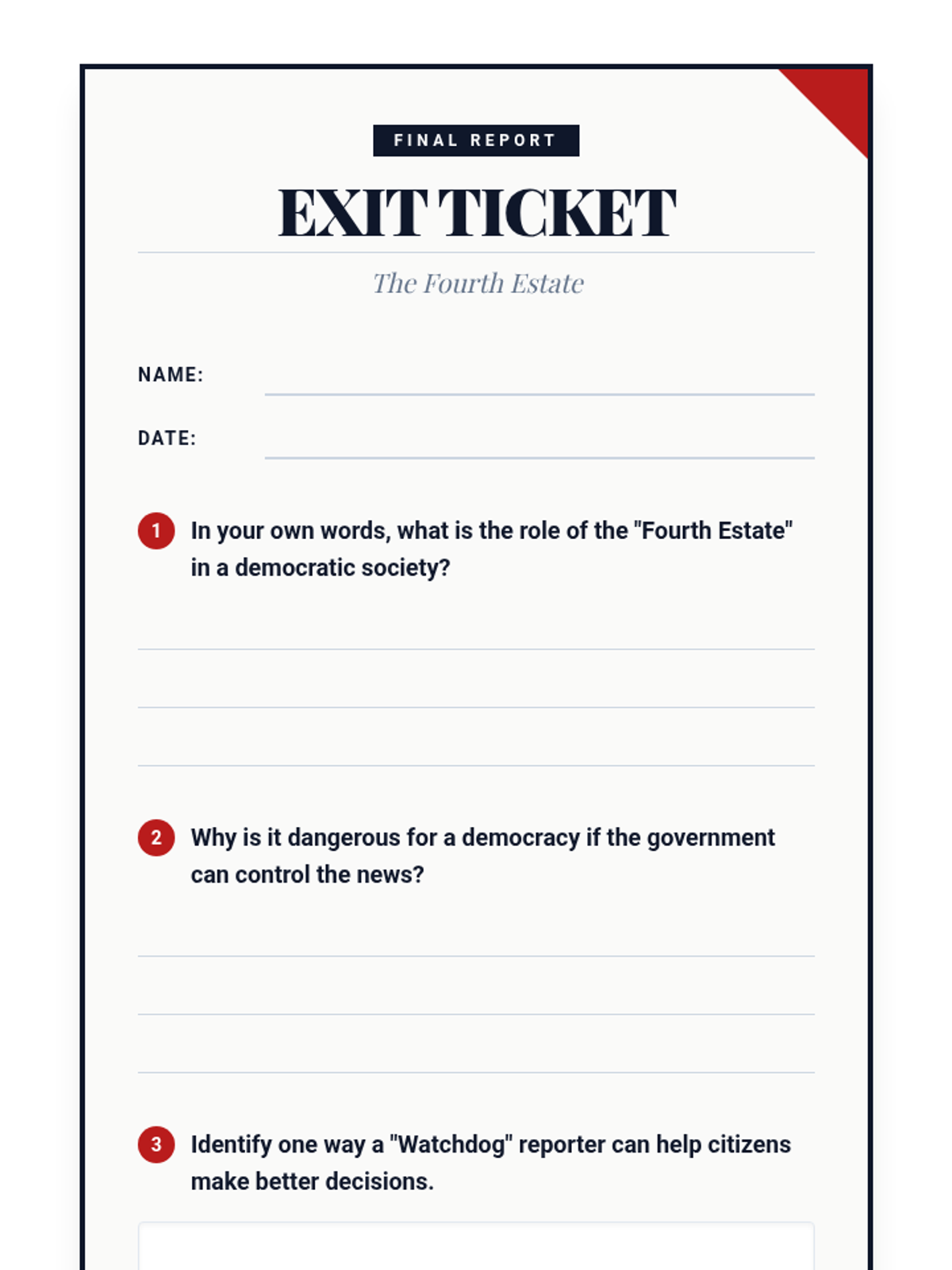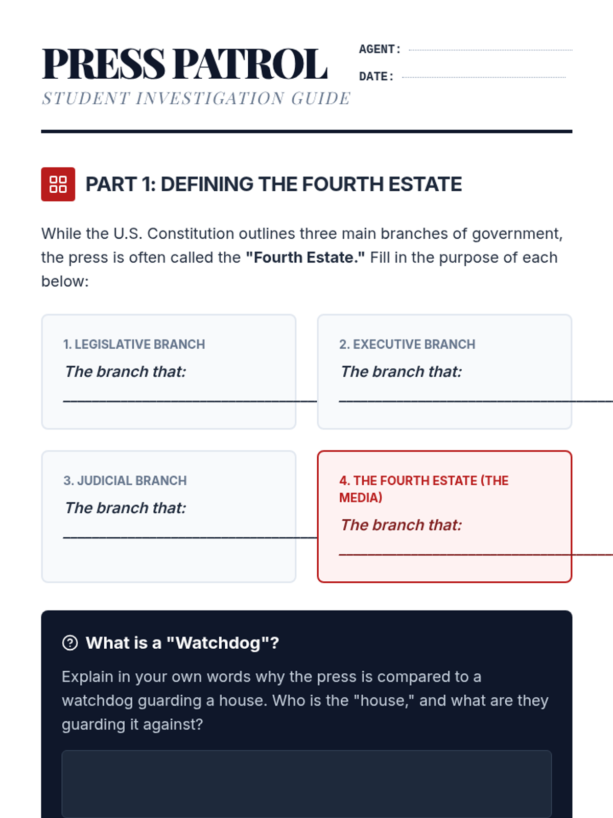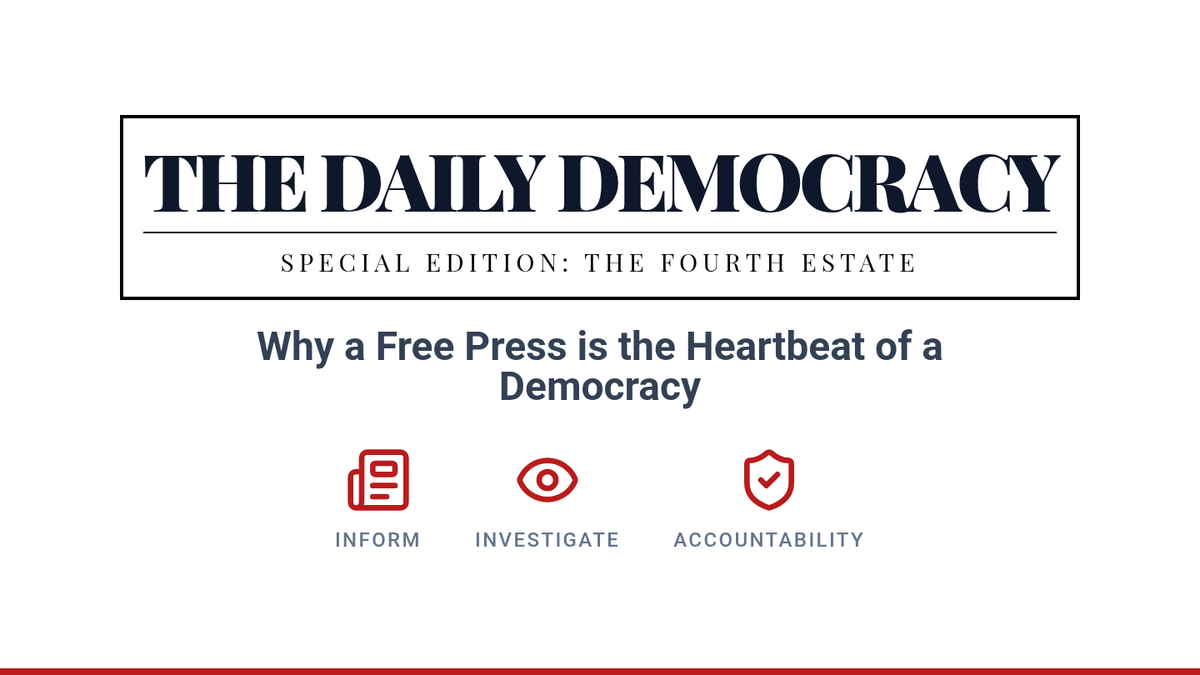 Students explore the vital role of a free press as the 'Fourth Estate' in a democracy, examining historical impact and current relevance through inquiry and analysis.