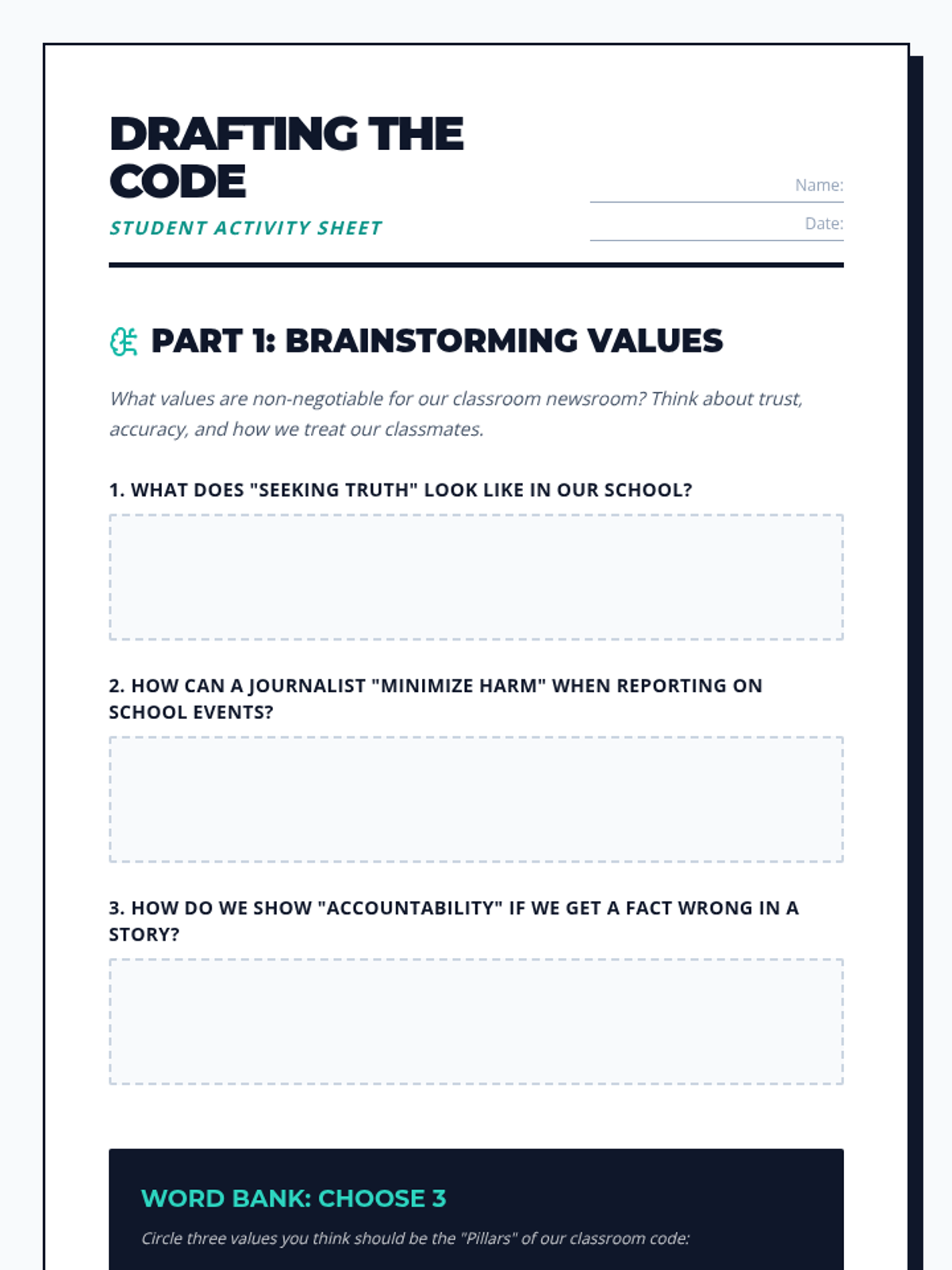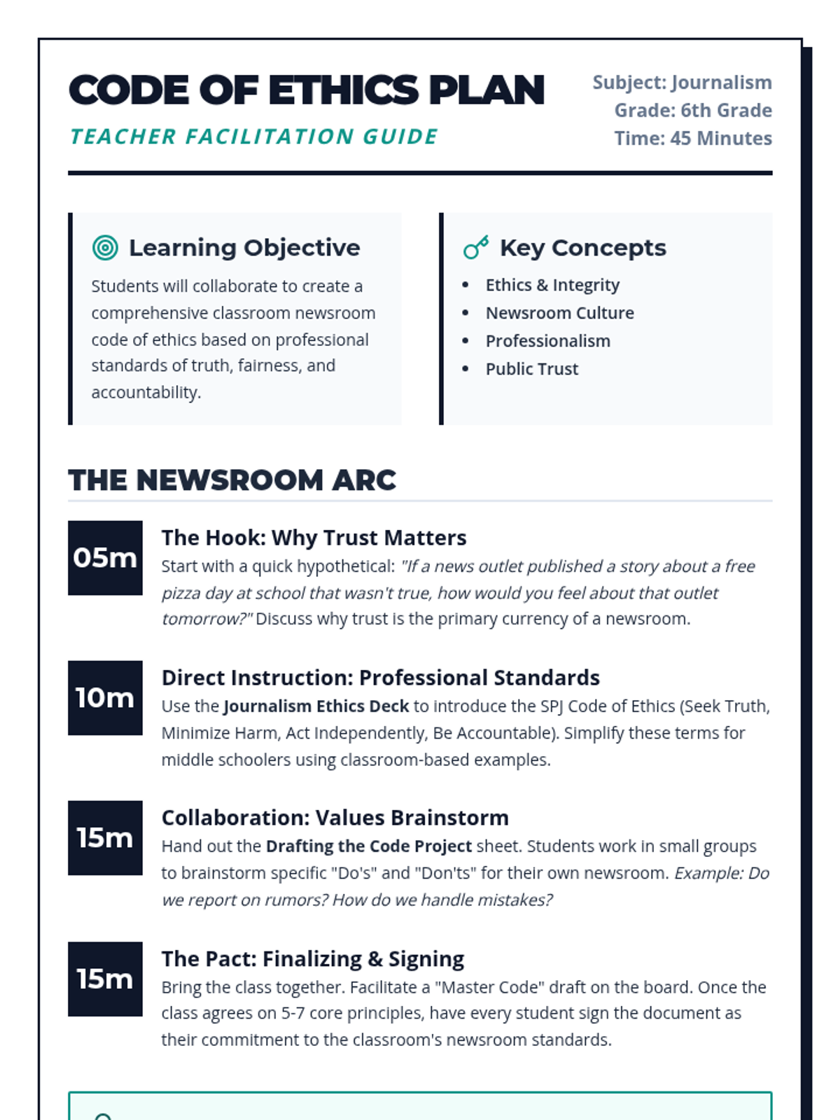 Students explore the foundations of professional journalism ethics to collaboratively build a code of conduct for their classroom newsroom, focusing on truth, fairness, and accountability.