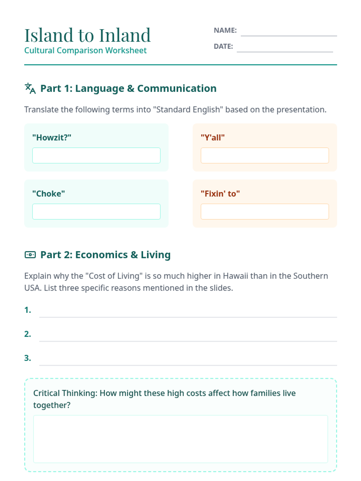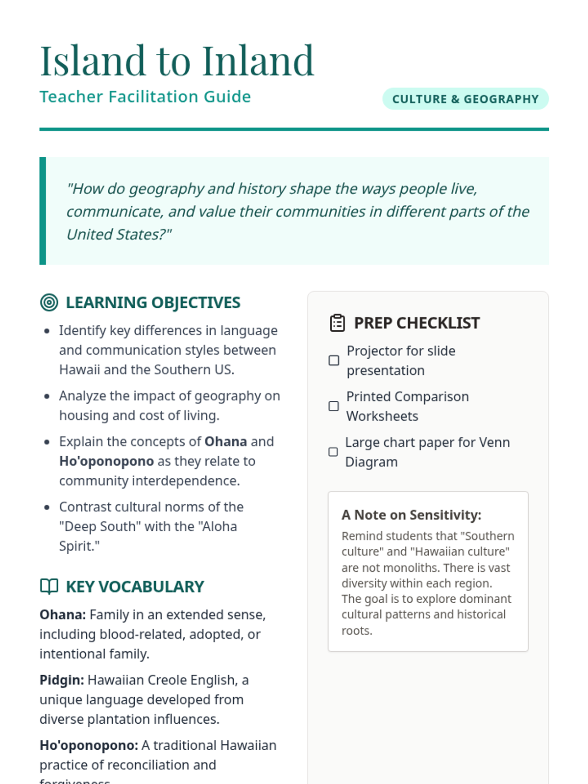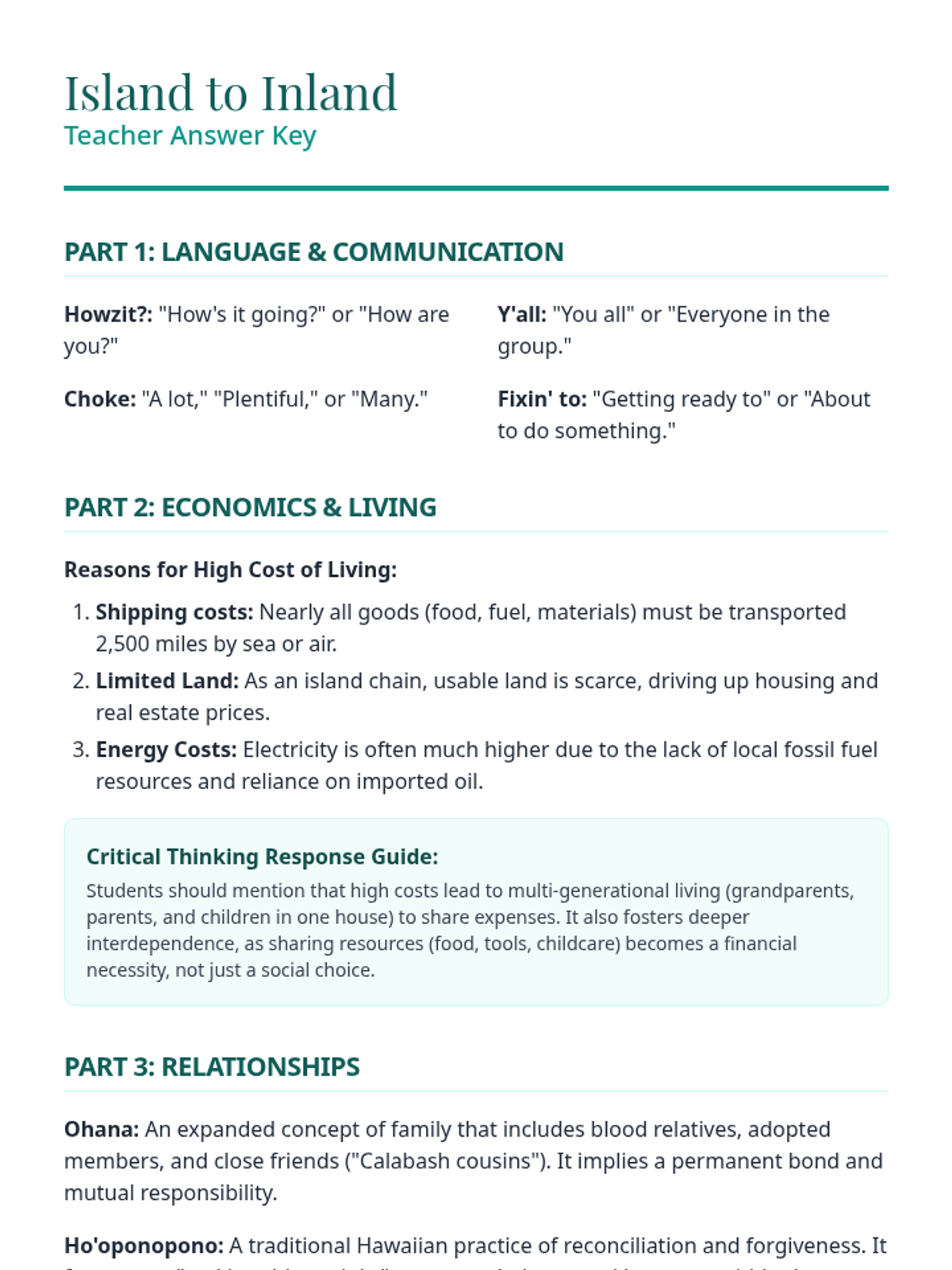 A comparative look at Hawaiian culture and Southern US culture, focusing on language, housing, economics, and deep-rooted family values.
