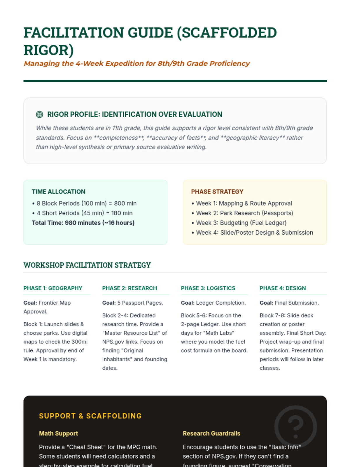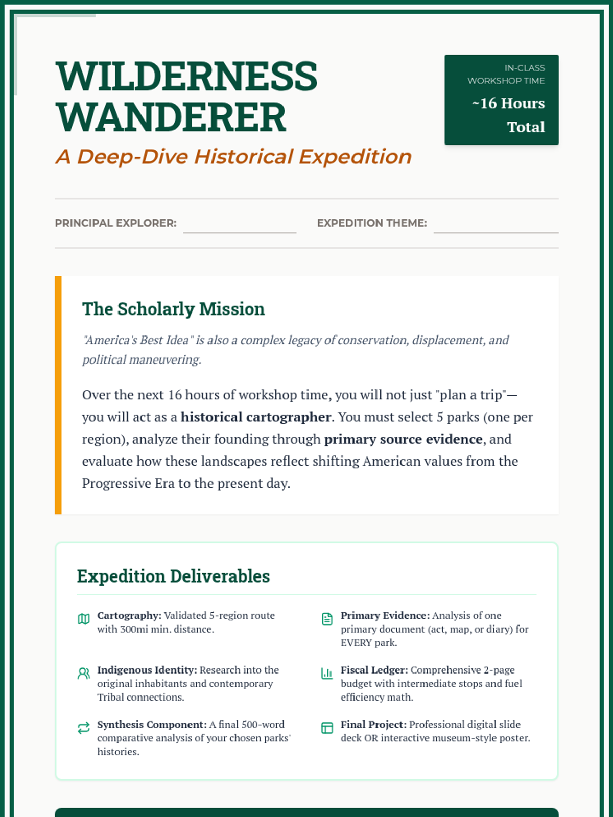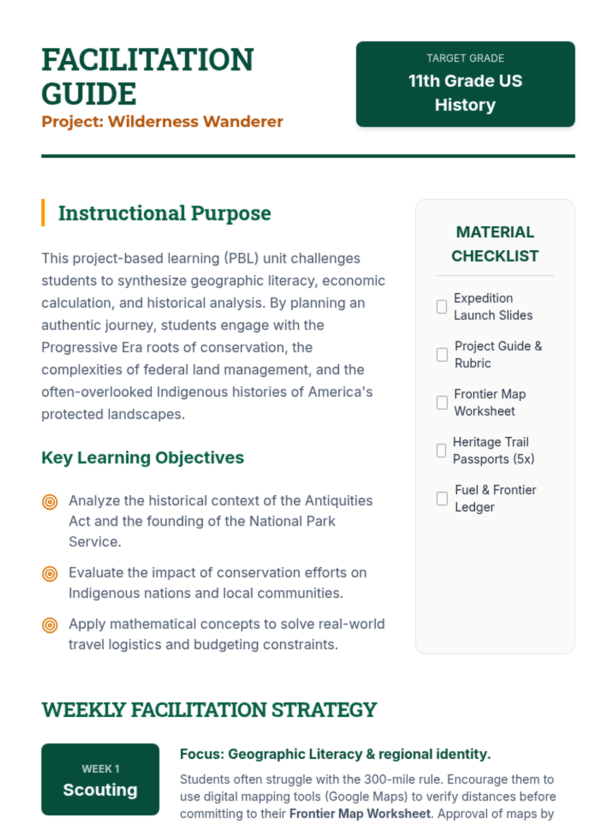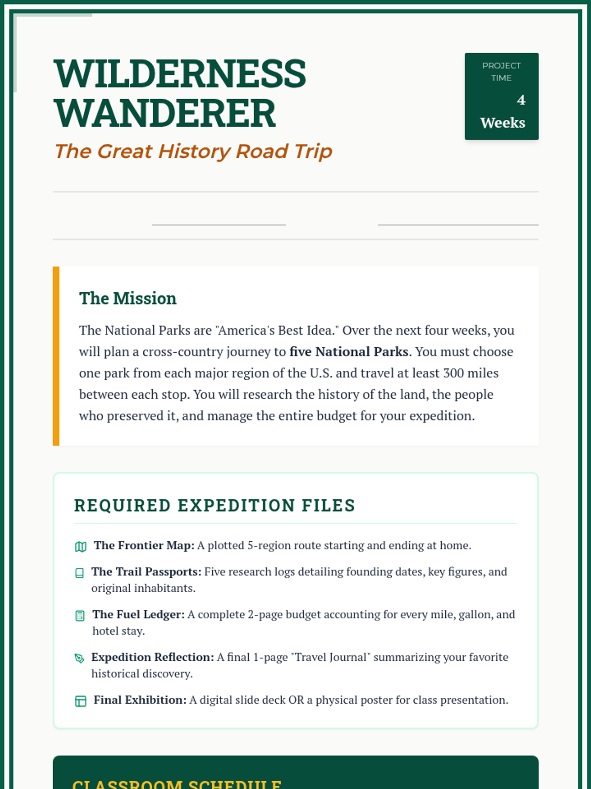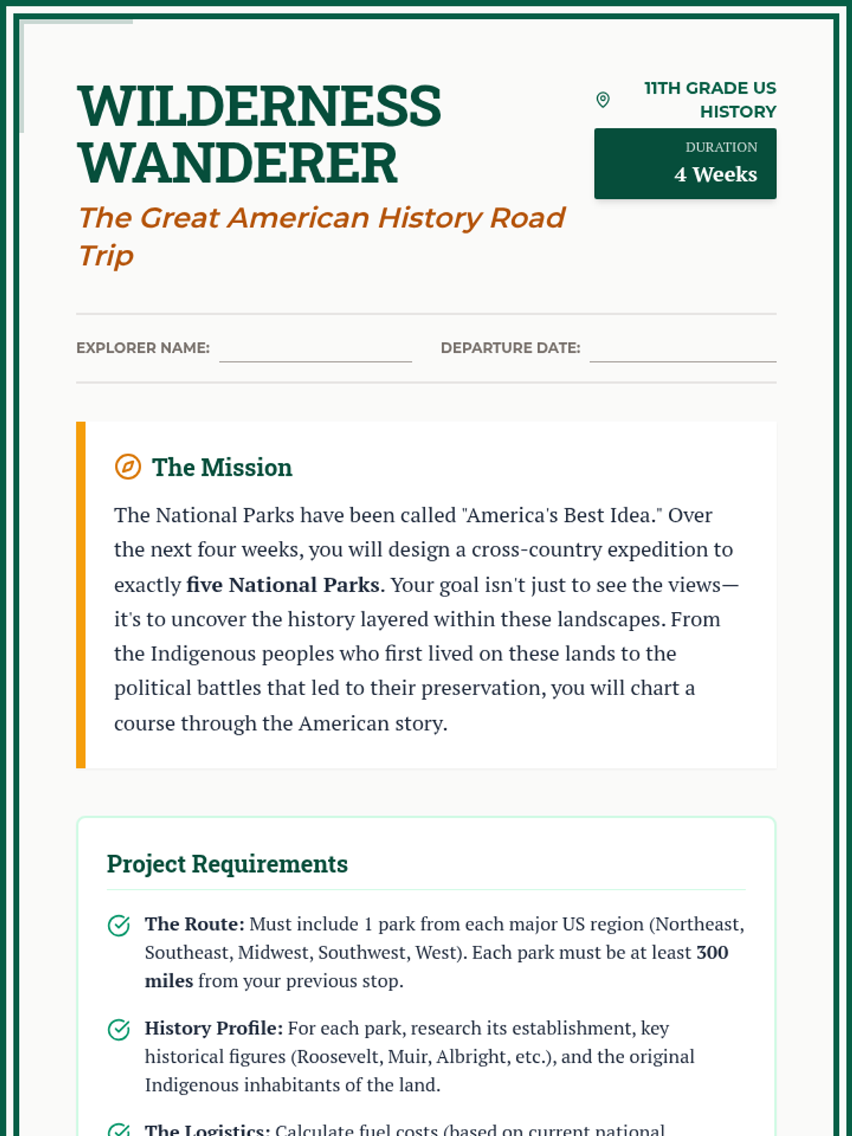 A 4-week project-based learning unit where students plan a cross-country journey to explore the history and landscape of America's National Parks. Students balance logistical planning with deep historical research into the creation and cultural significance of each site.