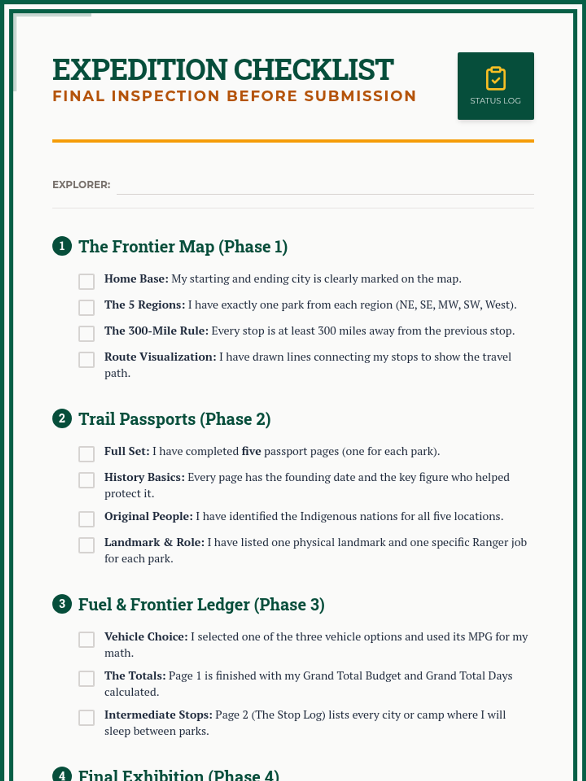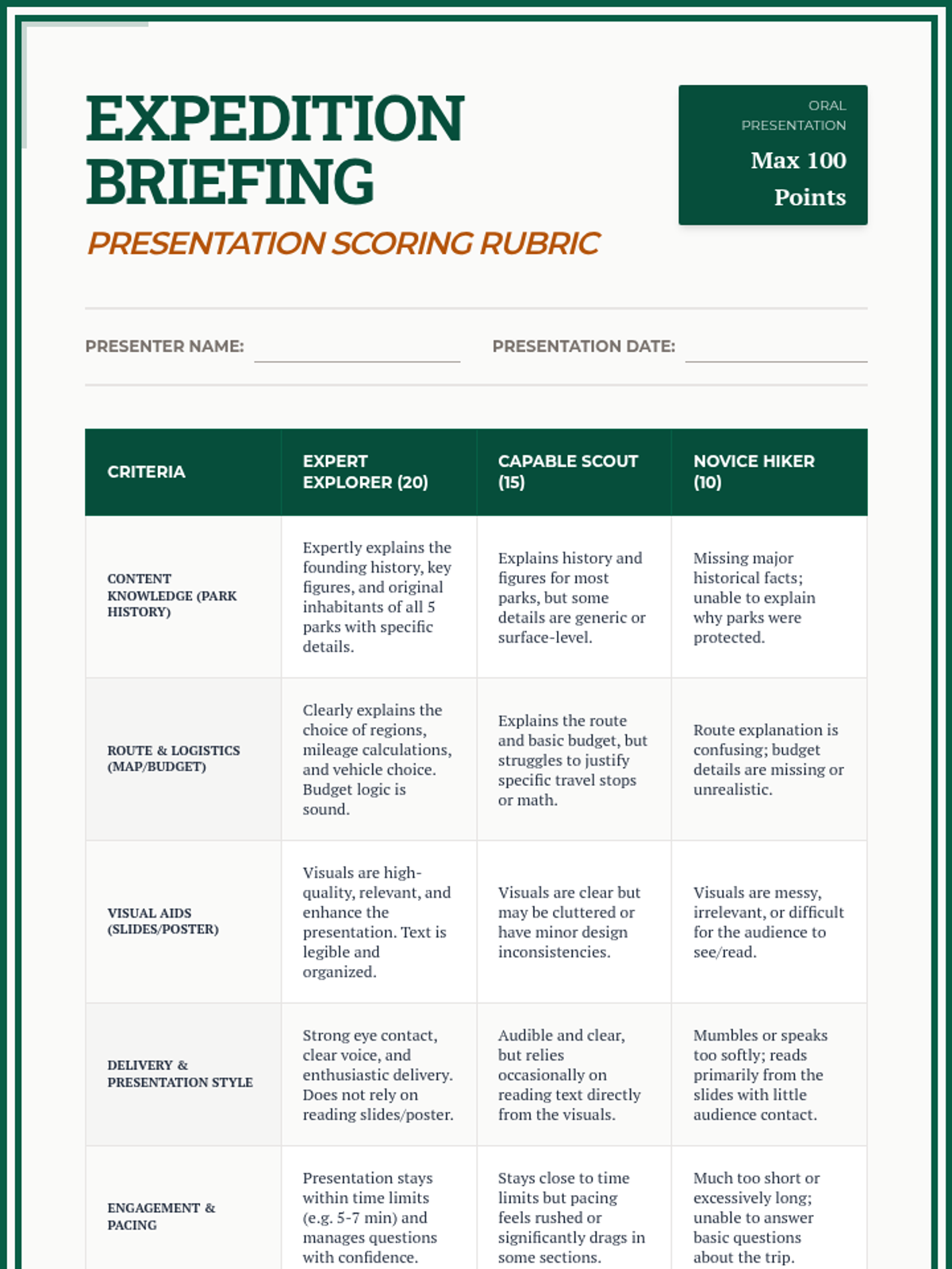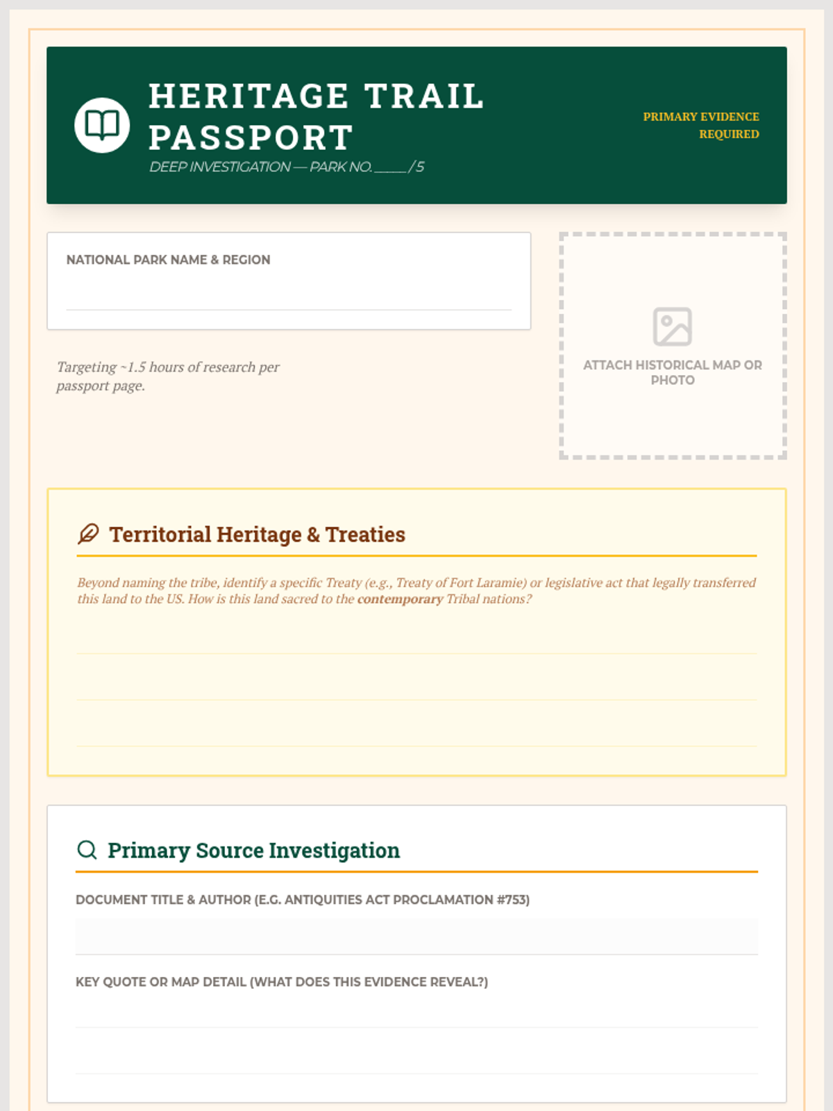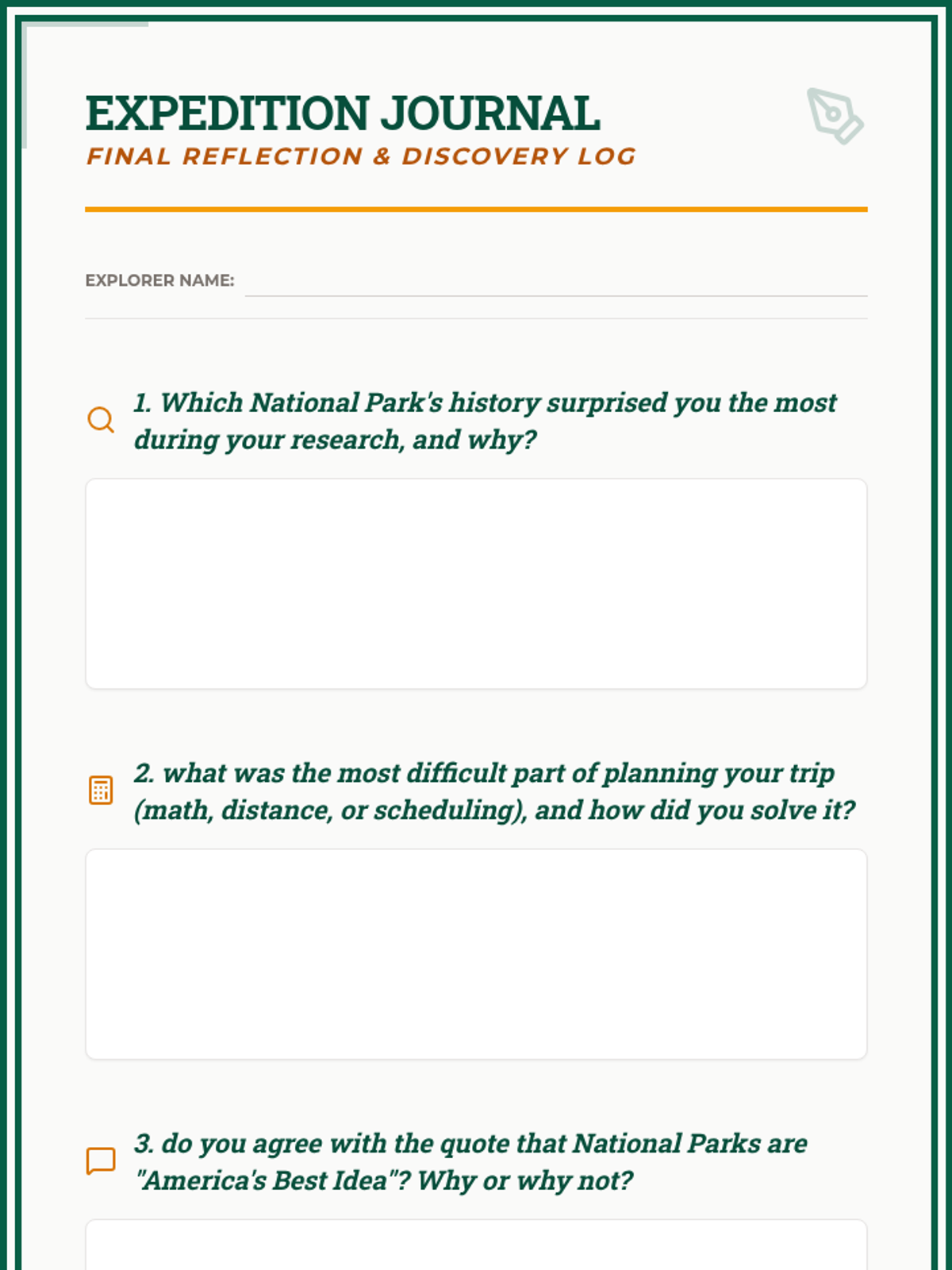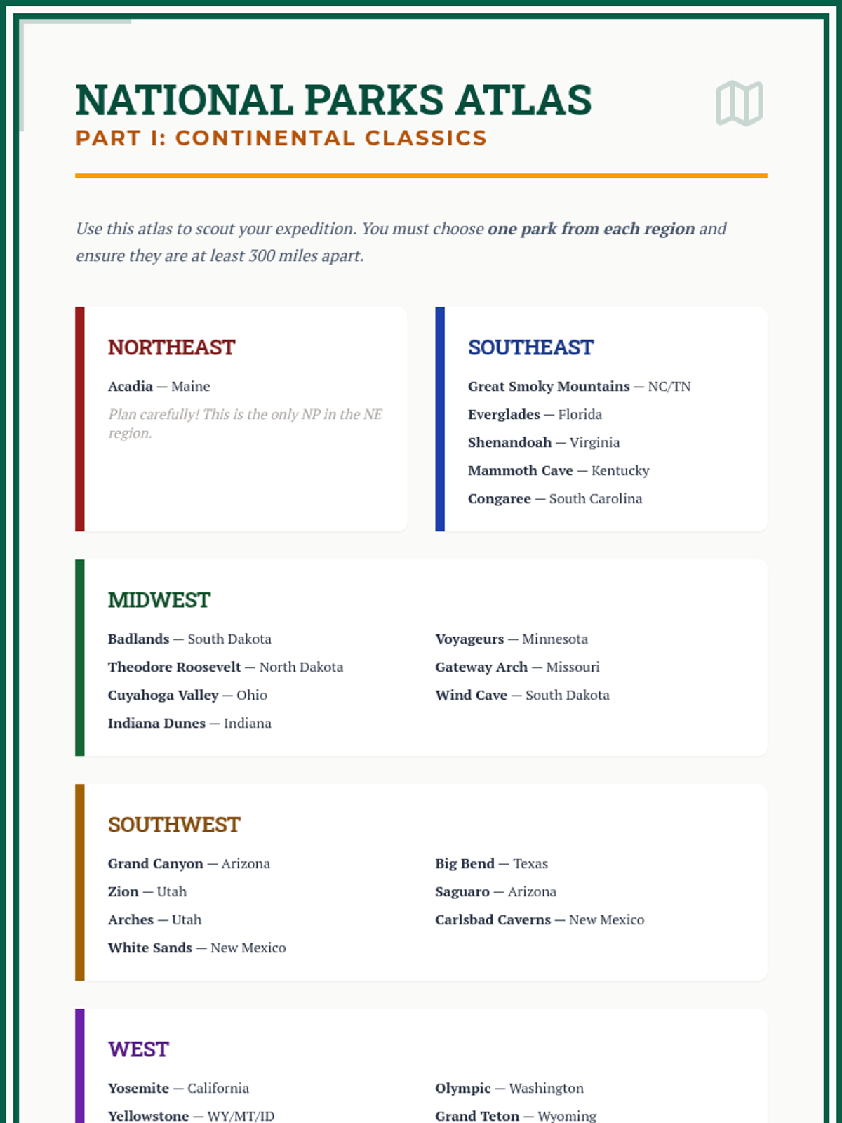 A 4-week project-based learning unit where students plan a cross-country journey to explore the history and landscape of America's National Parks. Students balance logistical planning with deep historical research into the creation and cultural significance of each site.