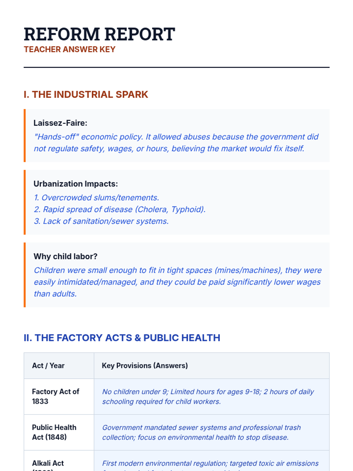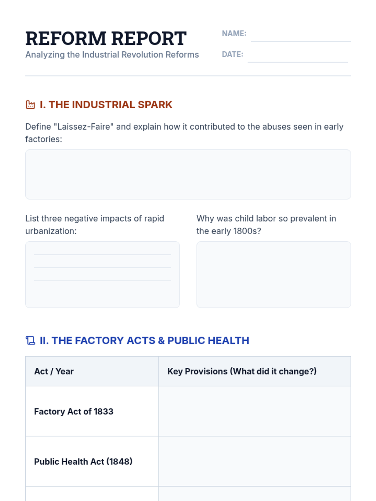 This lesson explores how the rapid changes of the Industrial Revolution necessitated significant reforms across economic, social, and political spheres in the 19th century. Students will analyze the shift from laissez-faire capitalism to government intervention and the rise of labor movements.