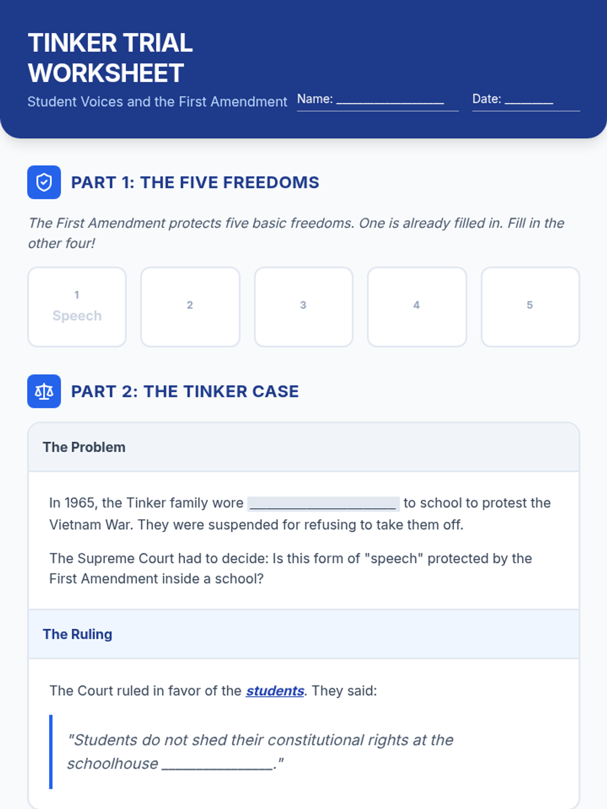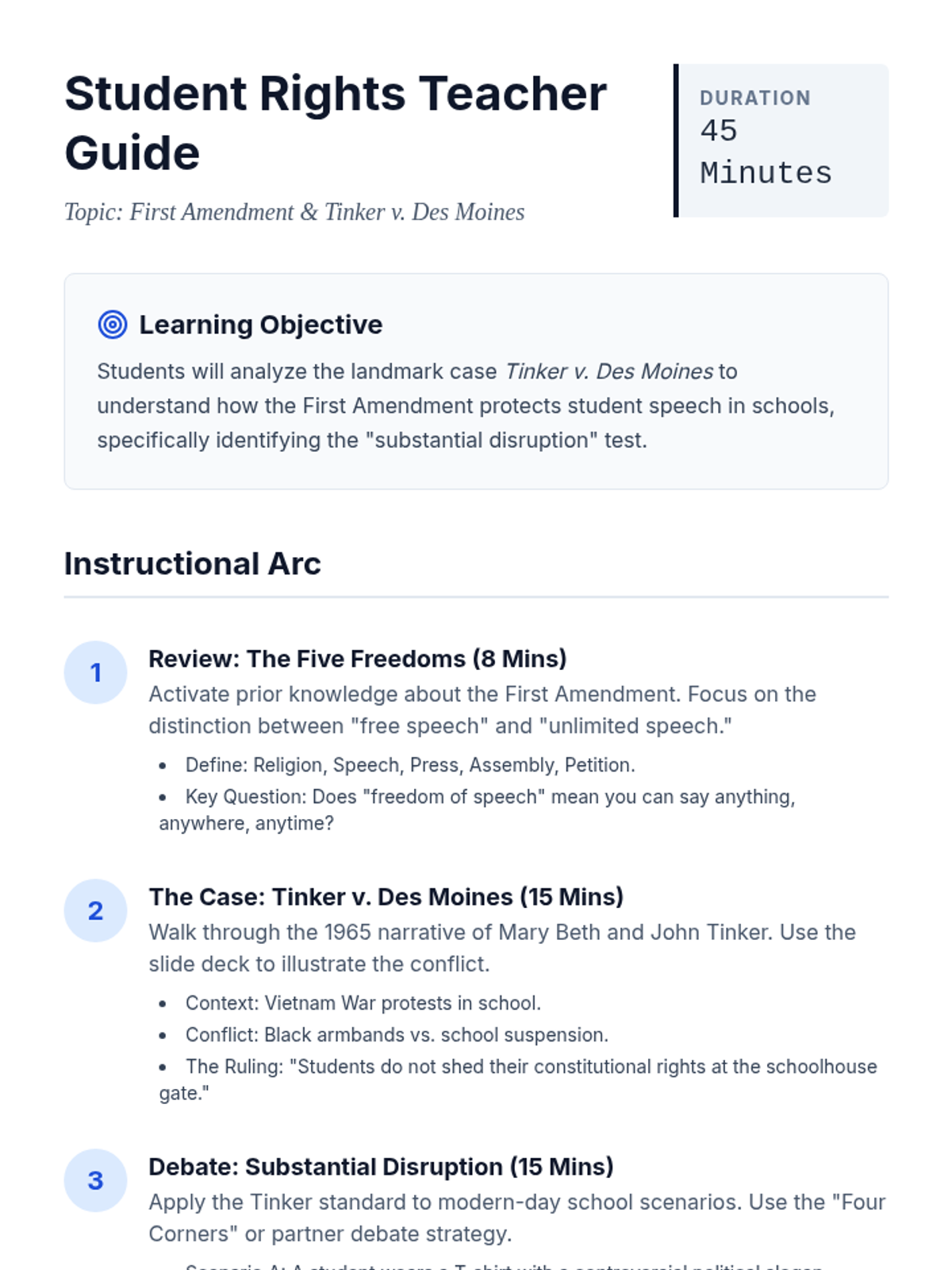A 45-minute civics lesson exploring the First Amendment through the lens of the landmark Supreme Court case Tinker v. Des Moines, empowering students to understand their rights and responsibilities.