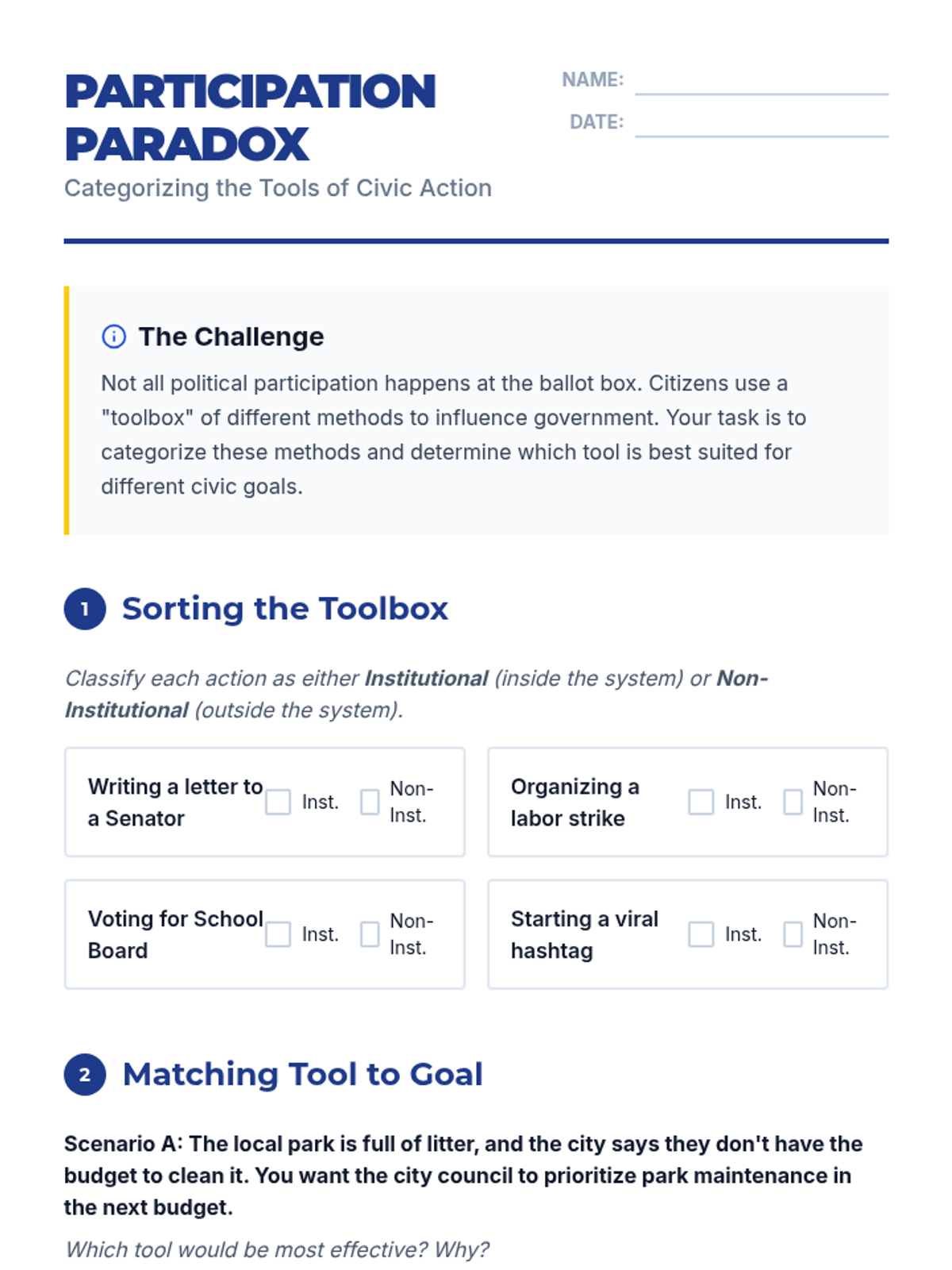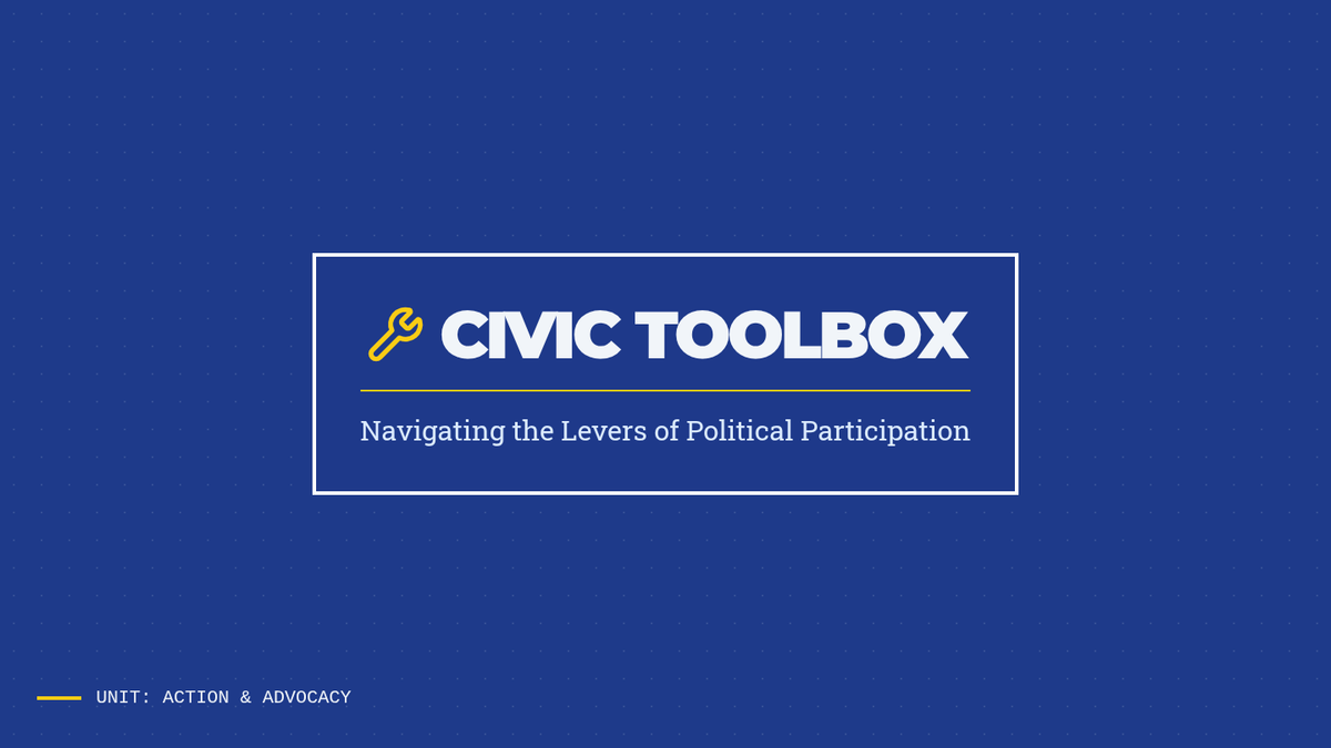 Students survey various forms of political participation, categorizing them into institutional and non-institutional methods. They evaluate the efficacy of different approaches for different types of desired outcomes.
