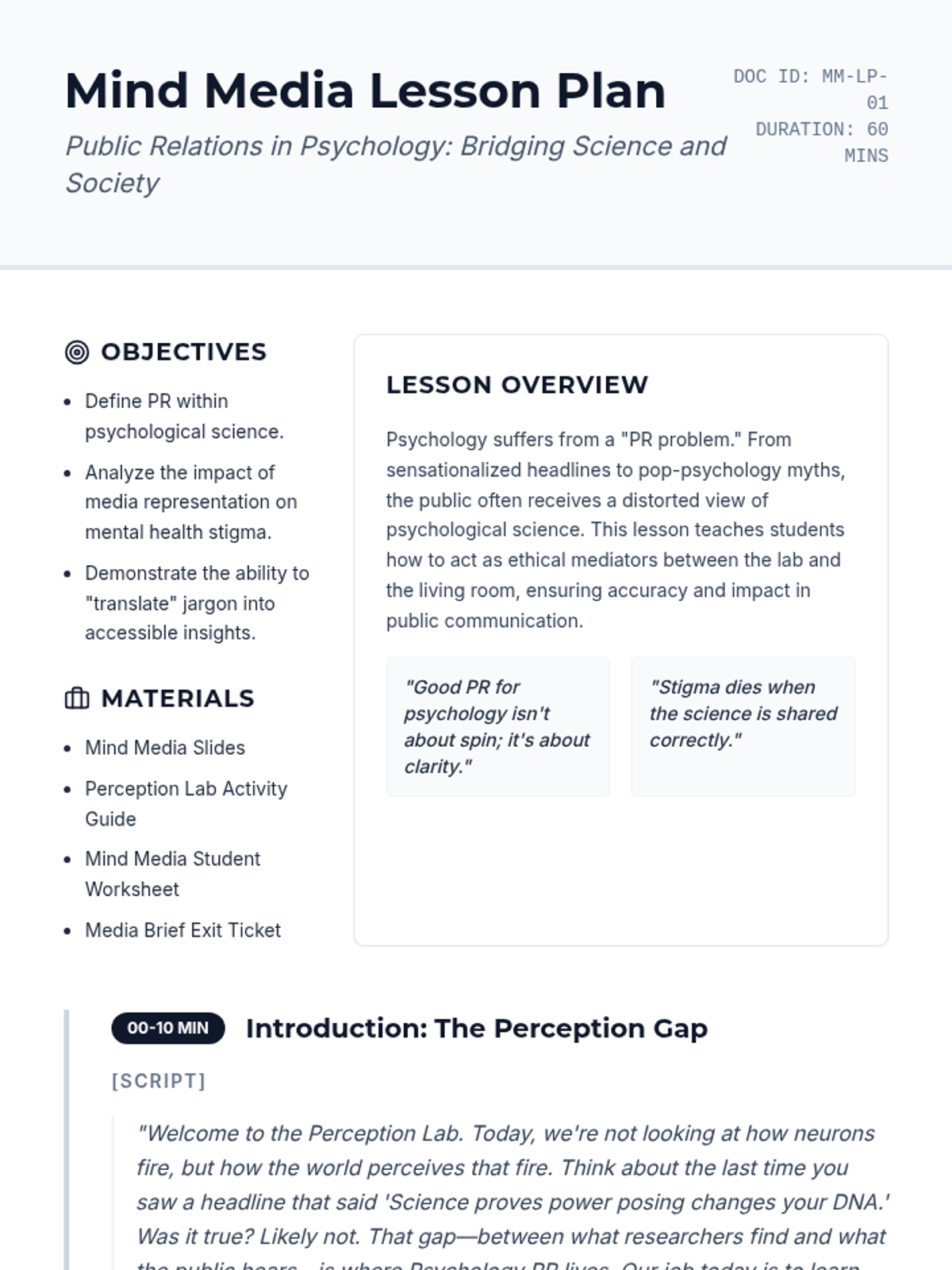 A comprehensive lesson on Public Relations in Psychology, focusing on translating complex research for public consumption, managing public perception of psychological science, and ethical communication.
