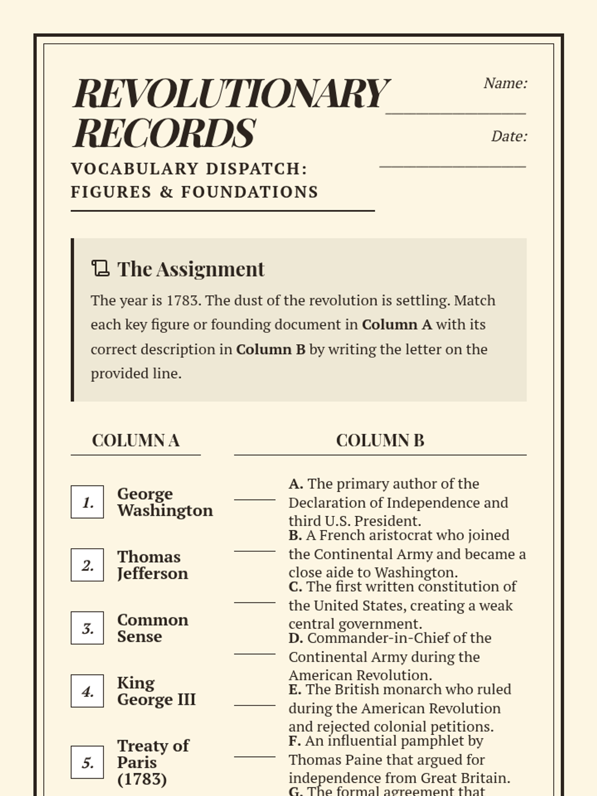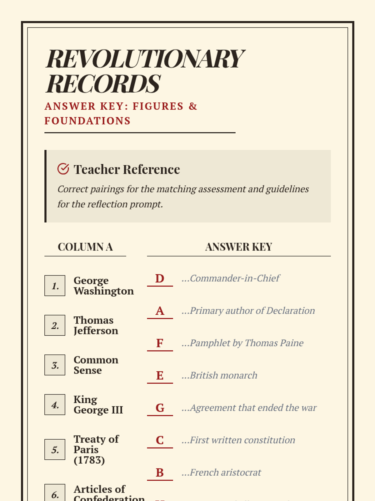A short lesson focused on mastering key figures and founding documents of the American Revolution through matching and reflection.