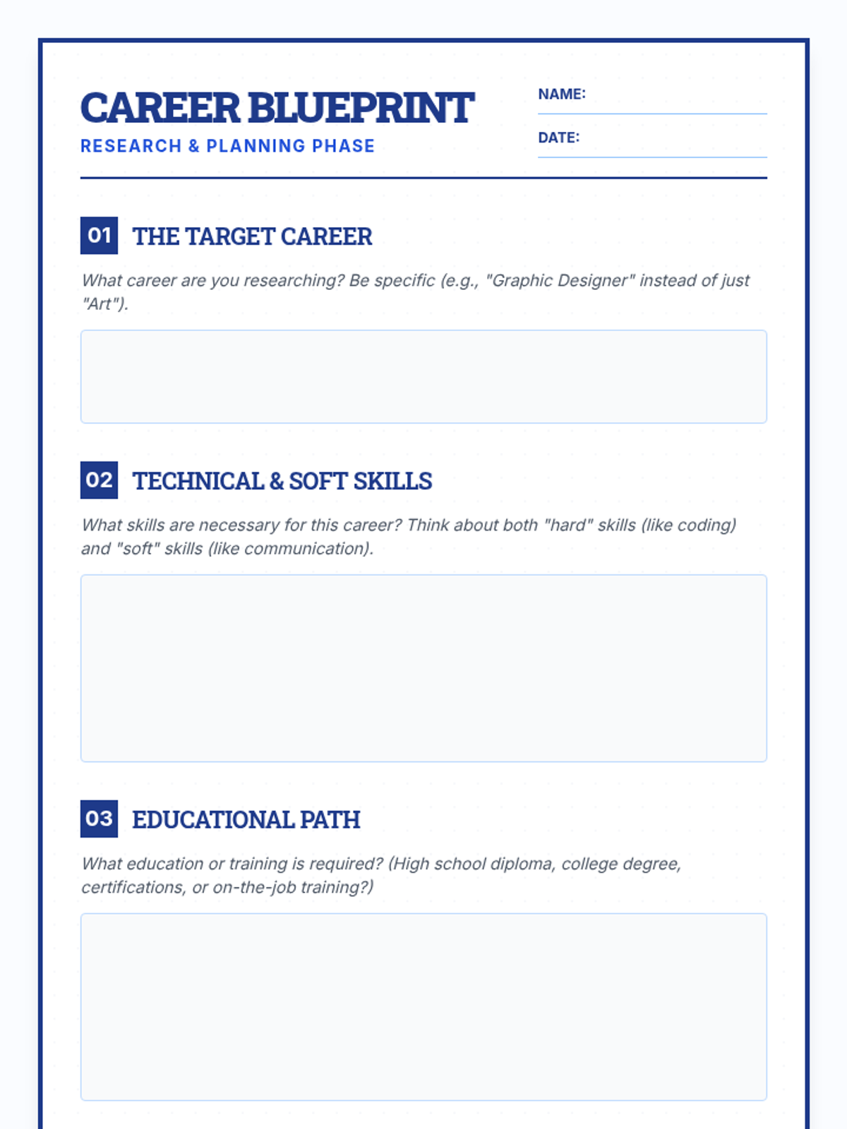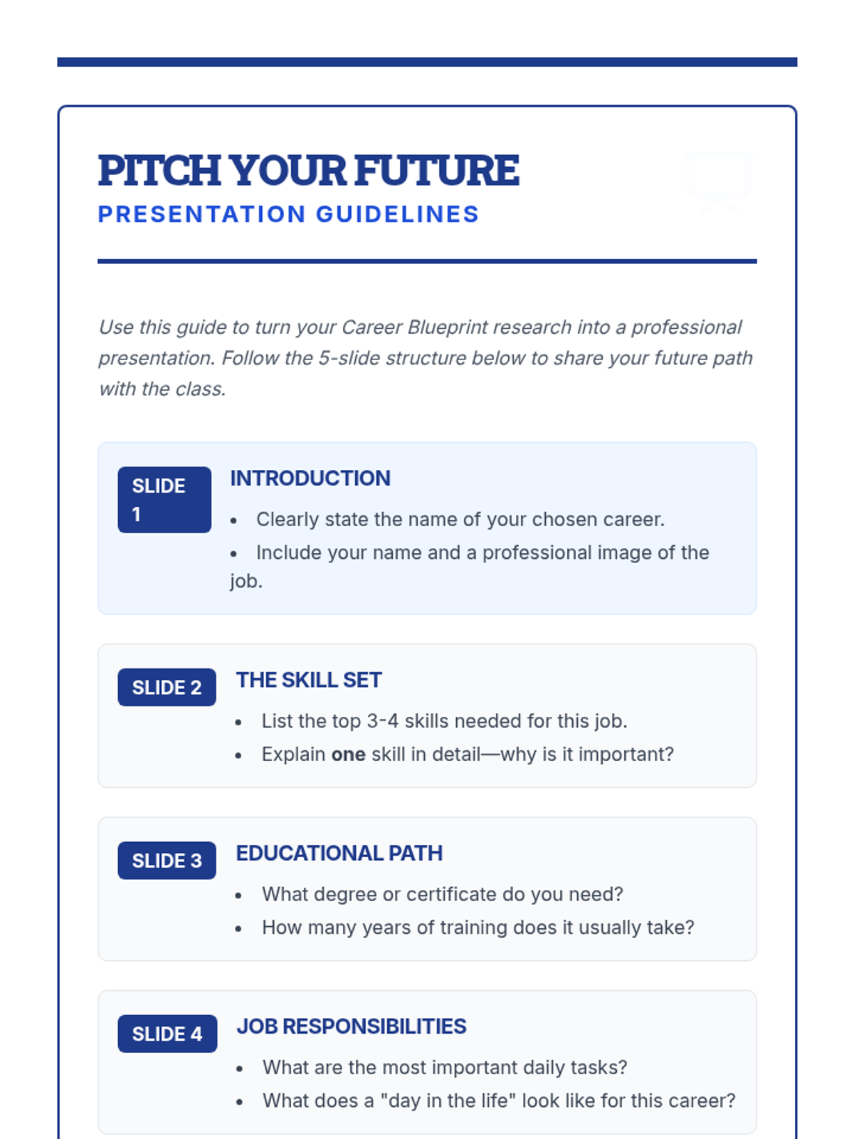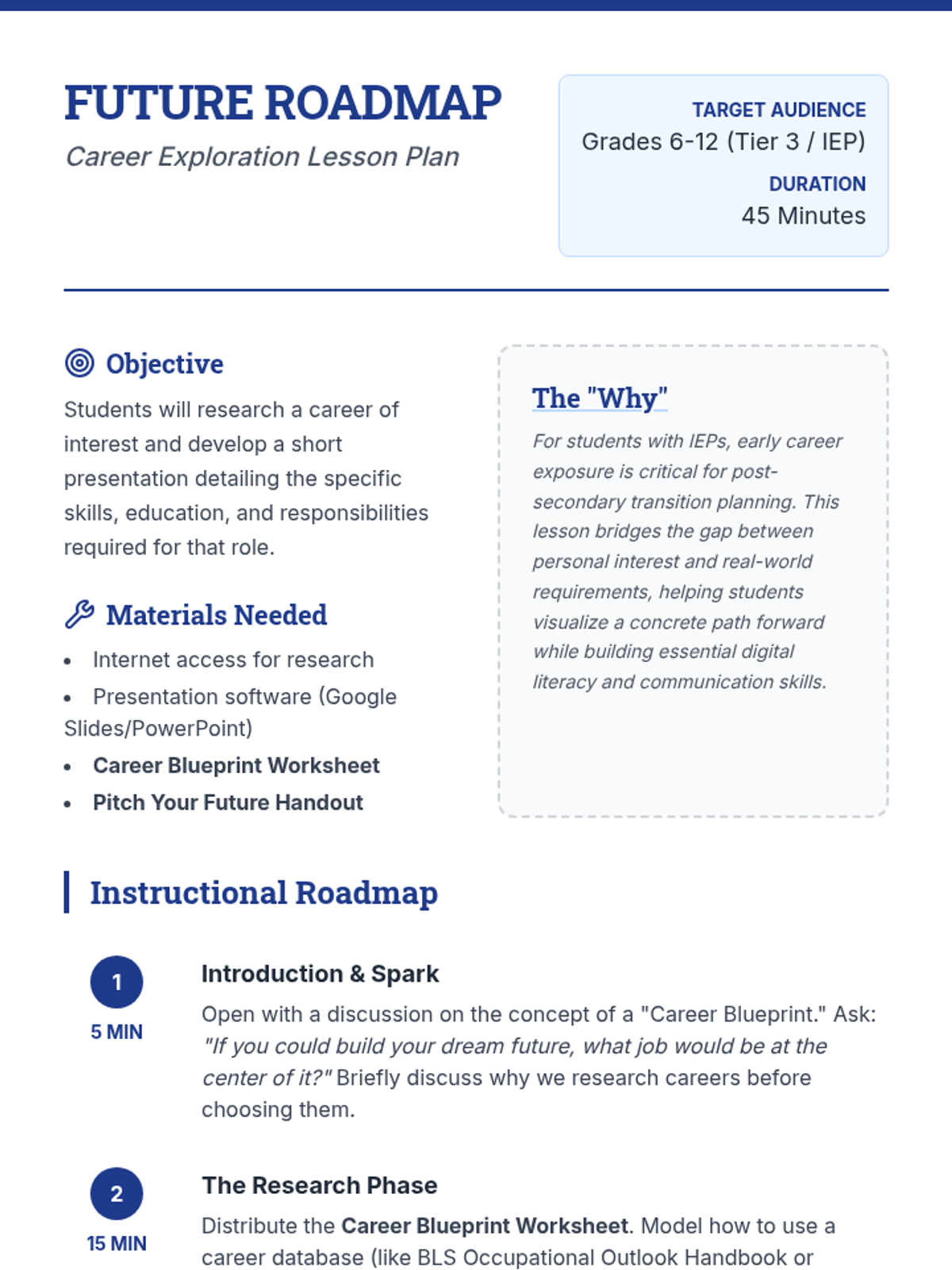 A specialized career exploration lesson designed for students with IEPs (Grades 6-12), focusing on researching profession requirements and developing presentation skills through a 'Career Blueprint' framework.