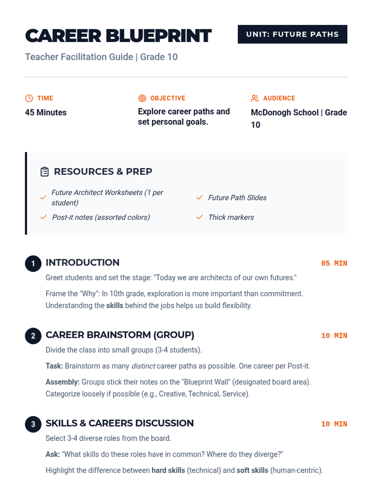 A 45-minute career exploration lesson for 10th-grade students, focusing on identifying career paths, analyzing required skills, and aligning personal strengths with future goals.