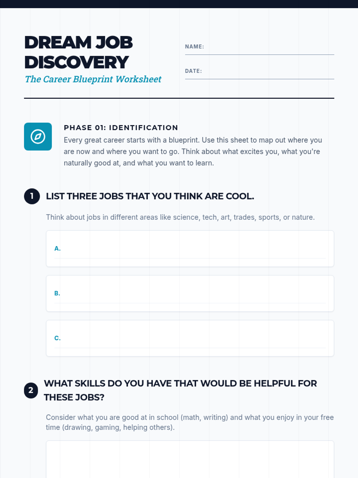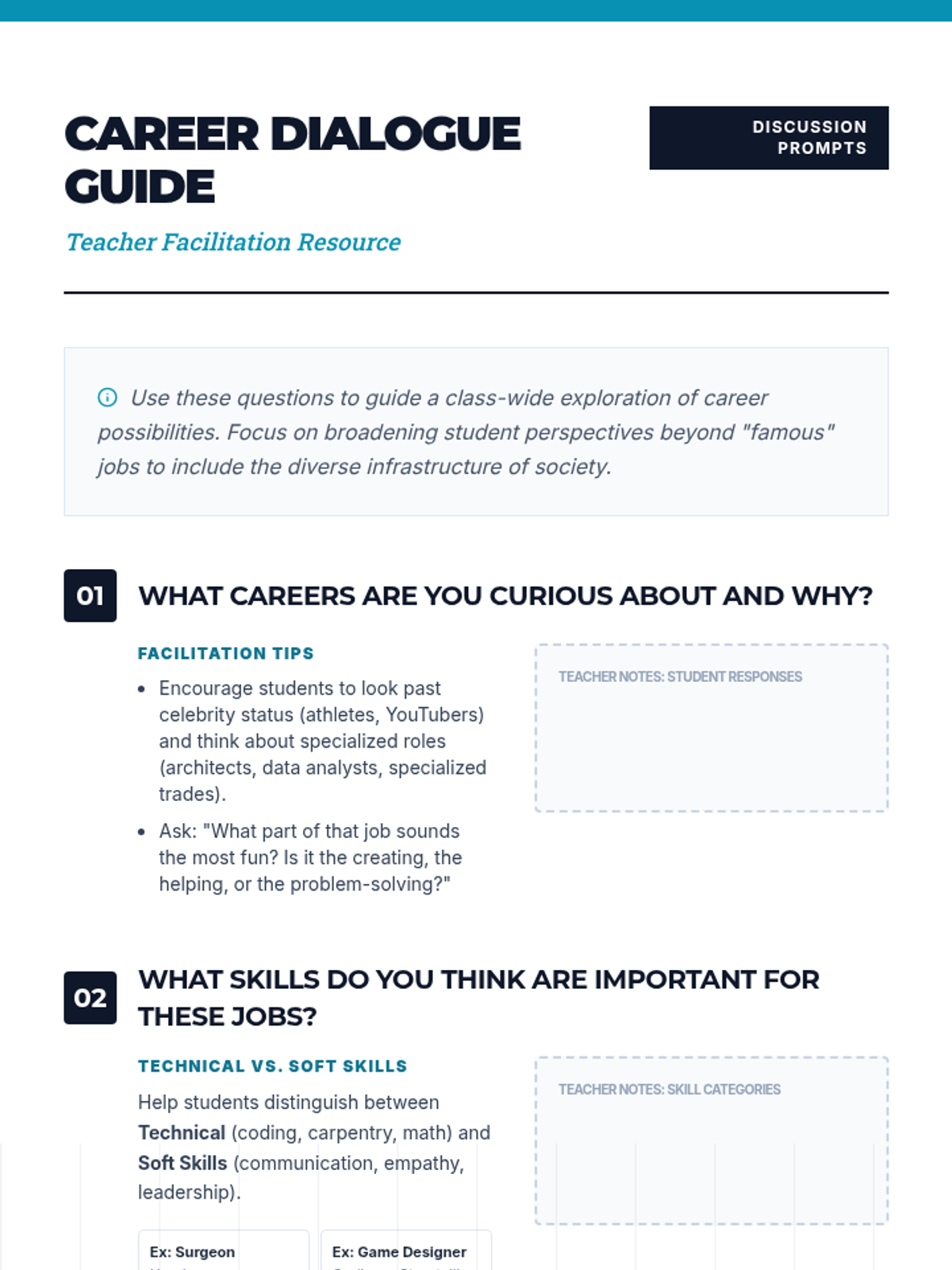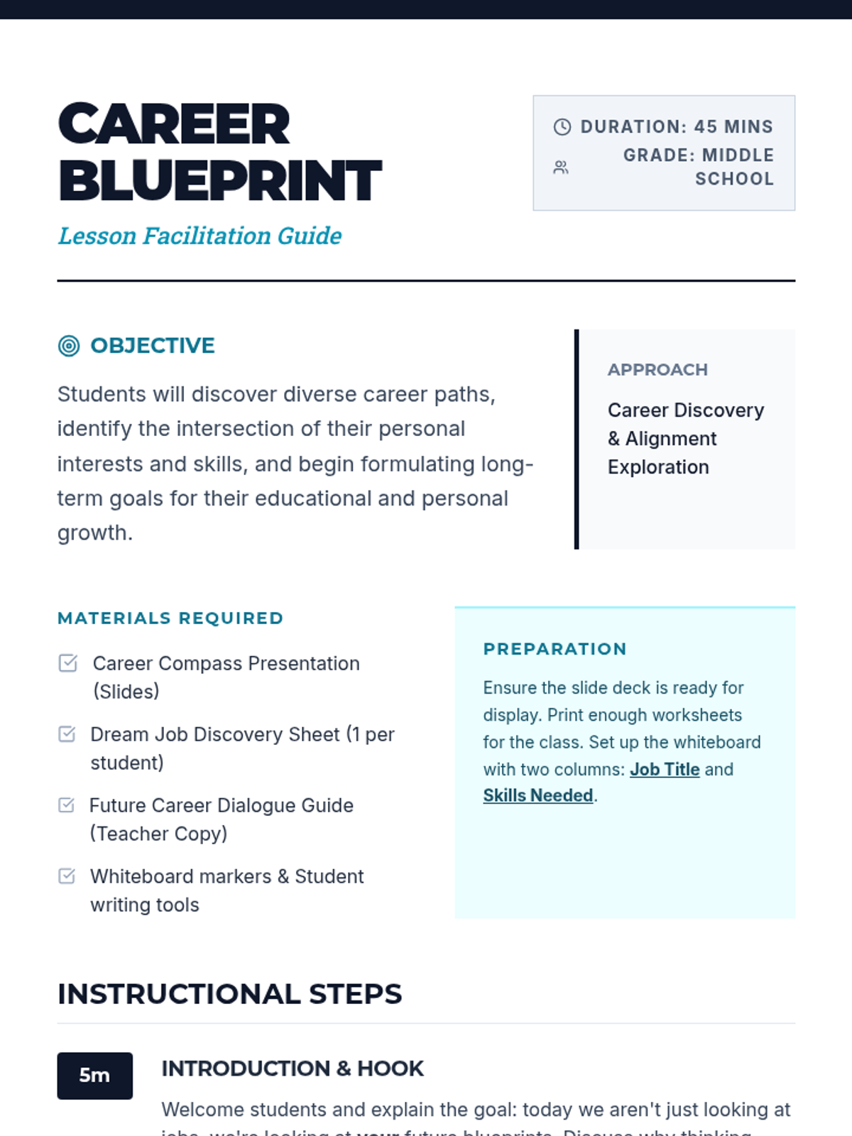 A middle school lesson designed to introduce students to diverse career paths, helping them align their personal interests and skills with potential future occupations through guided discussion and self-reflection.