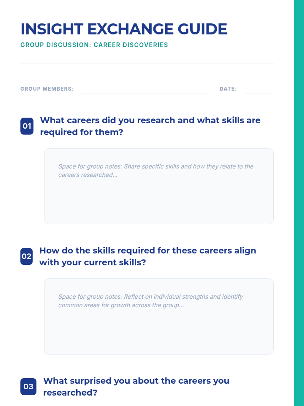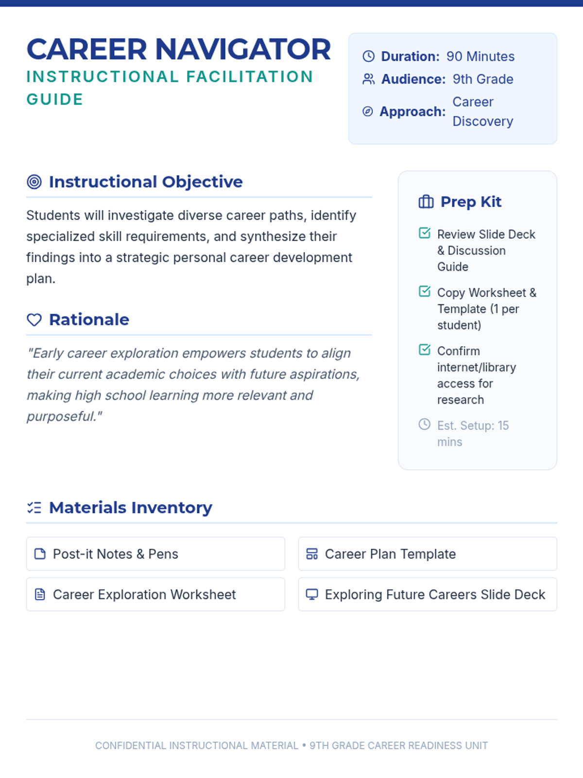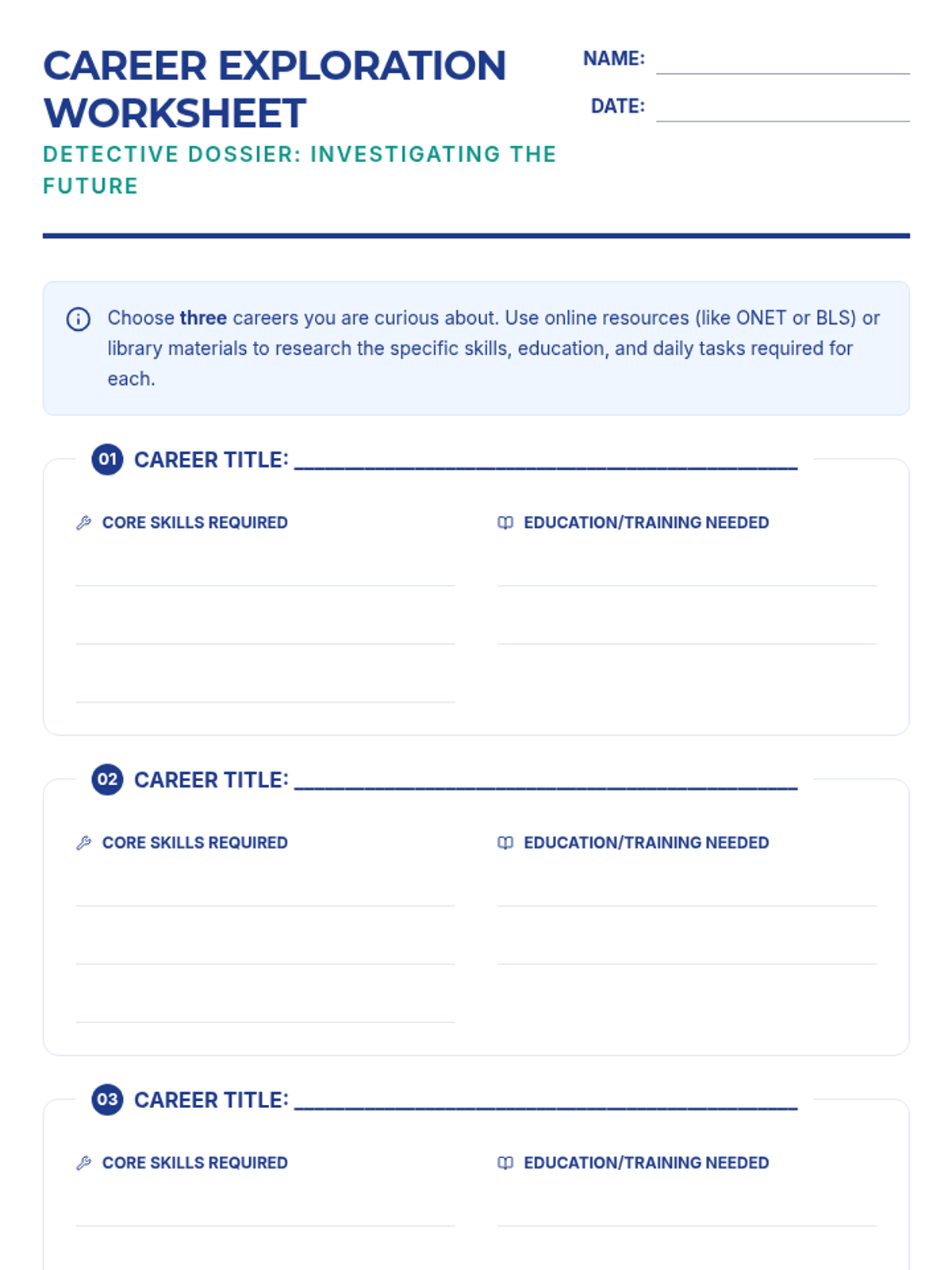 Students explore various career paths, research required skills, and develop a personal career plan to navigate their professional future.
