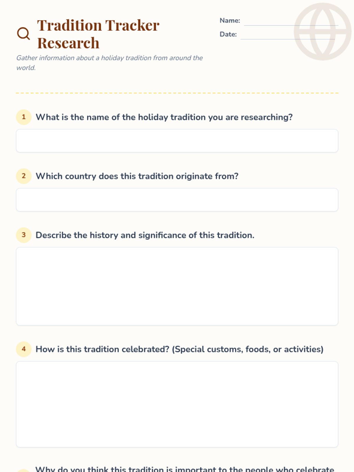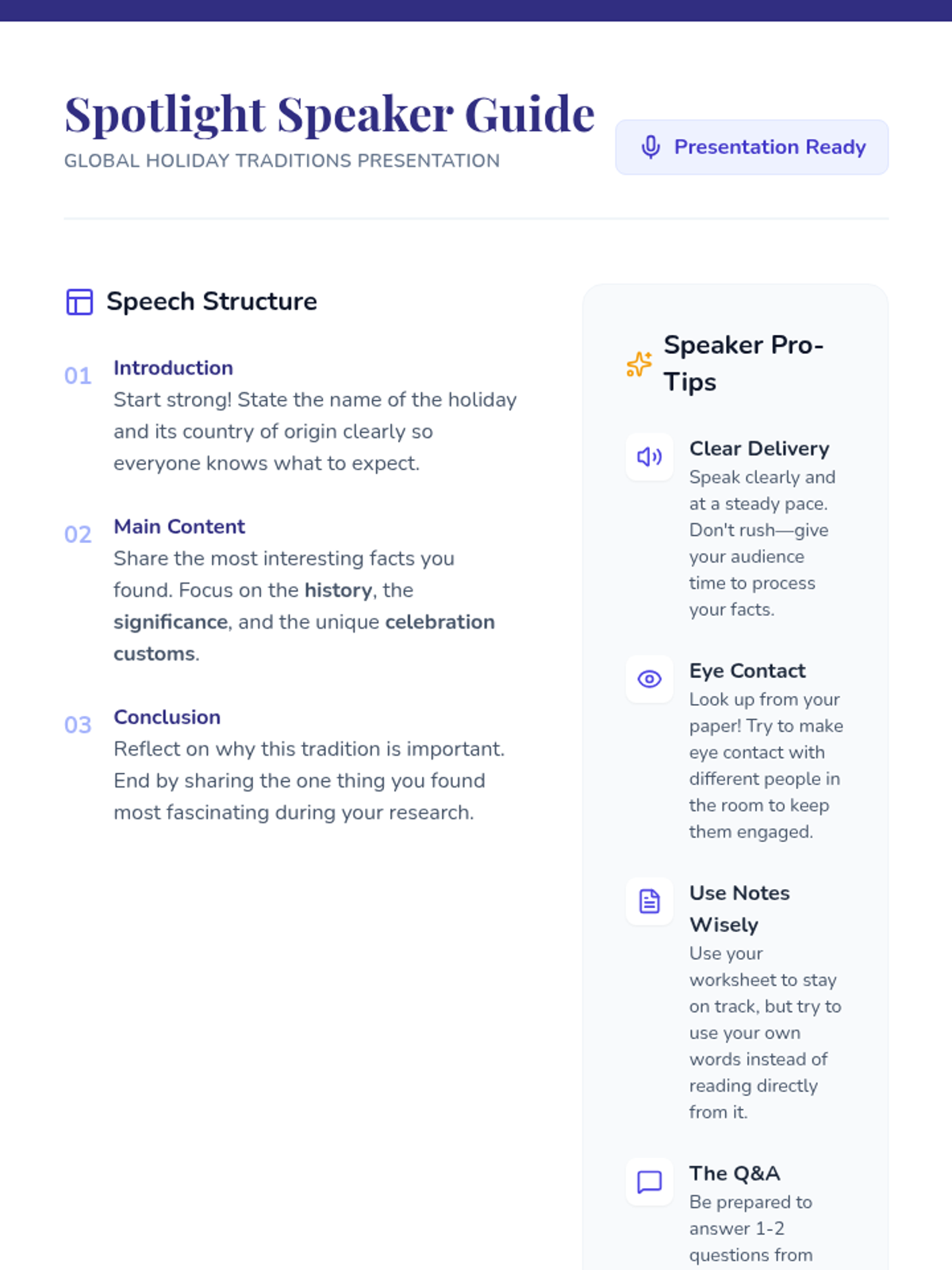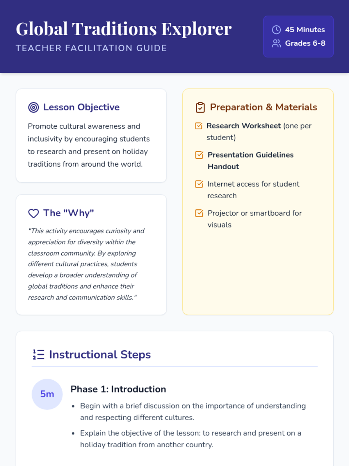 Students research and present on diverse holiday traditions from around the world to foster cultural curiosity, appreciation, and presentation skills.