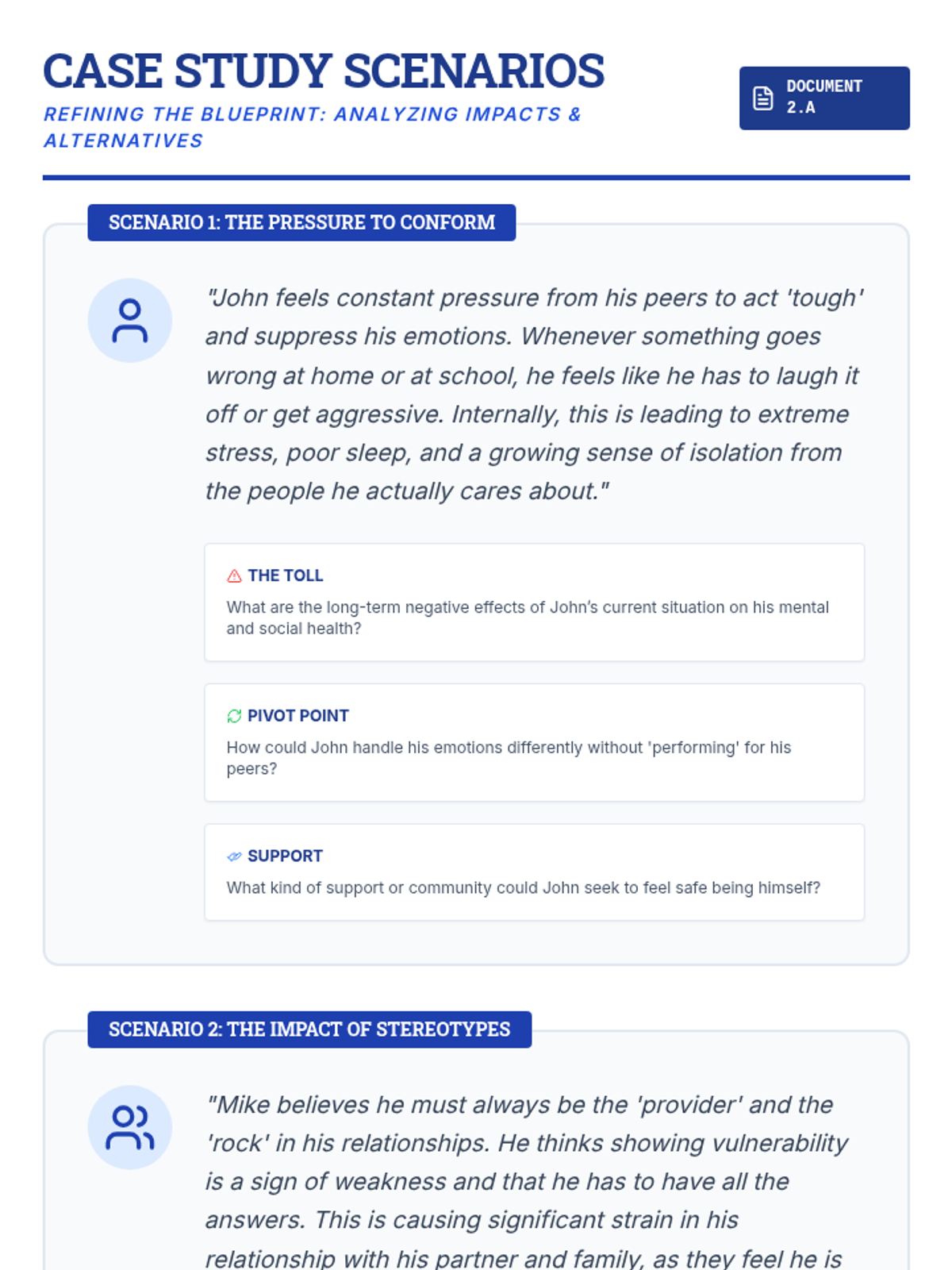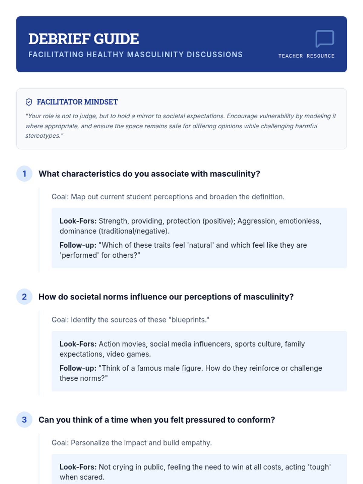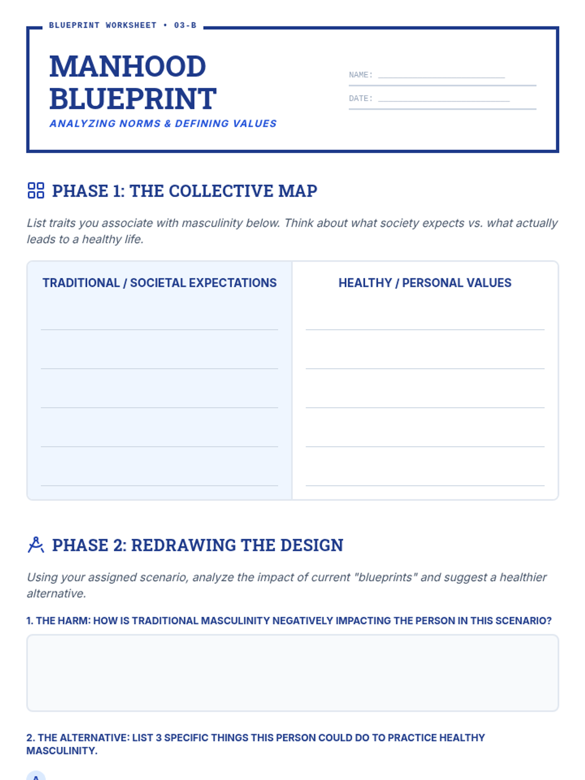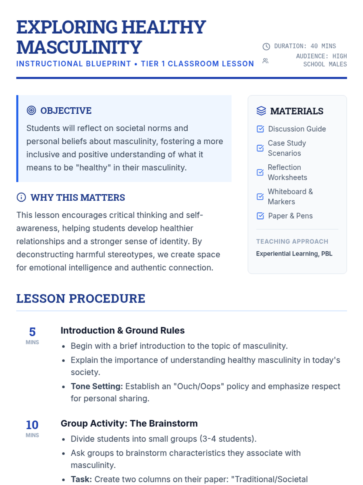 A comprehensive lesson for high school males exploring healthy masculinity through experiential activities, case studies, and critical discussions on societal norms.