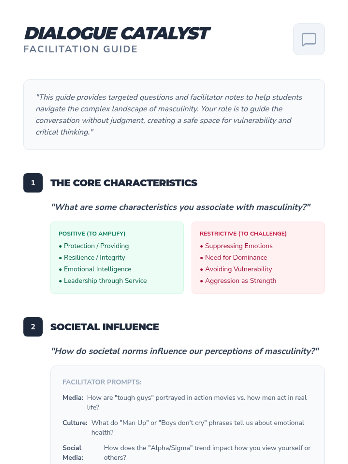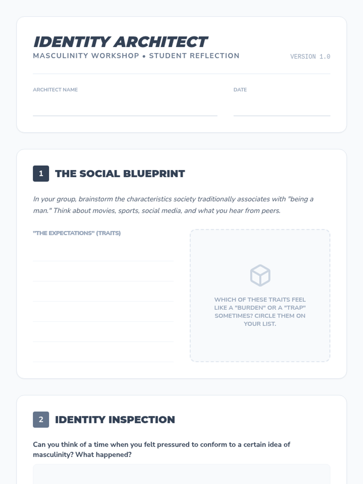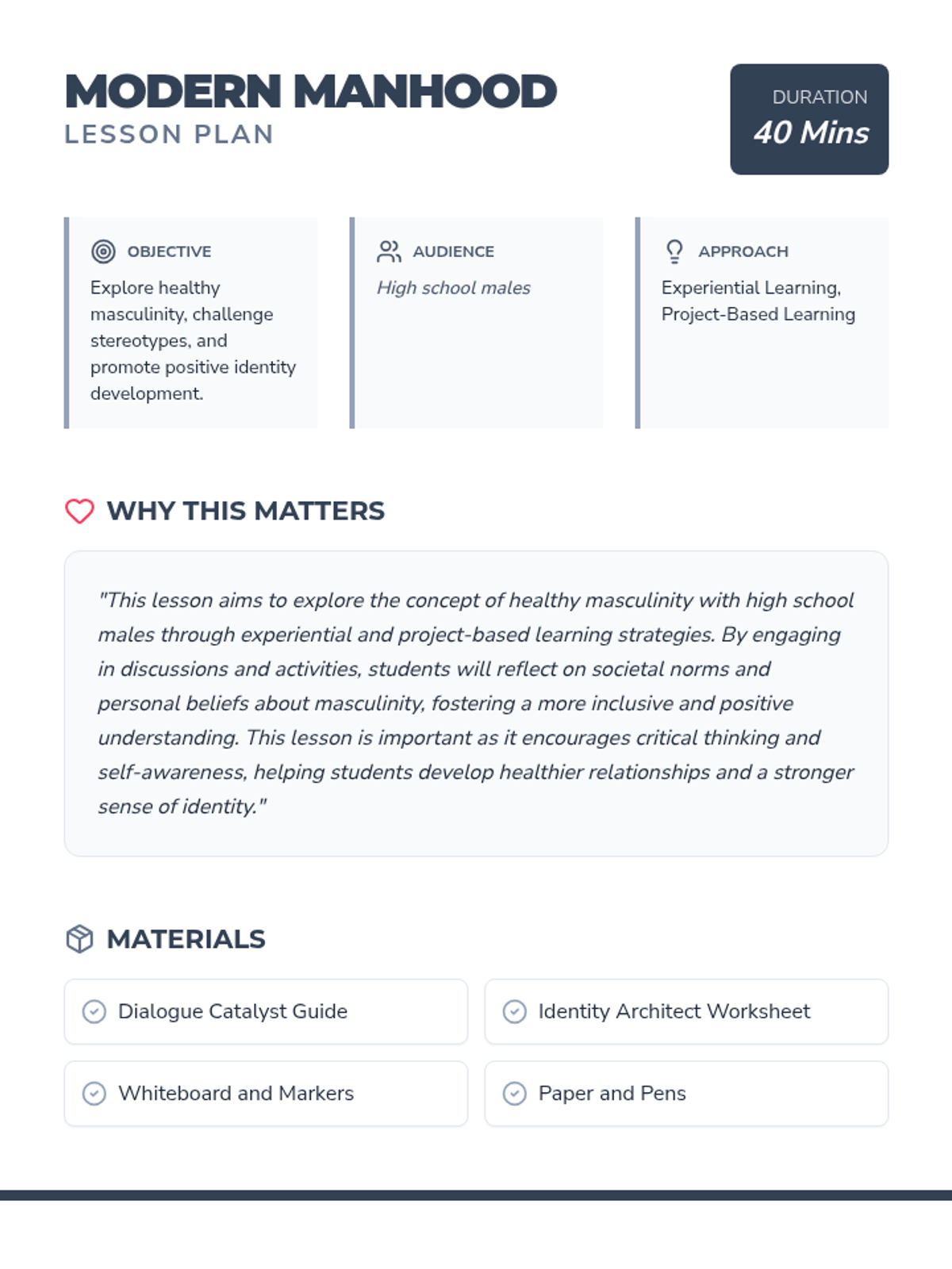 This lesson explores healthy masculinity through experiential and project-based learning, challenging stereotypes and fostering positive identity development in high school males.