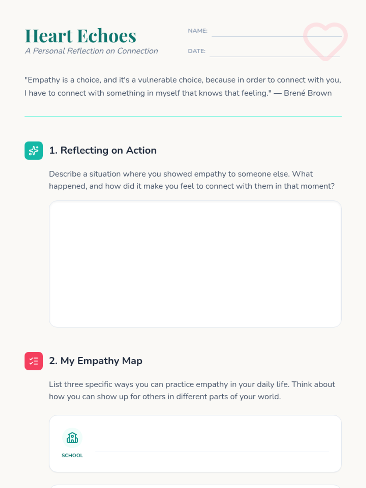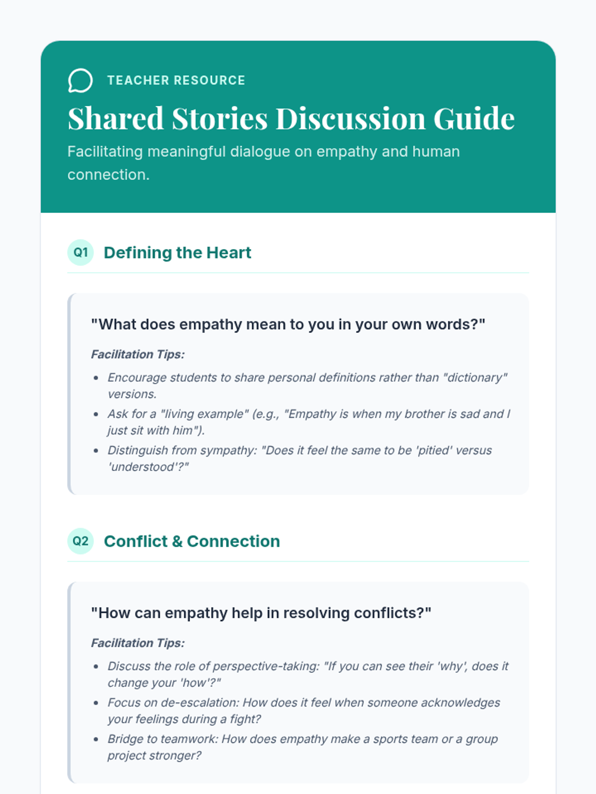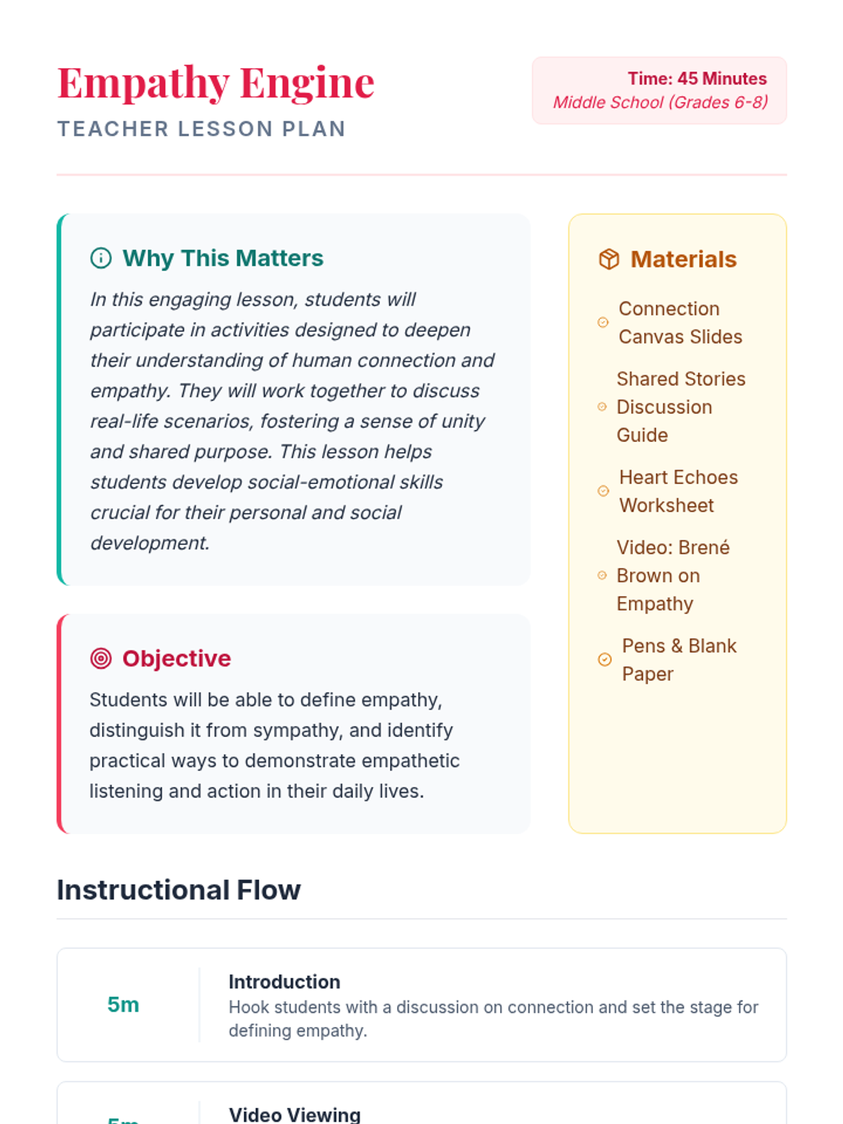 A middle school lesson designed to foster empathy, understanding, and human connection through interactive activities, group discussions, and personal reflection. Students explore the difference between empathy and sympathy and practice active listening.