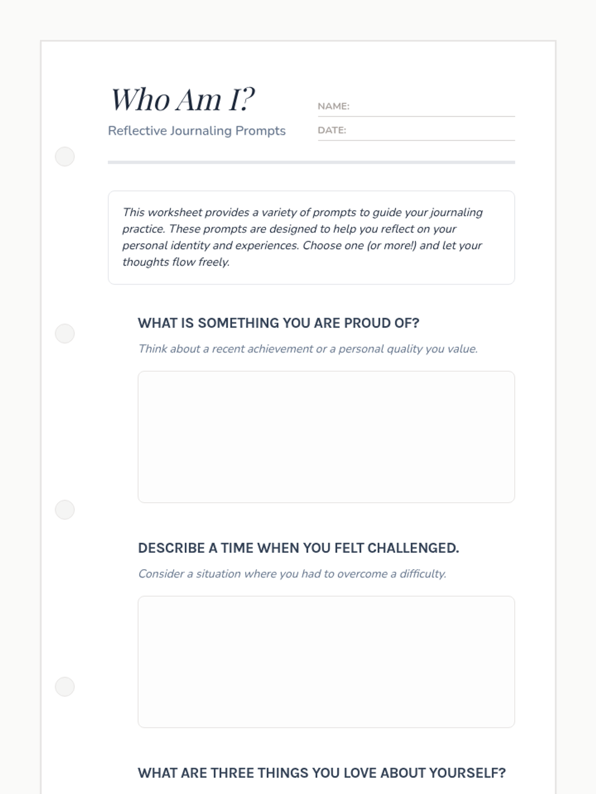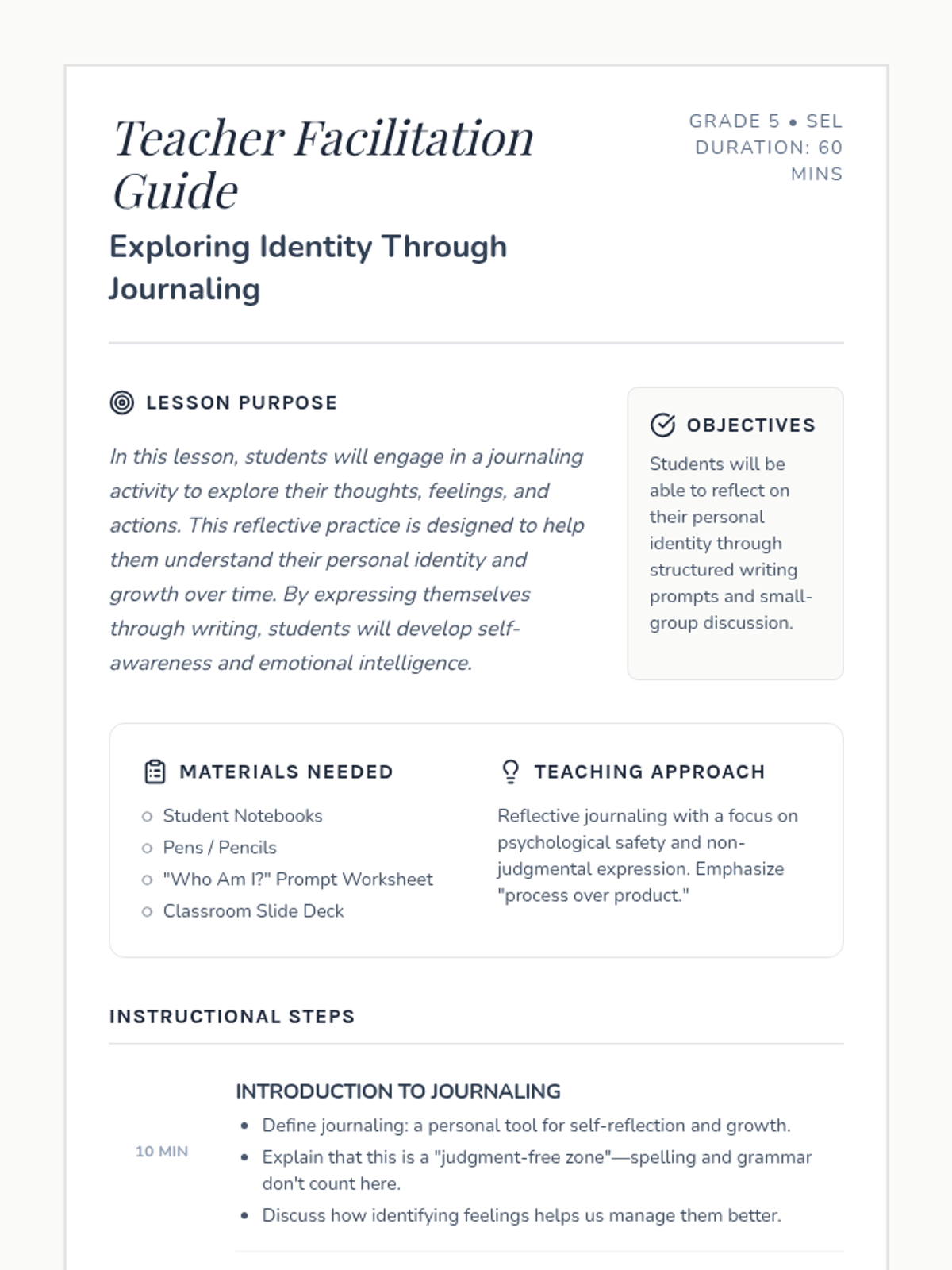 A lesson focused on self-reflection and emotional intelligence, where 5th-grade students use journaling to explore their personal identities, achievements, and future goals.