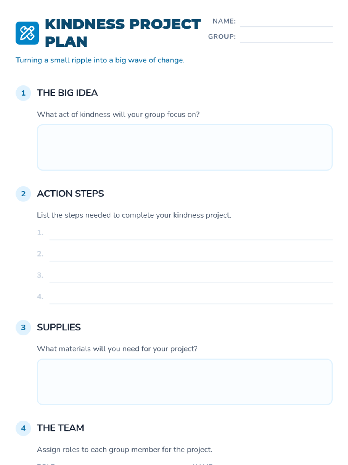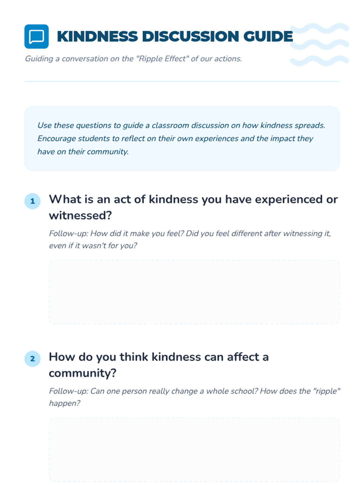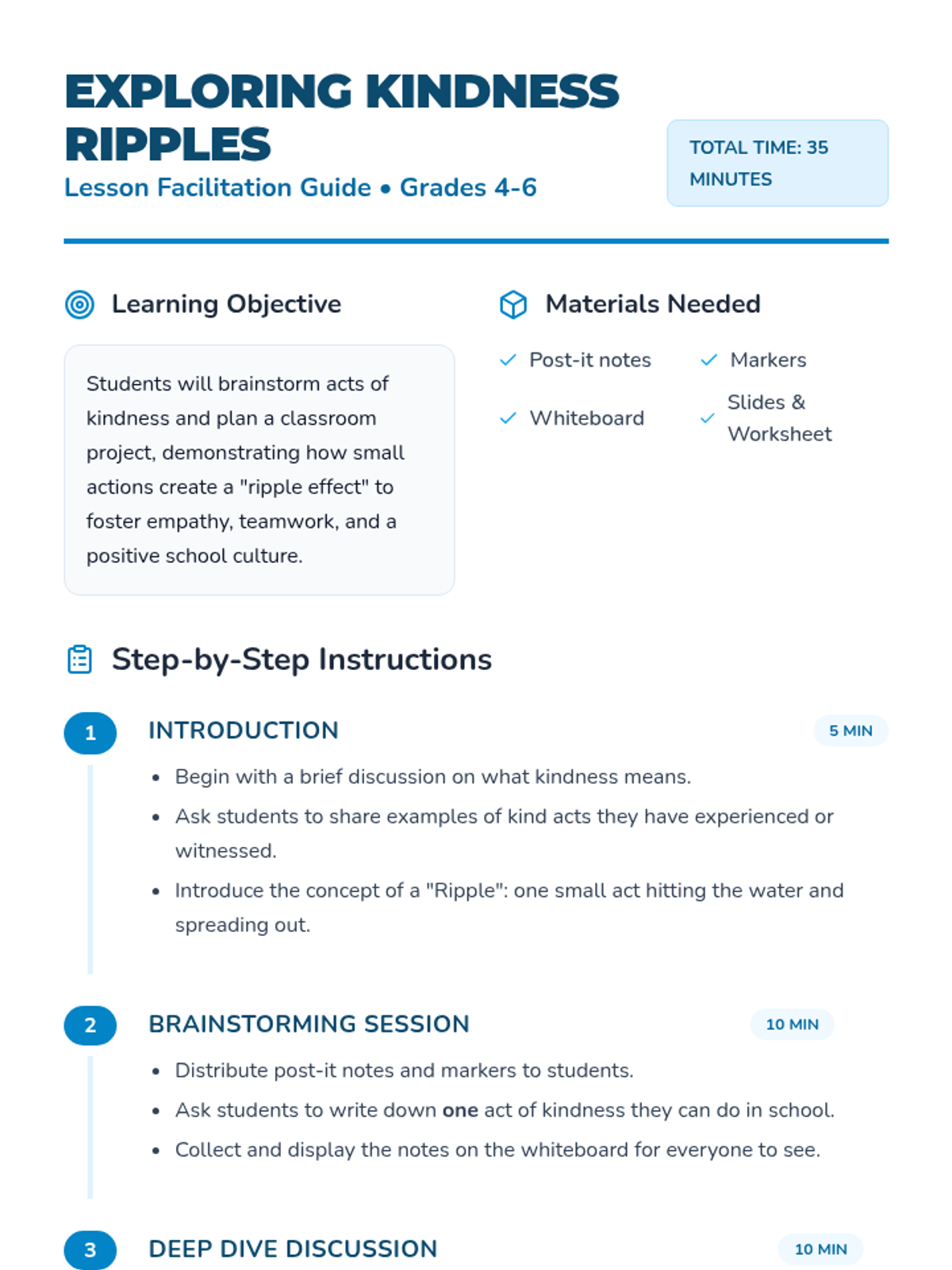 A lesson where students explore the concept of kindness 'ripples', brainstorm acts of service, and plan a classroom project to foster empathy and community.