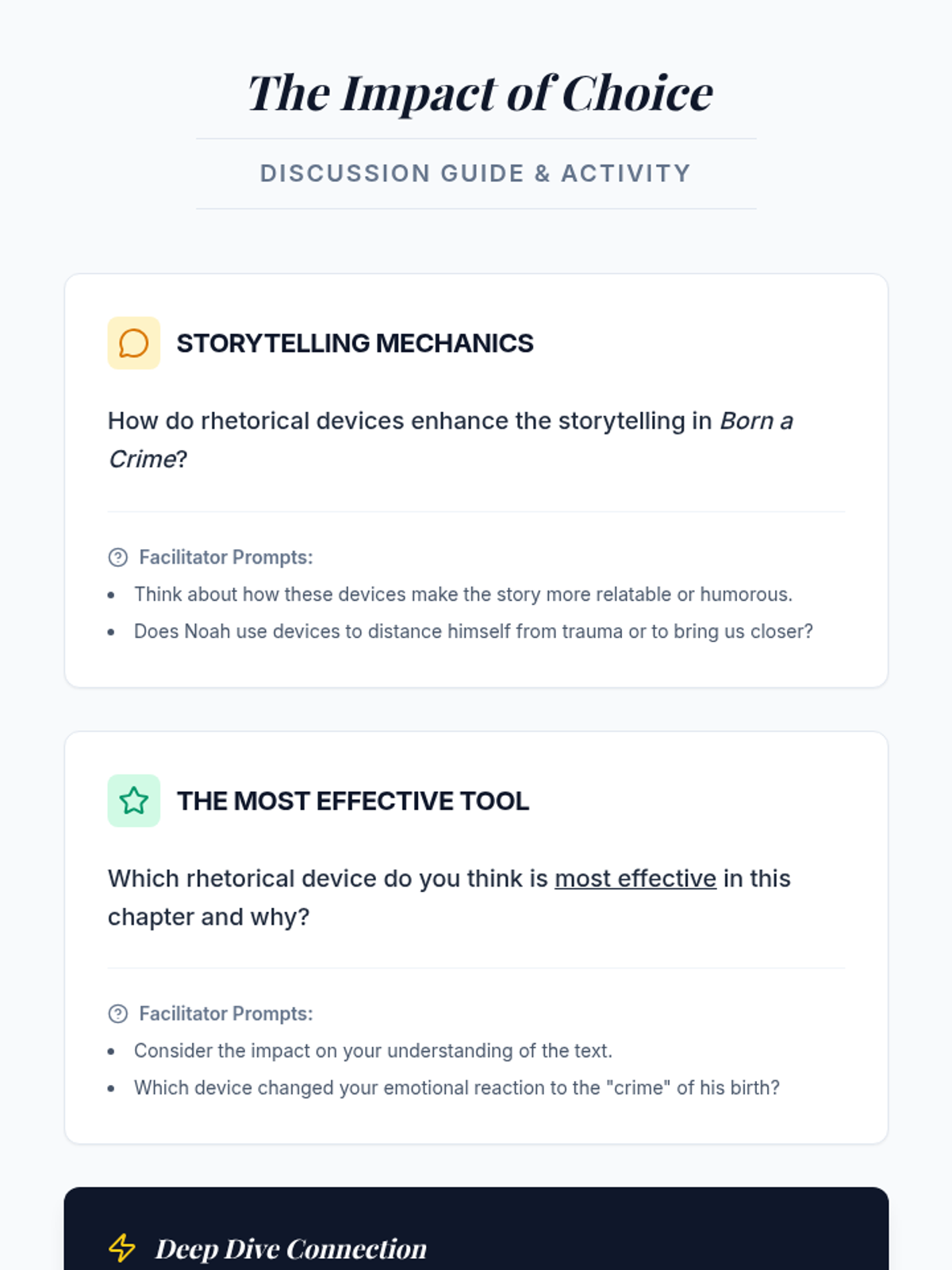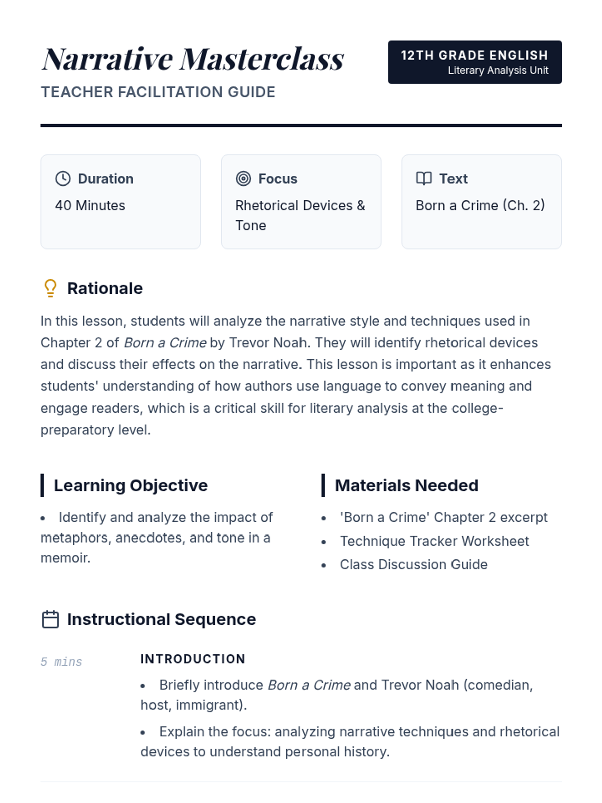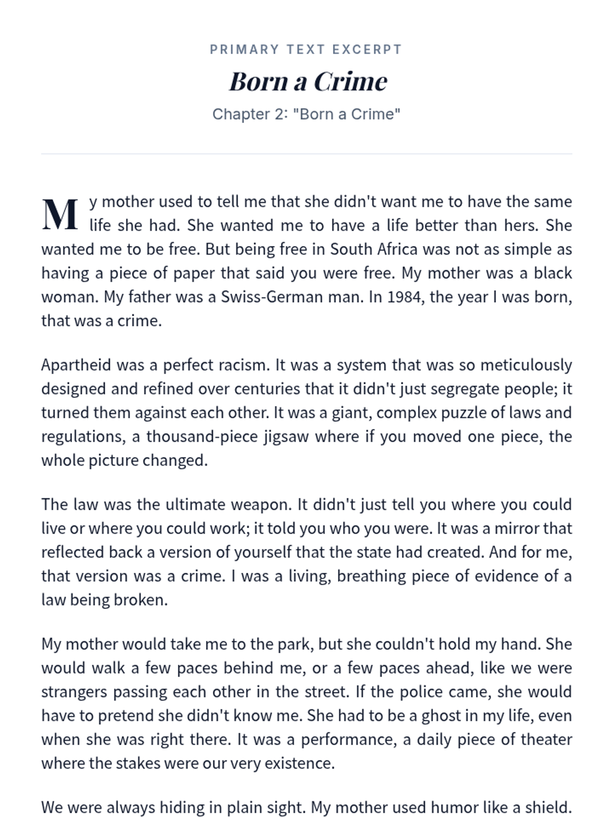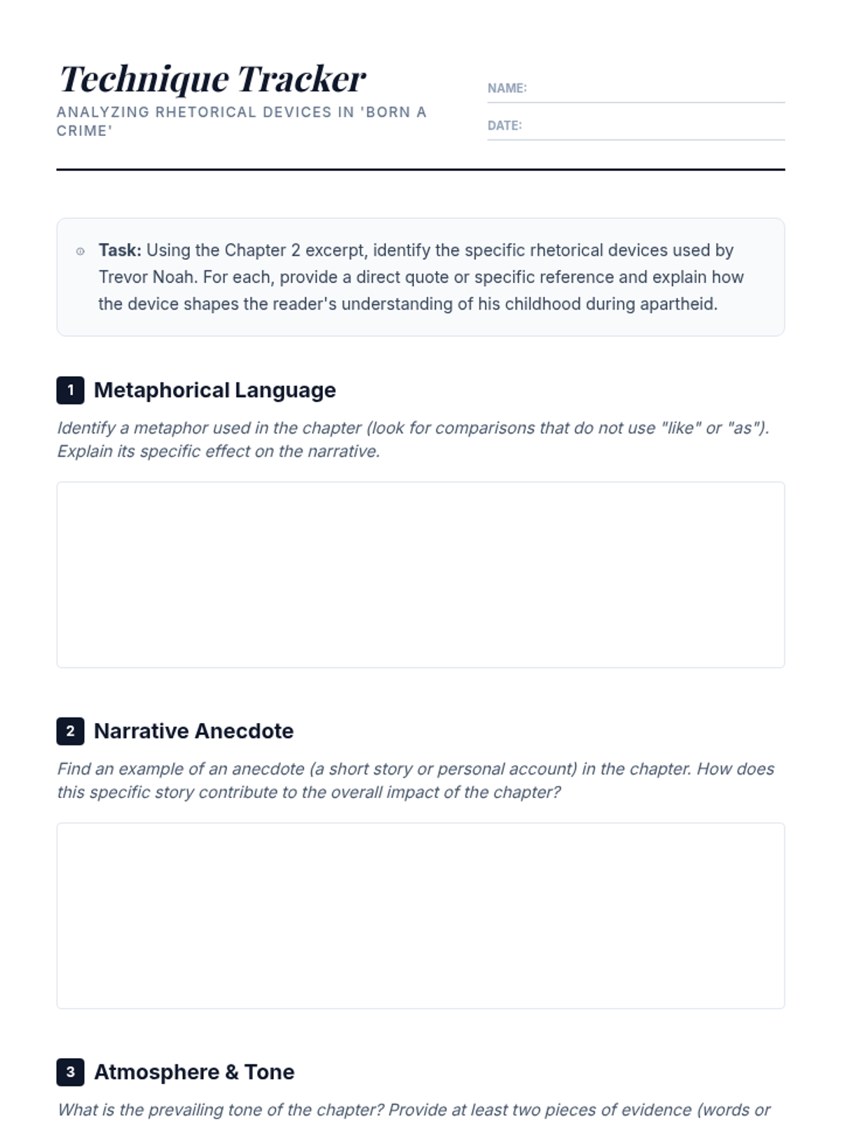 Students analyze the narrative style and rhetorical devices in Chapter 2 of Trevor Noah's 'Born a Crime' to understand how language shapes identity and story.