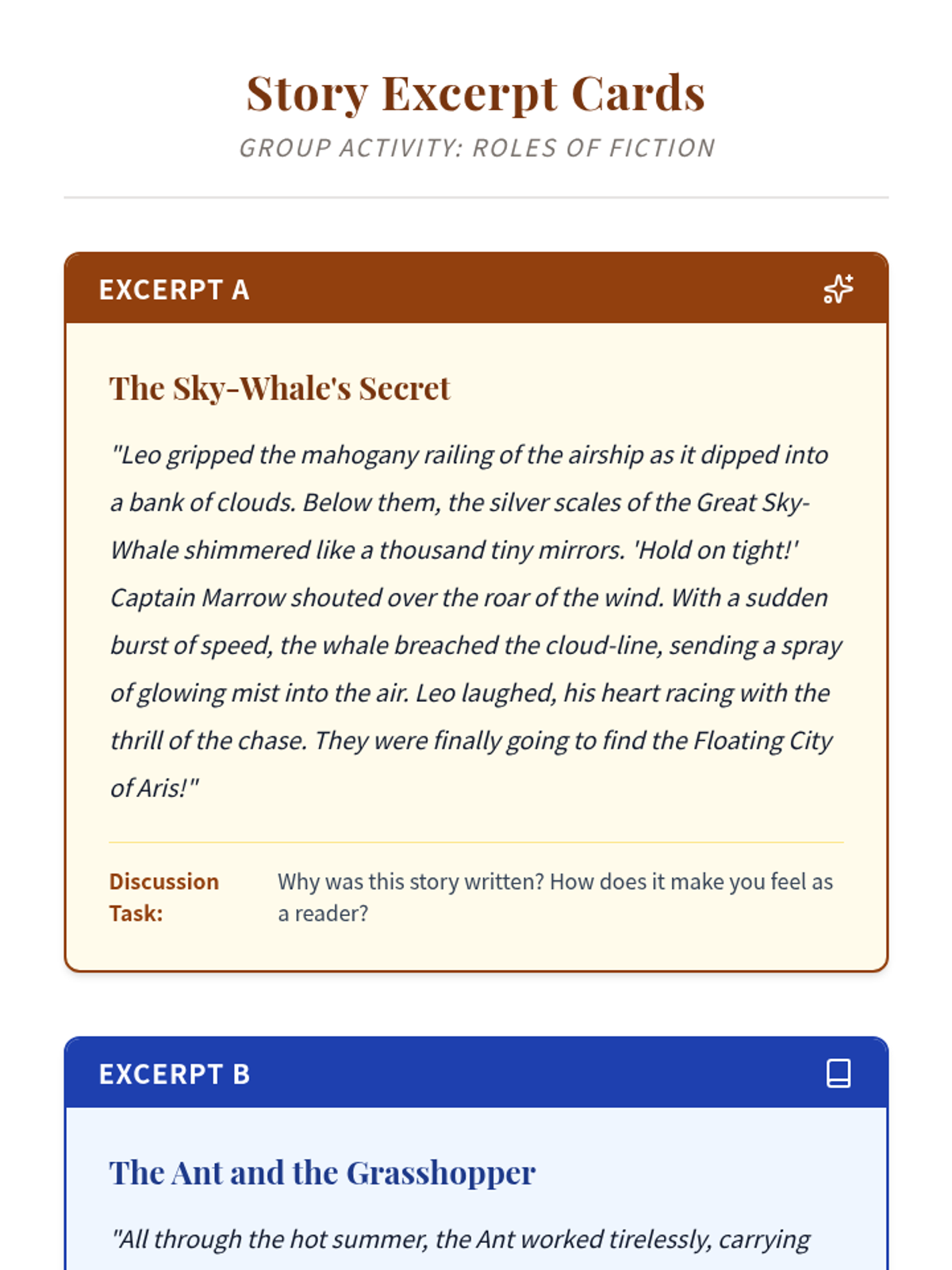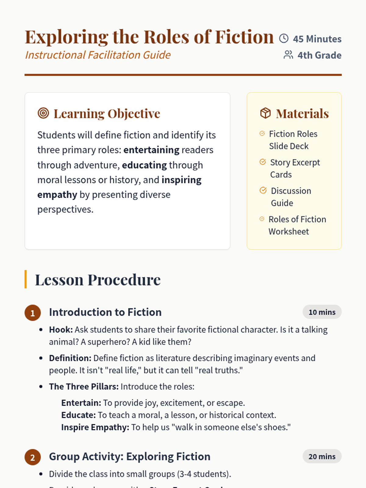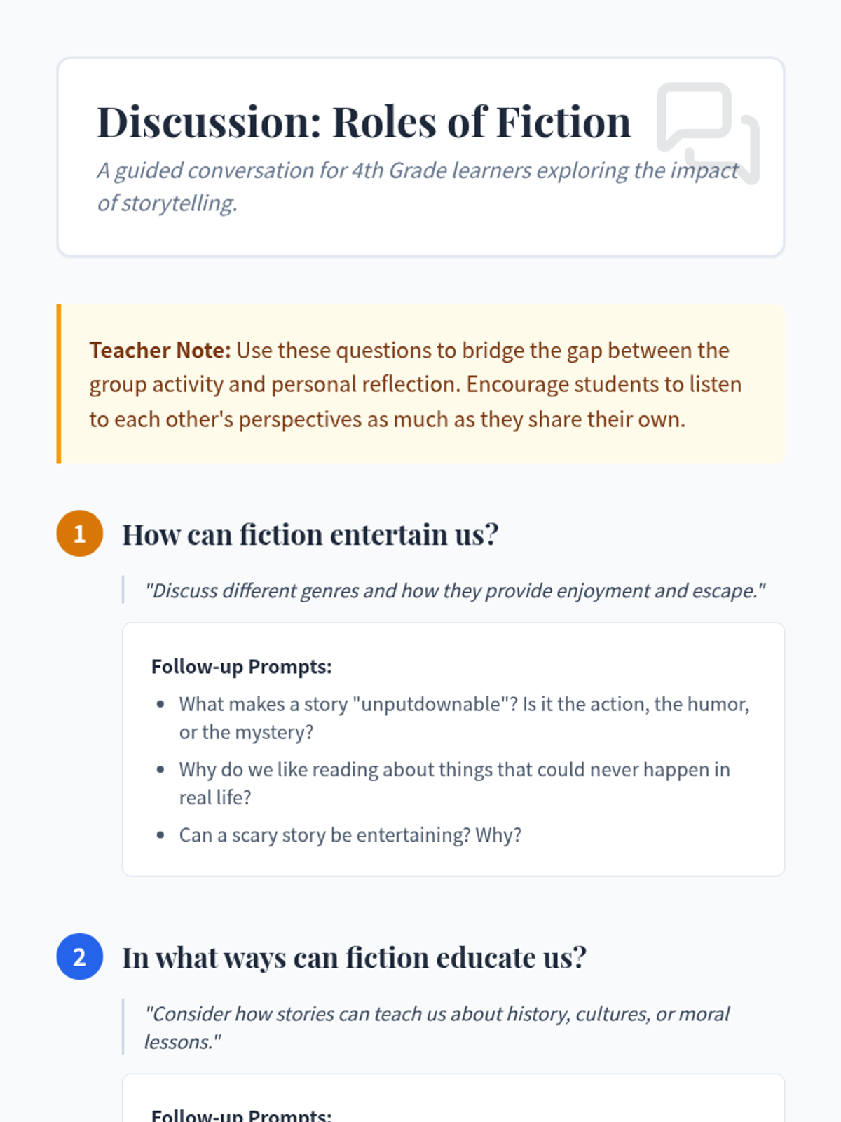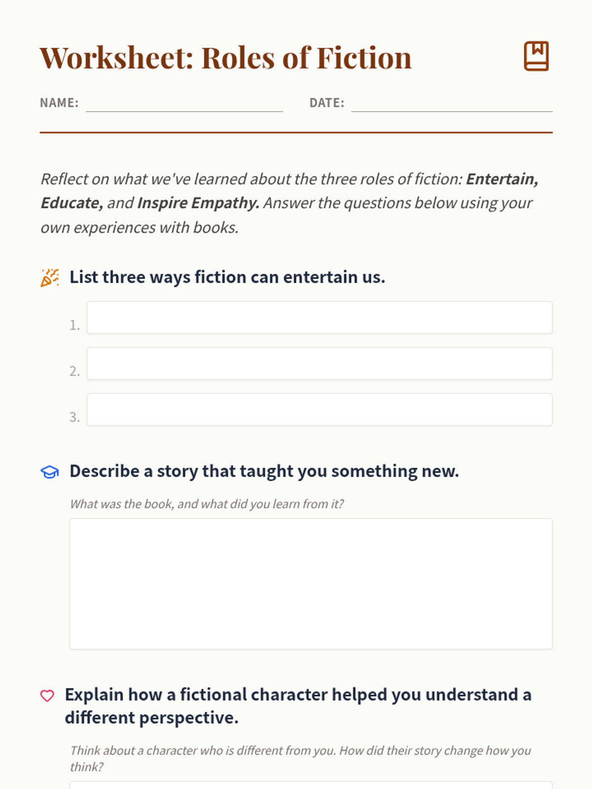 Students explore the three primary roles of fiction: to entertain, to educate, and to inspire empathy. Through story excerpts and group discussion, 4th graders learn how imaginary worlds impact our real-world perspectives.