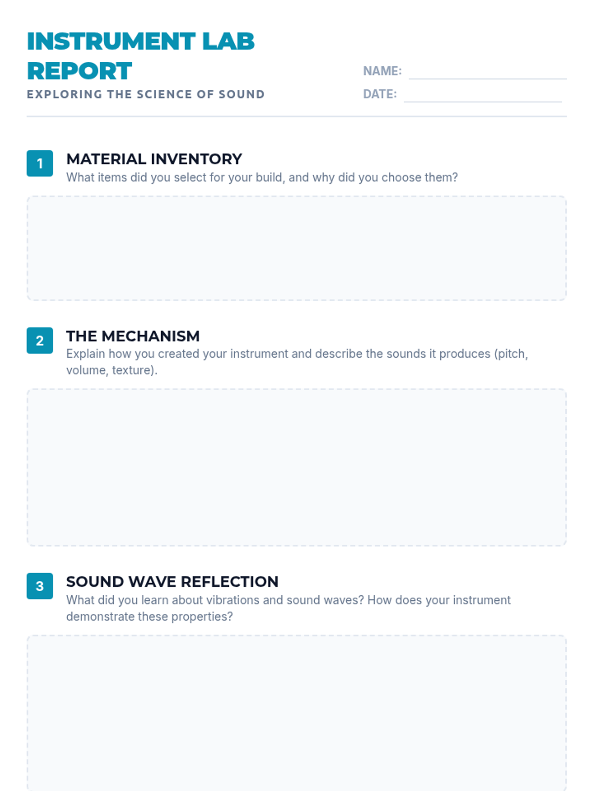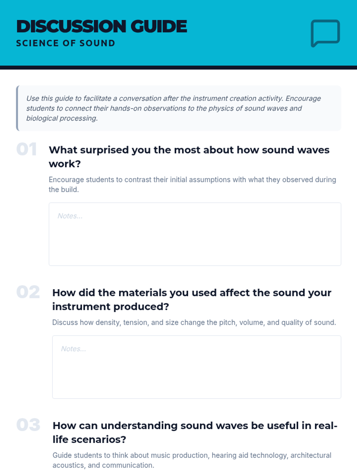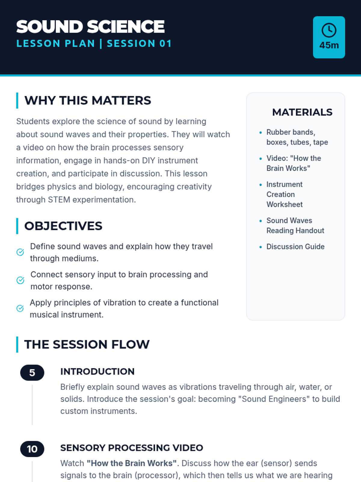Students explore the physics of sound waves, experiment with vibration through DIY instrument creation, and learn how the brain processes auditory signals.