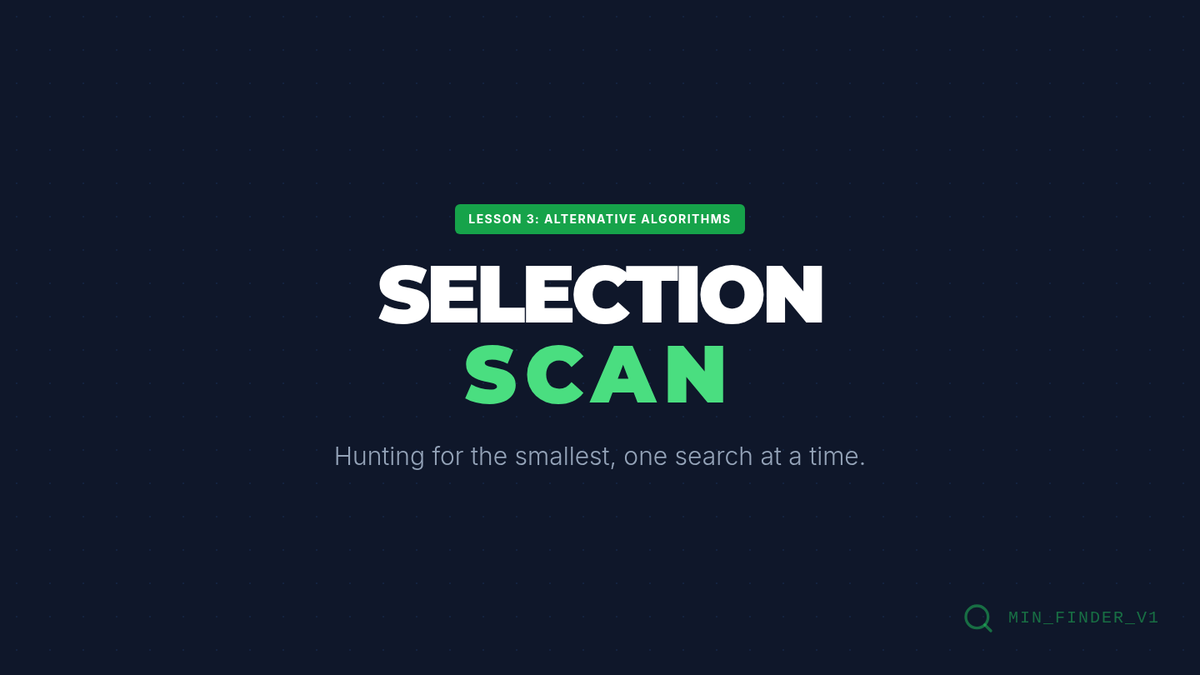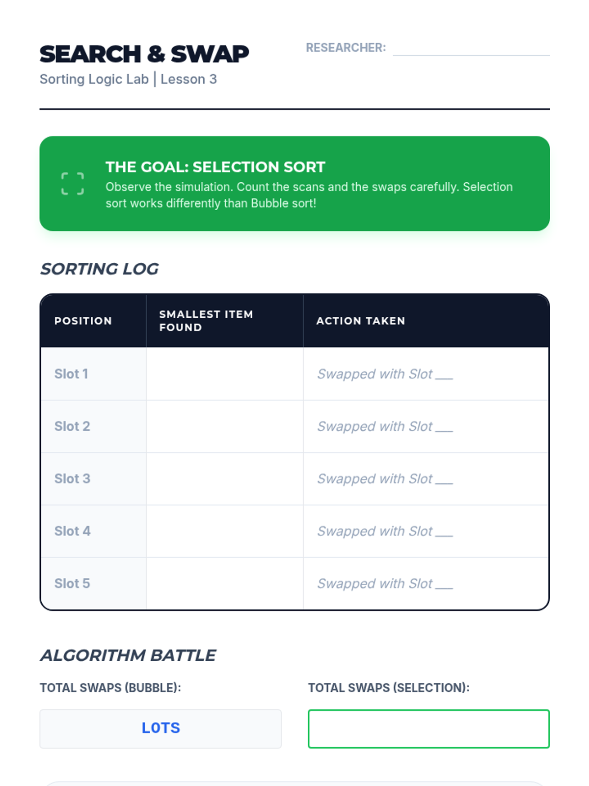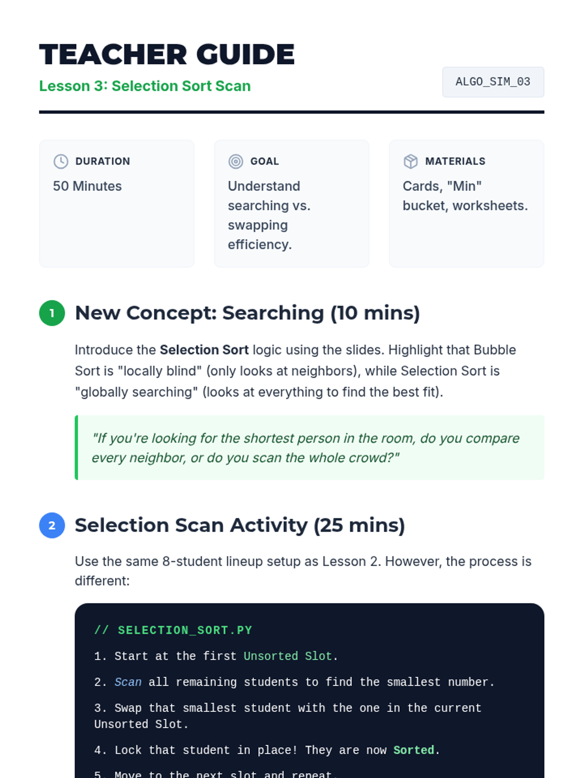 Students learn the Selection Sort method, comparing its 'search and move' logic to the neighbor-swapping approach of Bubble Sort.