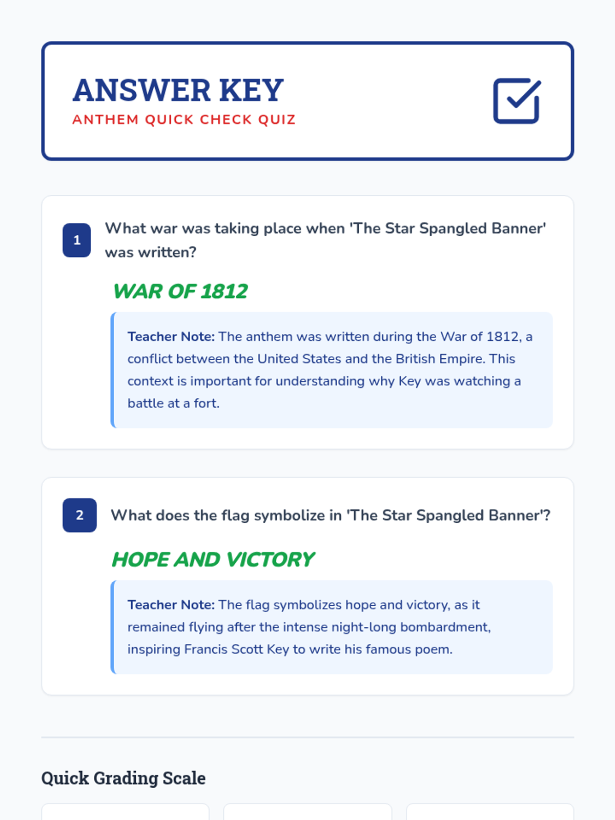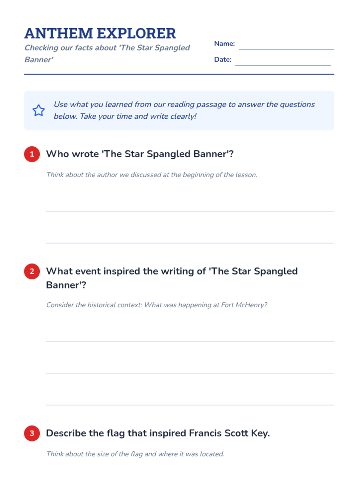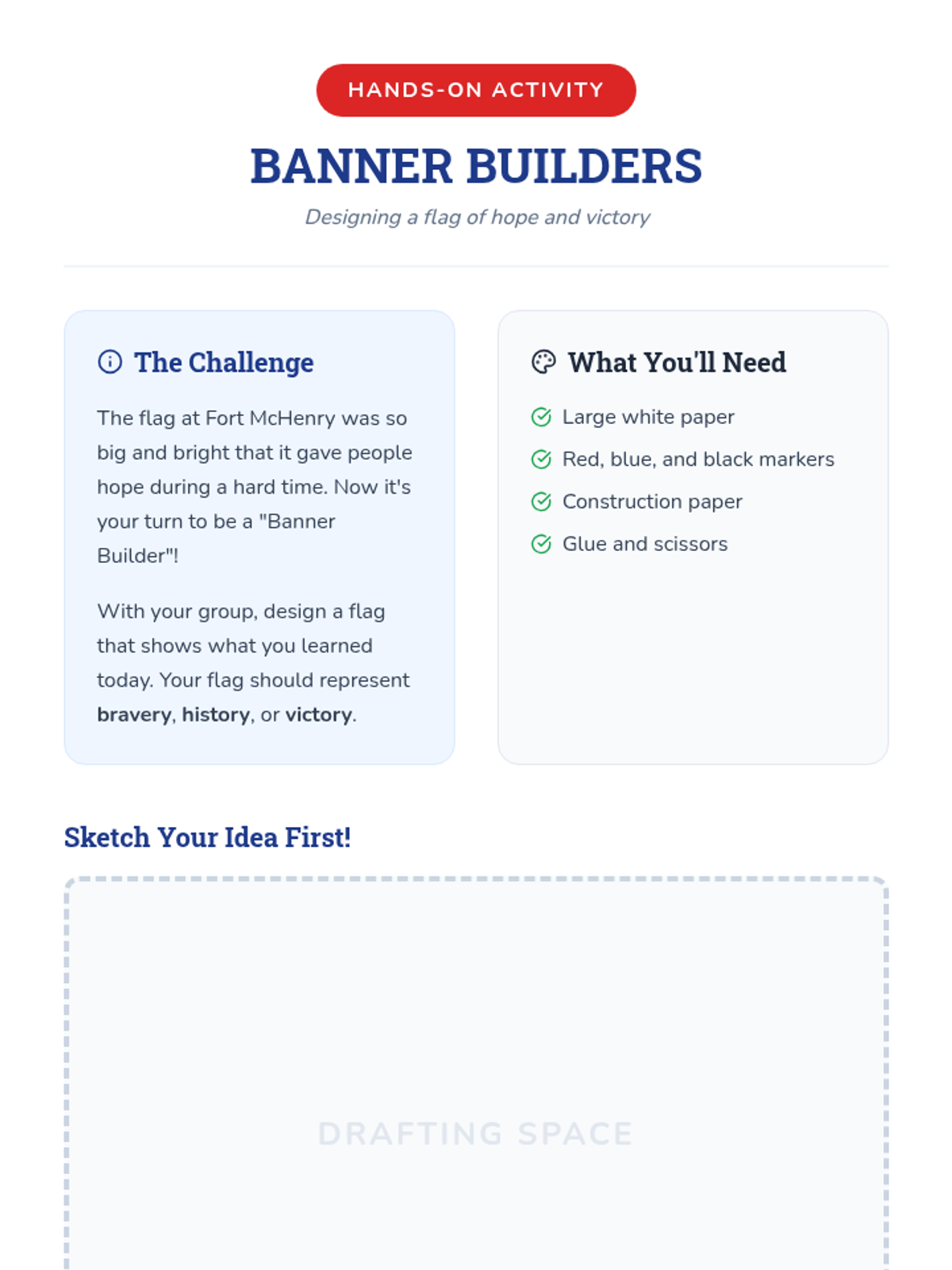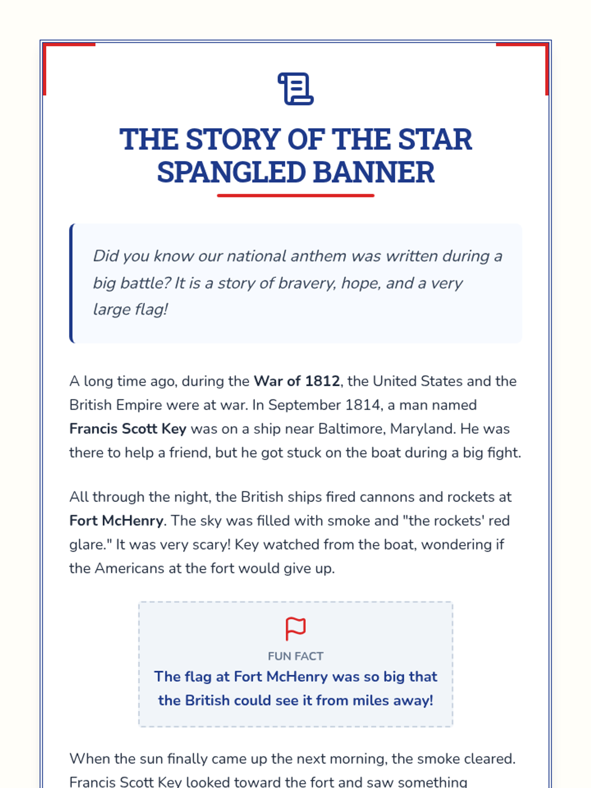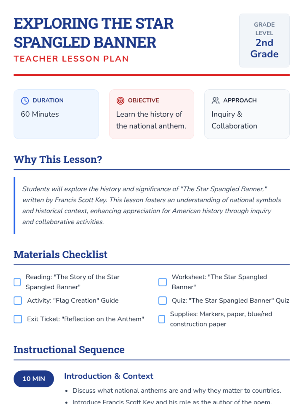 In this lesson, 2nd-grade students will explore the history and significance of 'The Star Spangled Banner,' written by Francis Scott Key. Through inquiry-based and collaborative learning activities, students will engage with the story behind the anthem and its connection to the American flag at Fort McHenry.