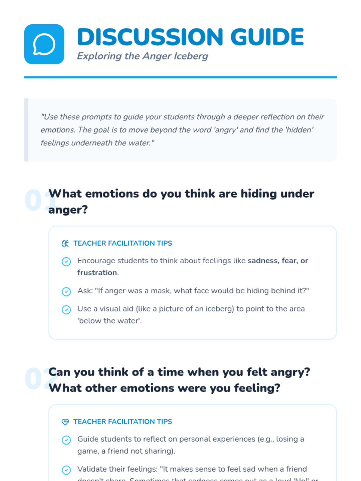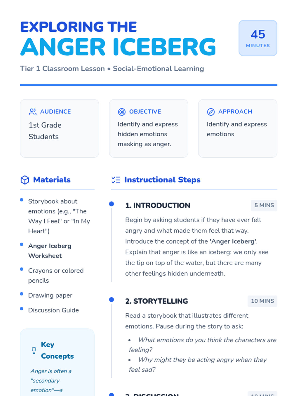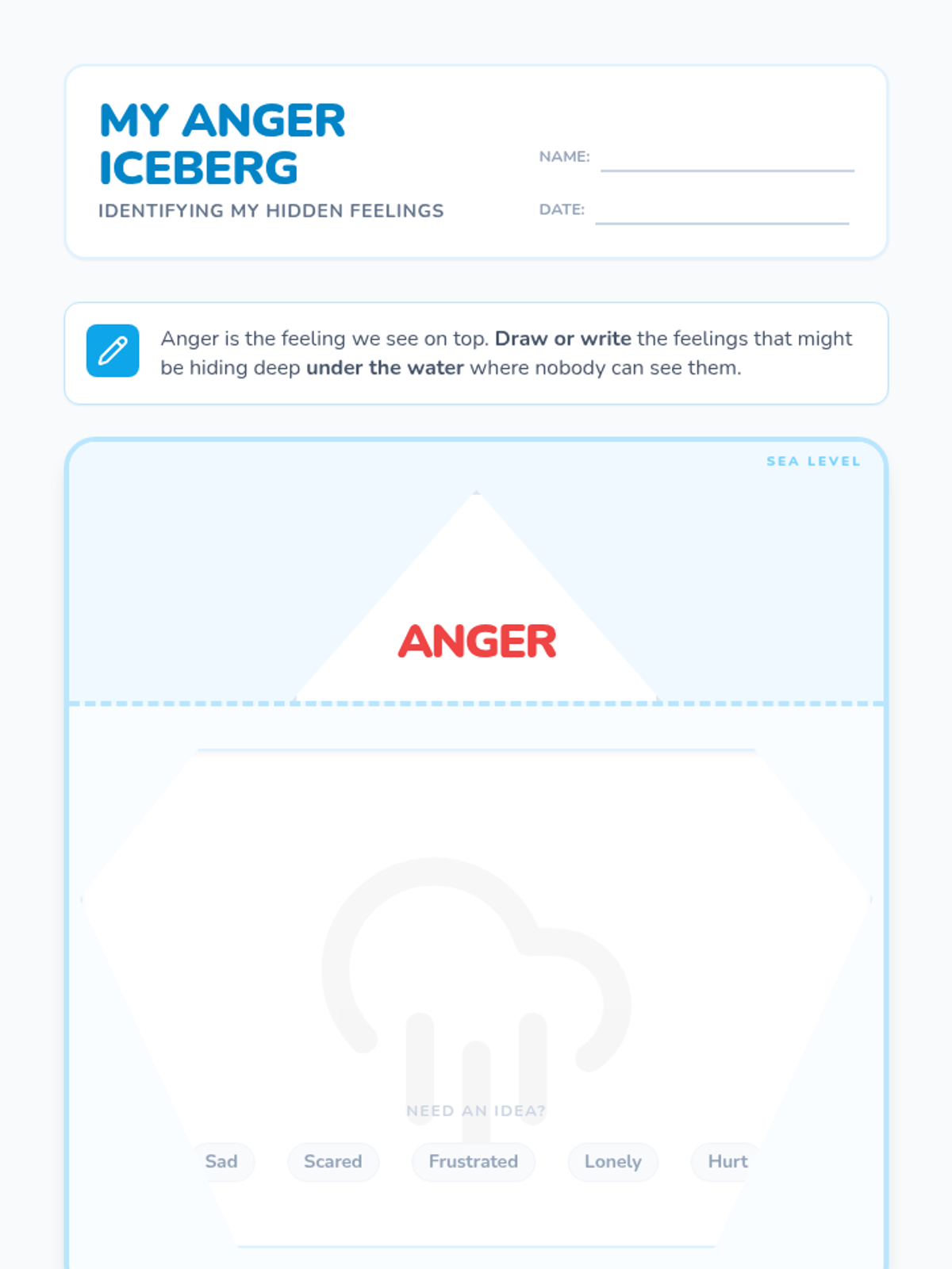 Students will explore the concept of the 'Anger Iceberg,' learning that anger often masks other emotions like sadness, fear, or frustration. through storytelling and drawing, they identify and express these hidden feelings to build emotional awareness.