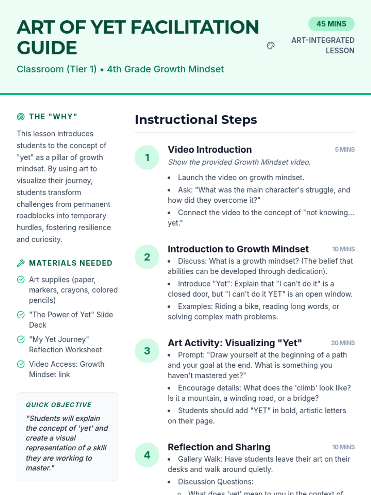 A 45-minute lesson for 4th graders that uses art to teach the concept of a growth mindset and the 'power of yet.' Students will visualize their own learning journeys and reflect on challenges as opportunities for future mastery.