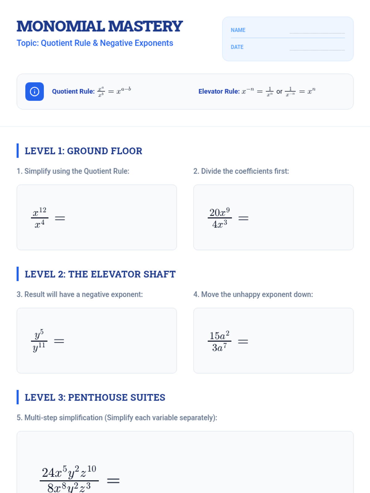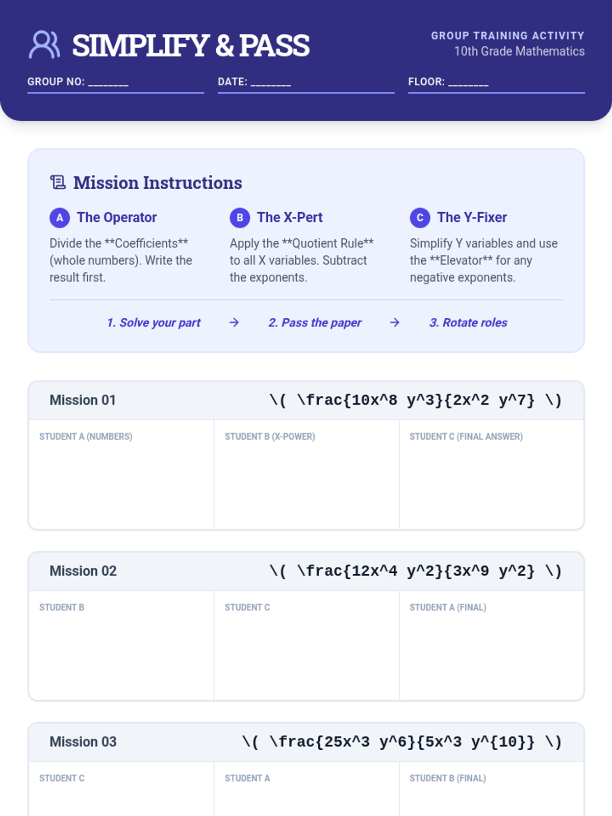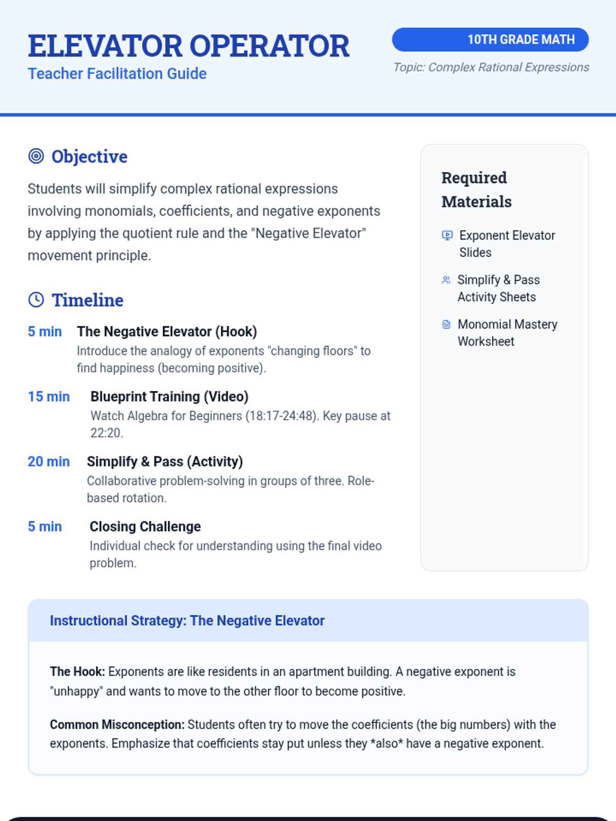 A high-energy lesson on simplifying complex rational expressions with monomials and negative exponents using the 'Negative Elevator' analogy and a collaborative 'Simplify & Pass' activity.