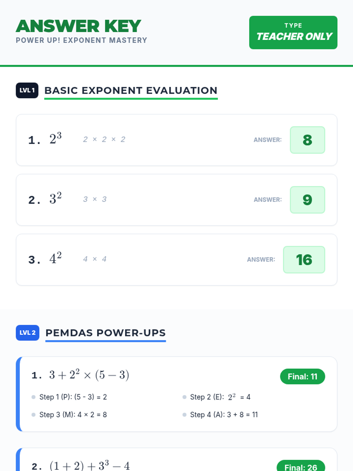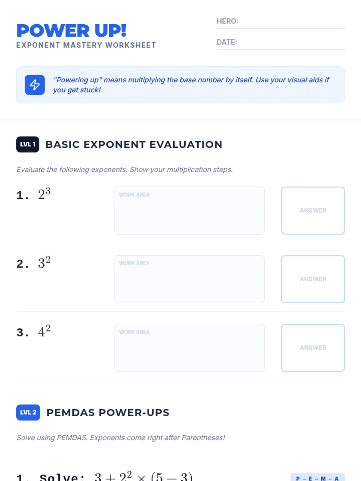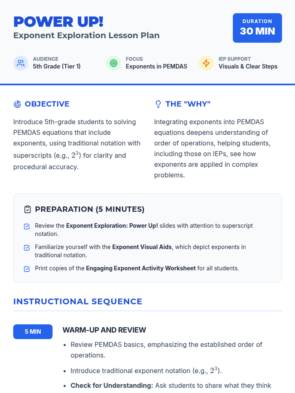A 30-minute introductory lesson on exponents for 5th graders, focusing on superscript notation and PEMDAS integration with an engaging 'Power Up' theme.