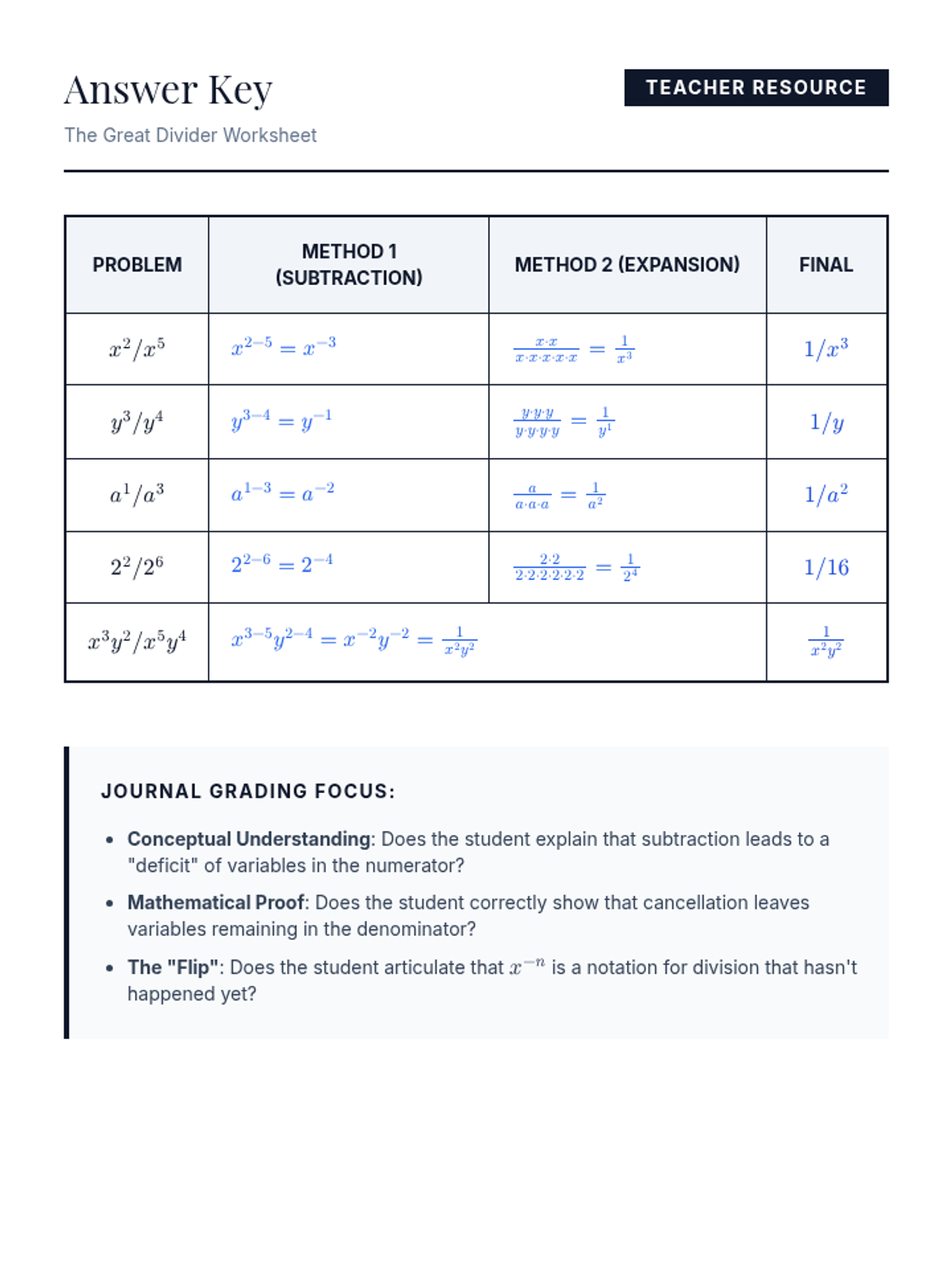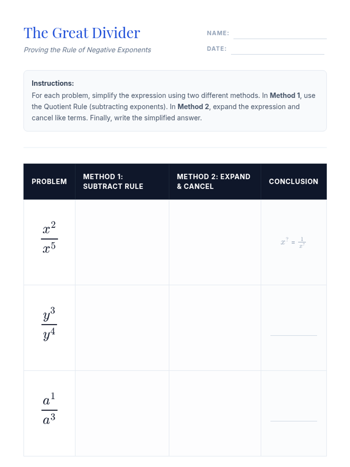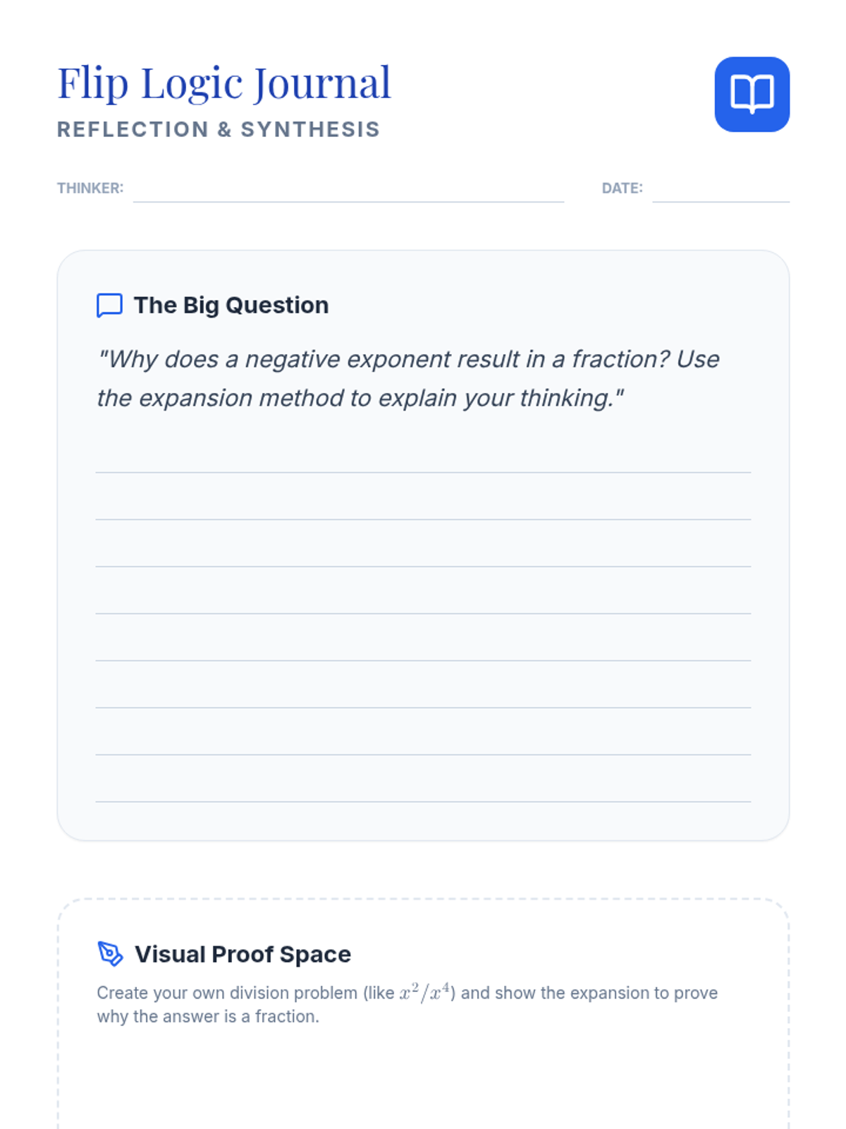 A conceptual algebra lesson exploring the relationship between negative exponents and fractions through pattern discovery, visual proofs, and the expansion method.