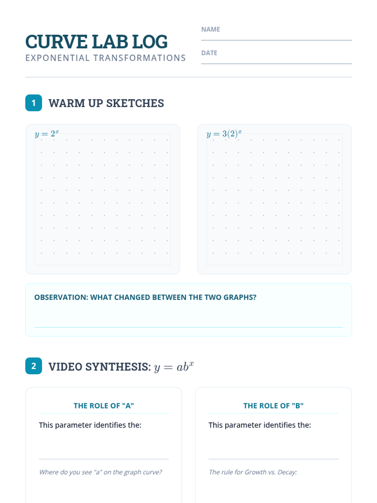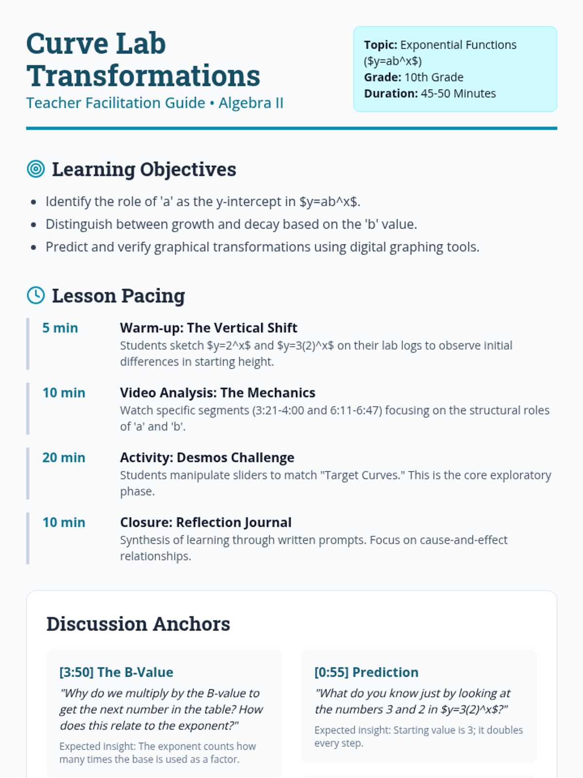 A 10th Grade Algebra II lesson exploring how the parameters 'a' and 'b' in the exponential equation y=ab^x influence the graph's y-intercept and growth/decay rate. Students use a mix of video analysis and a hands-on Desmos graphing challenge to master transformations.