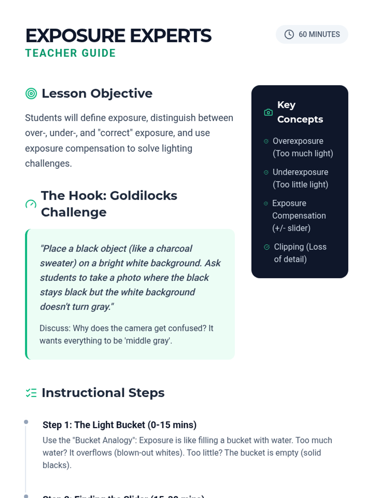 Students explore over- and underexposure, using camera tools to achieve 'correct' exposure and intentional artistic effects.