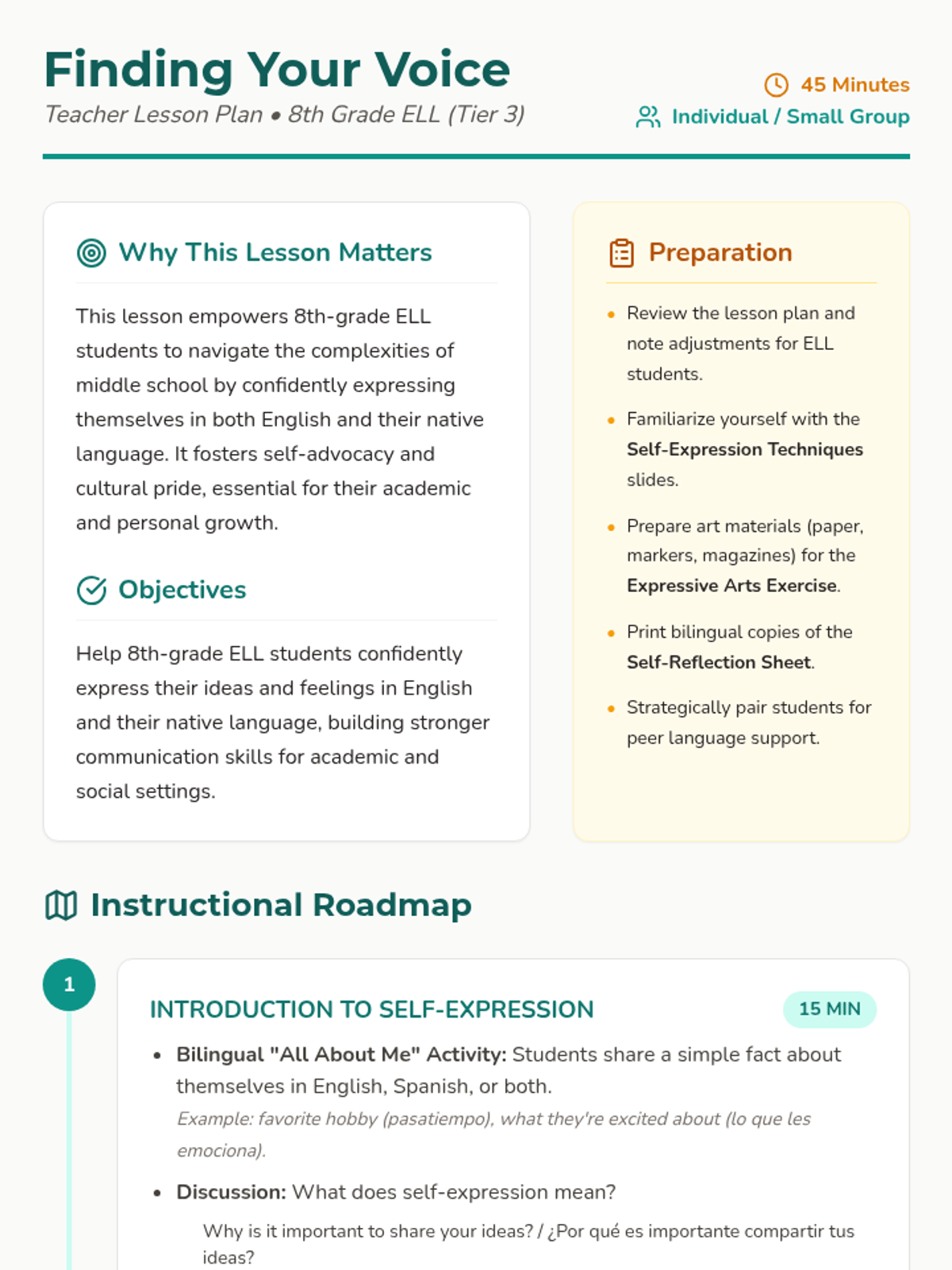 This lesson supports 8th-grade ELL students in finding their voice and effectively expressing themselves through bilingual instruction and expressive arts. It focuses on building self-confidence and clarity in communication within a Tier 3 intervention context.