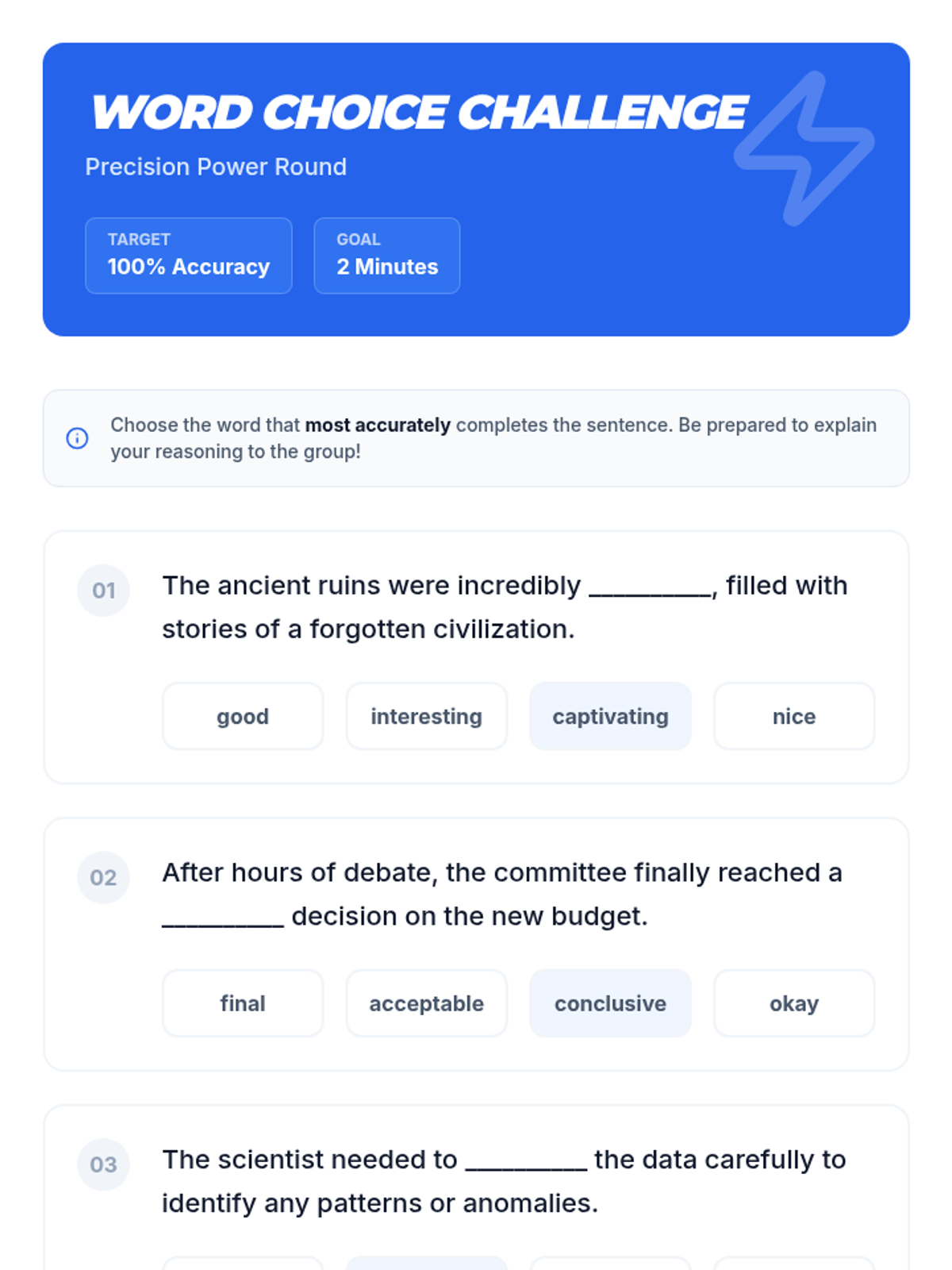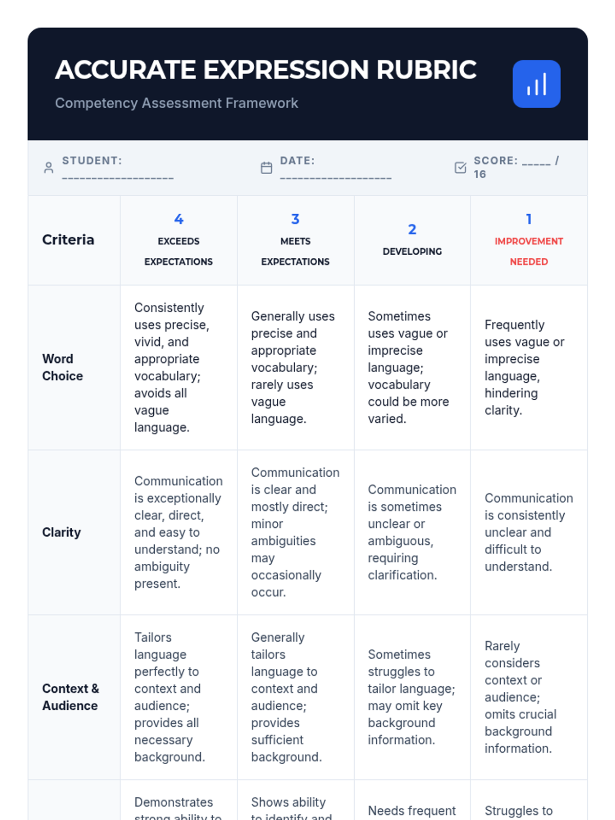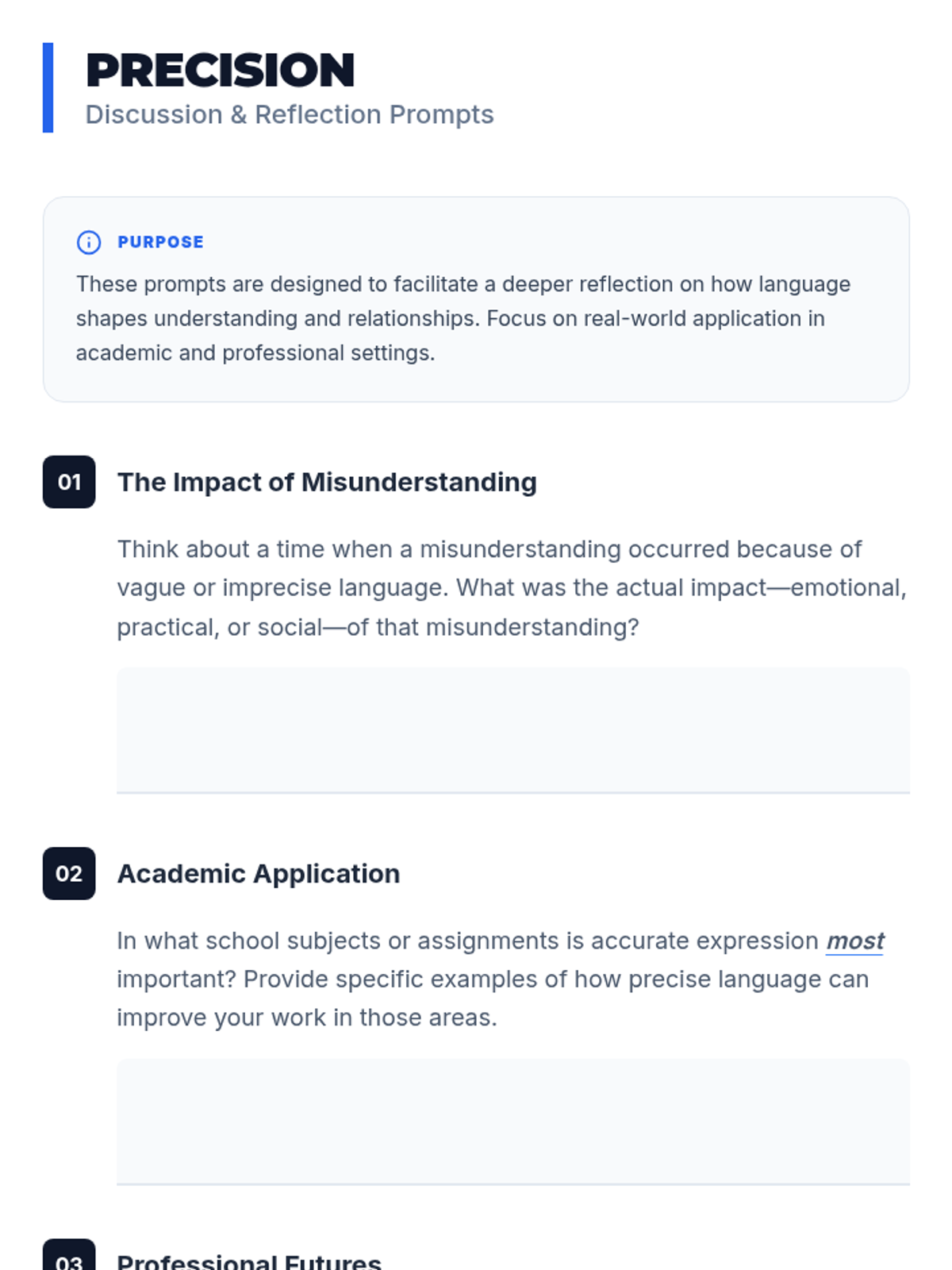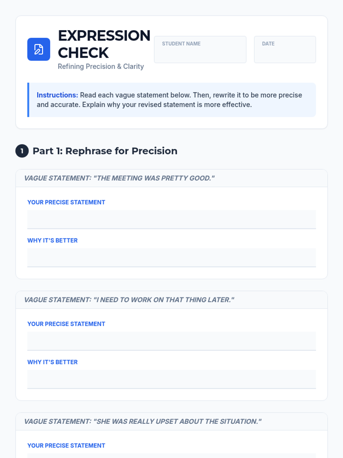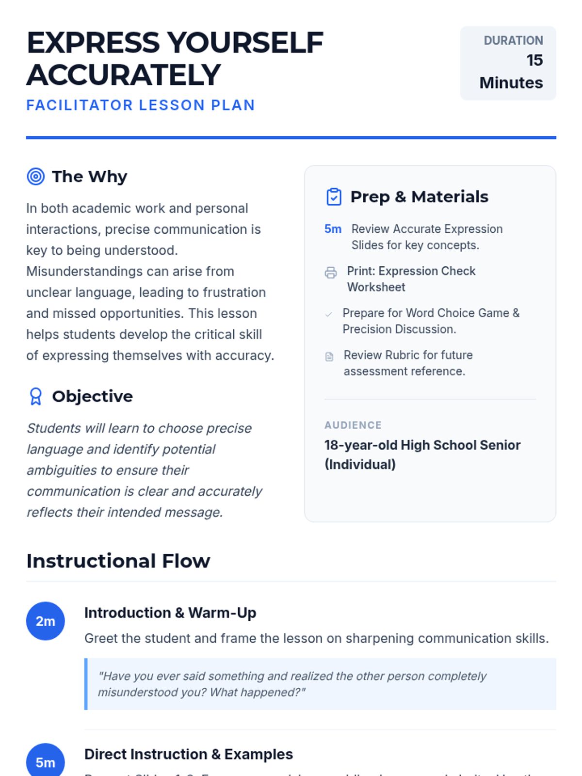 A 15-minute individualized lesson for high school seniors focused on refining communication through precise word choice and clarity. Students engage in direct instruction, guided rephrasing, and reflective discussion to minimize misunderstandings.